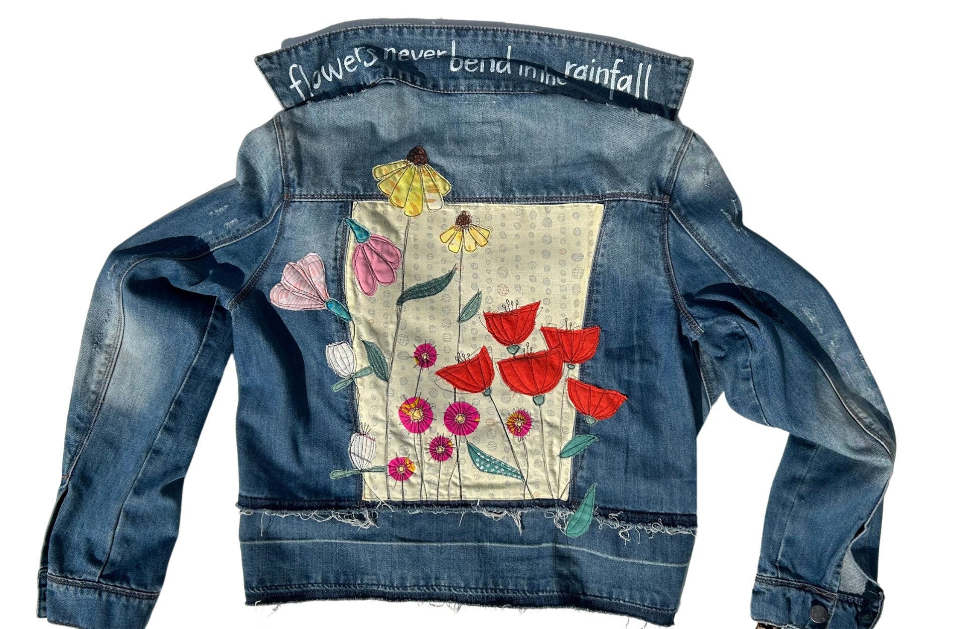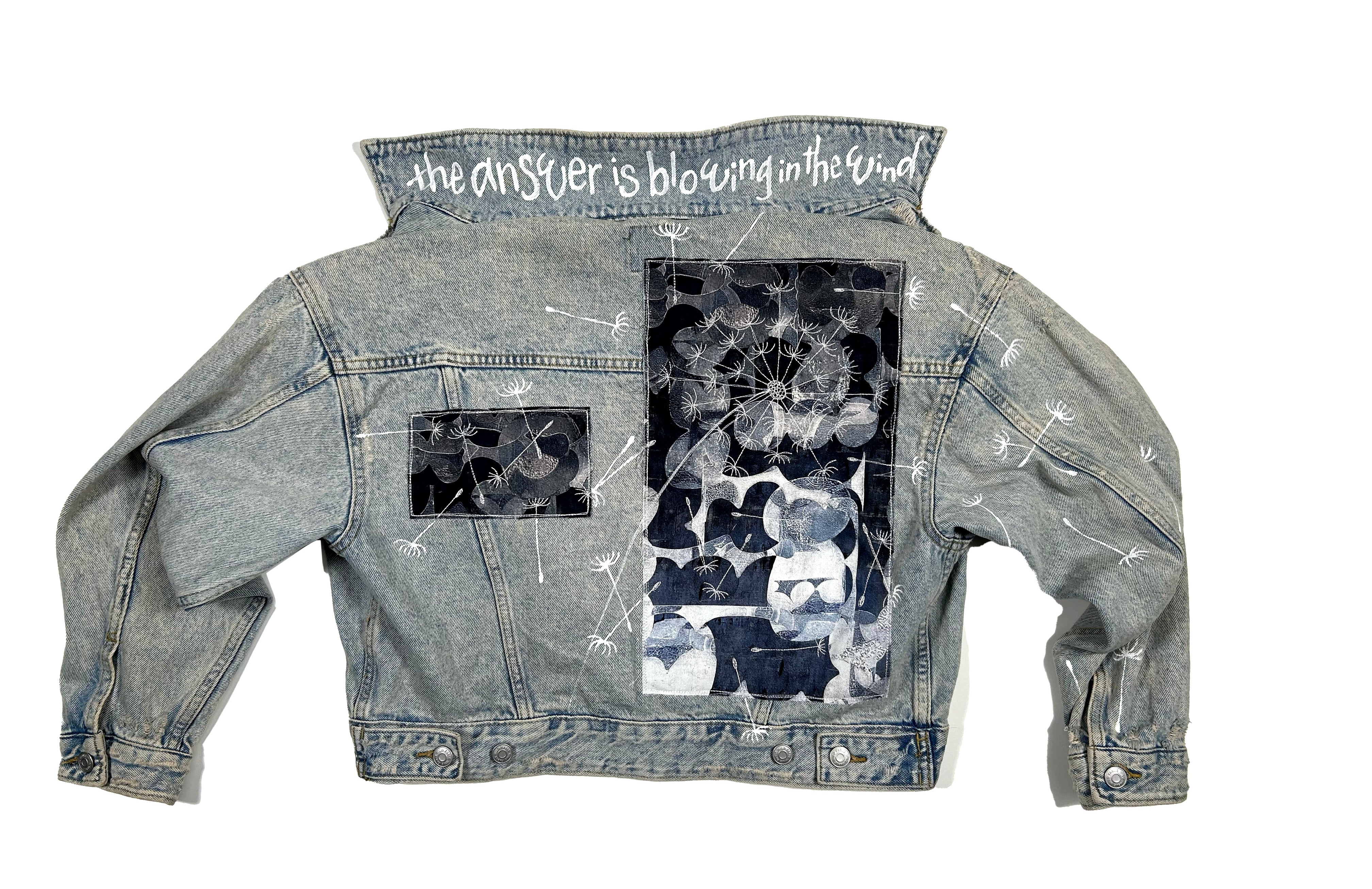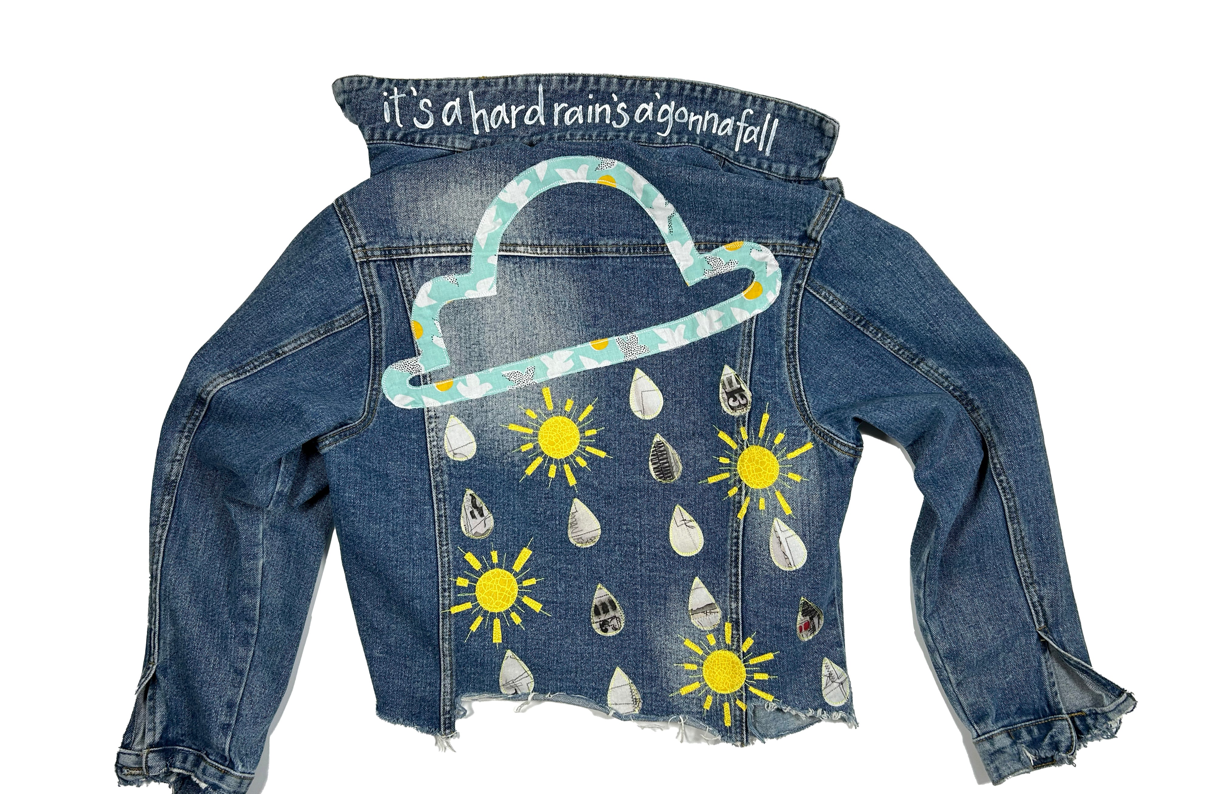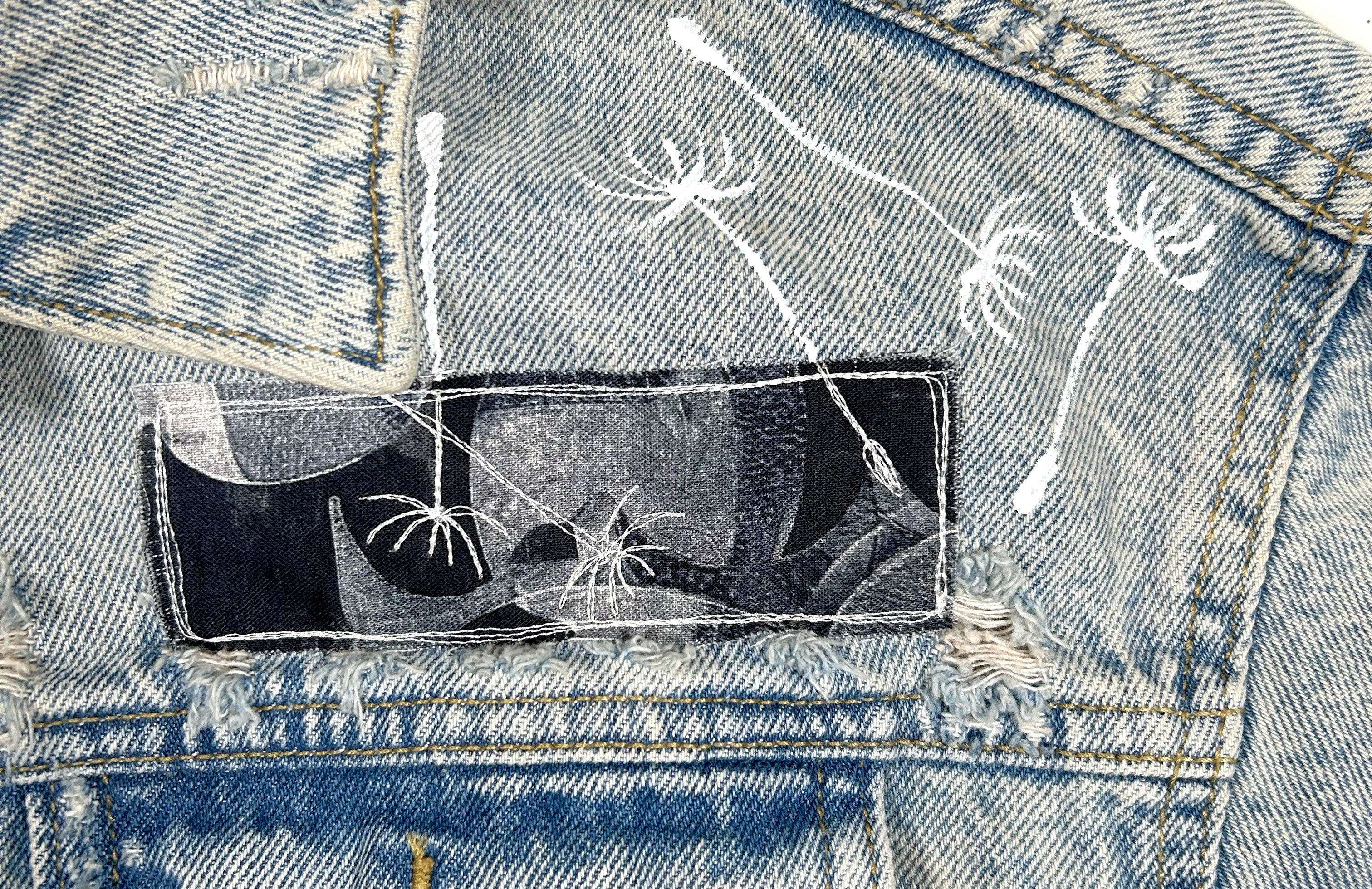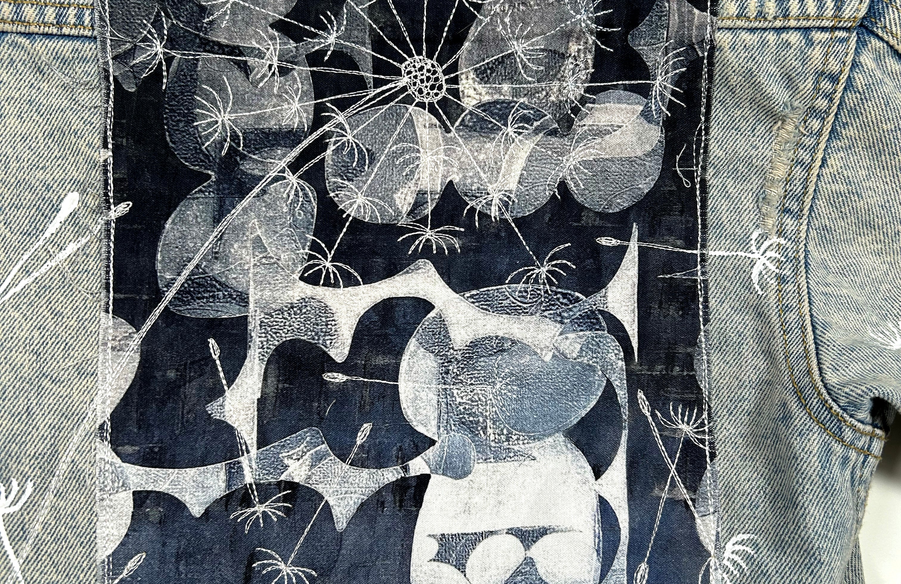 This is an upcycled cropped Levi Strauss denim jacket in a size XS. It is a medium to dark wash and has some decorative pleating in the front. It is a relaxed crop fit; 79% cotton, 21% lyocell, and has button closure. There are two top load pockets. The back back panel has machine appliqué graffiti that reads 'everyday i'm hustlin' made up of various quilt shop quality cottons. A popped collar reveals the phrase ' whip it real hard' (Rick Ross) in a modern hand painted font.
