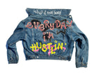 This is an upcycled cropped Levi Strauss denim jacket in a size XS. It is a medium to dark wash and has some decorative pleating in the front. It is a relaxed crop fit; 79% cotton, 21% lyocell, and has button closure. There are two top load pockets. The back back panel has machine appliqué graffiti that reads 'everyday i'm hustlin' made up of various quilt shop quality cottons. A popped collar reveals the phrase ' whip it real hard' (Rick Ross) in a modern hand painted font.