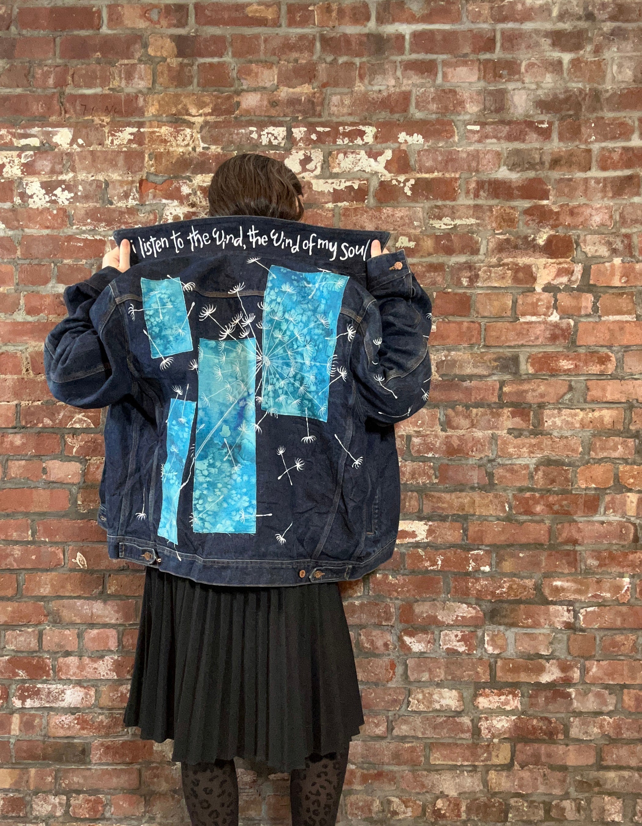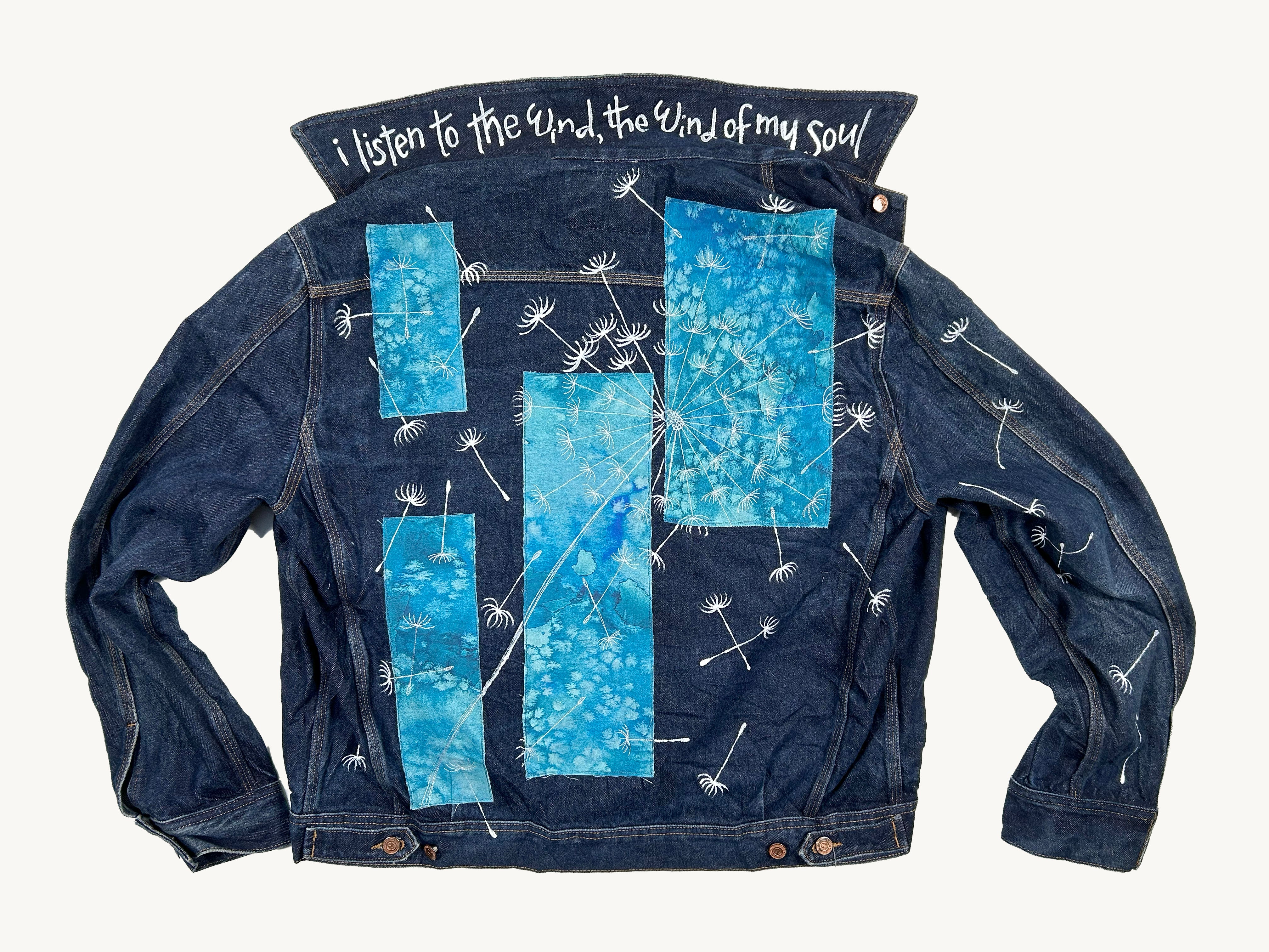 unisex upcycled thread painted denim jacket: dandelion seeds