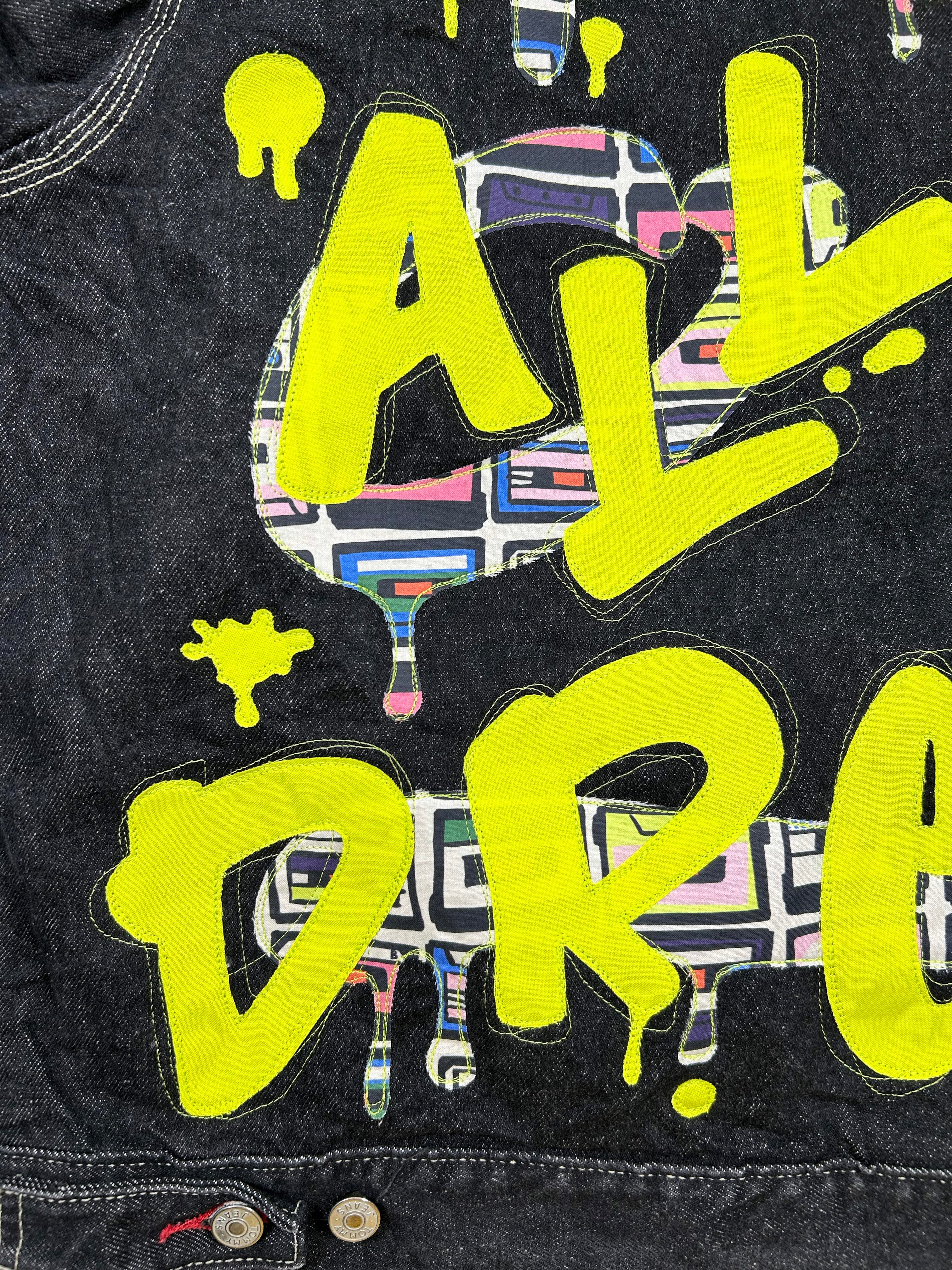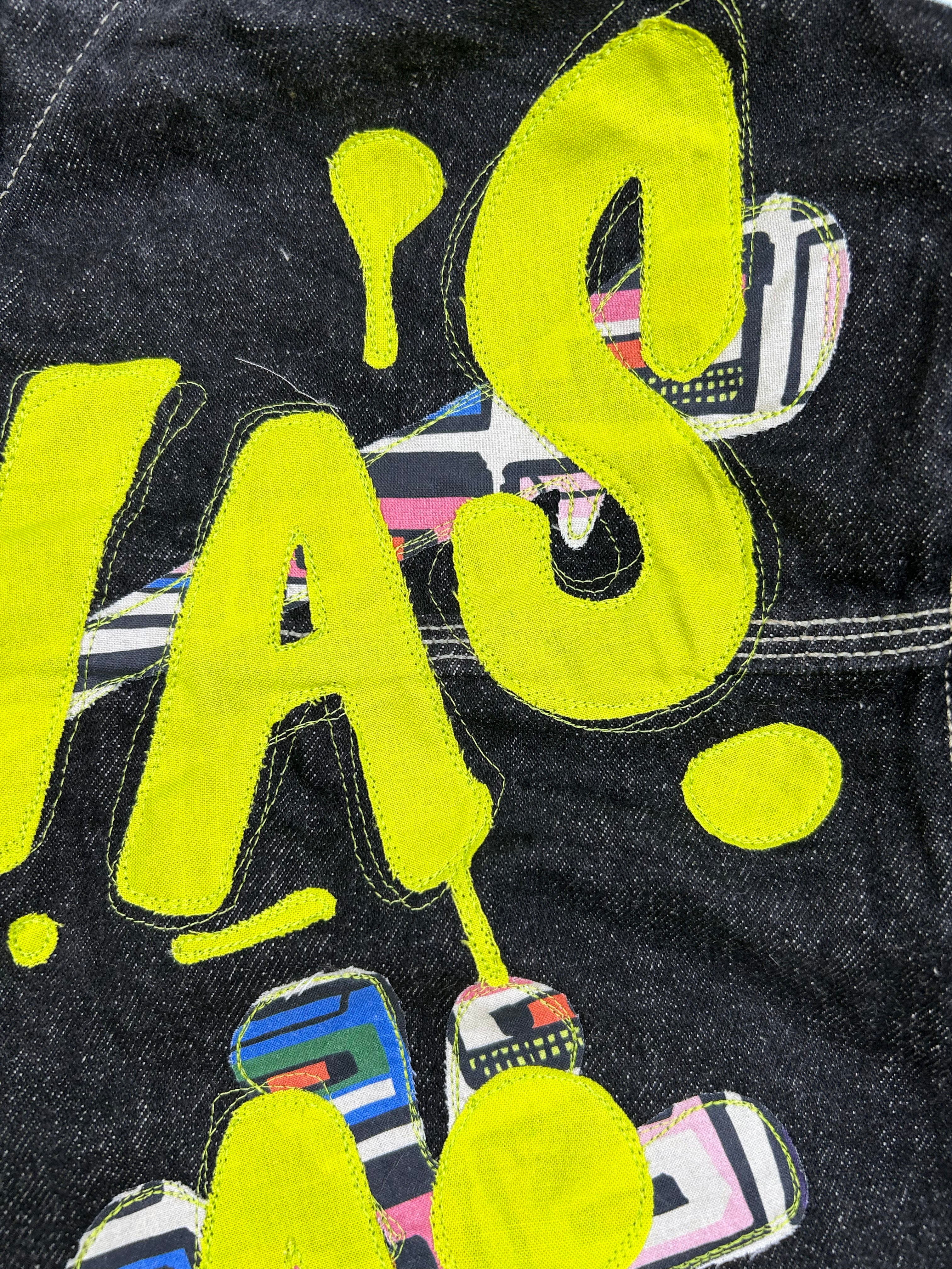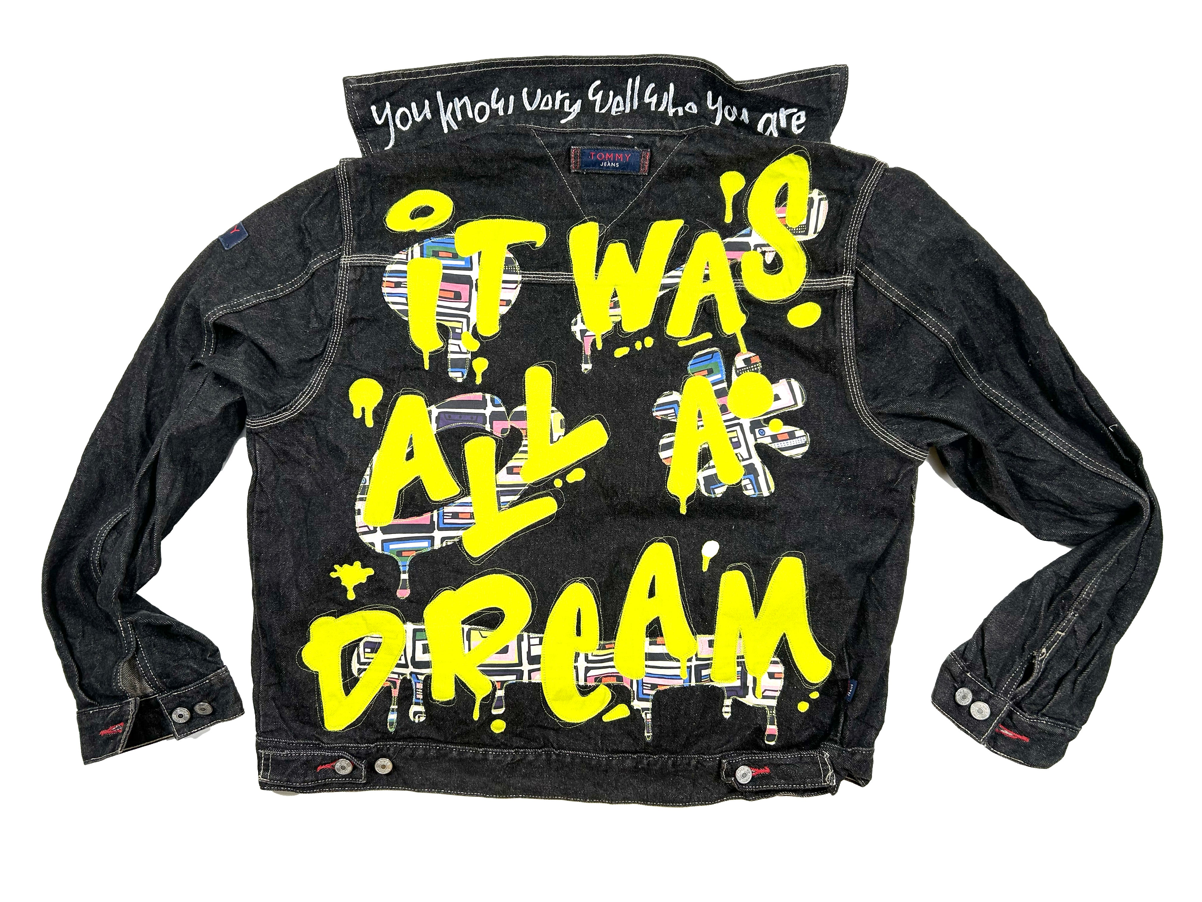 unisex upcycled graffiti style machine appliquéd denim jacket: it was all a dream