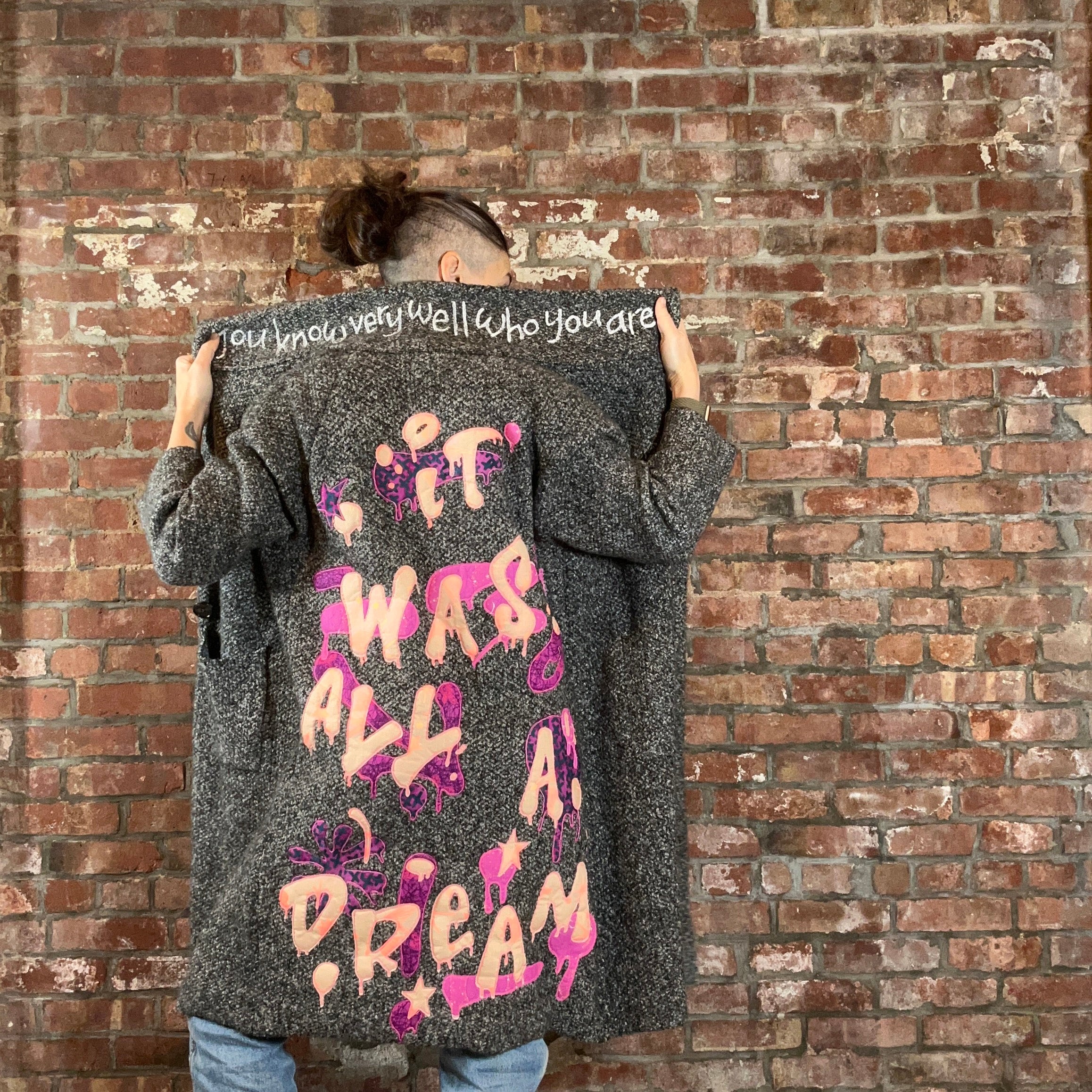 women's graffiti machine embroidered upcycled knit trench jacket: it was all a dream