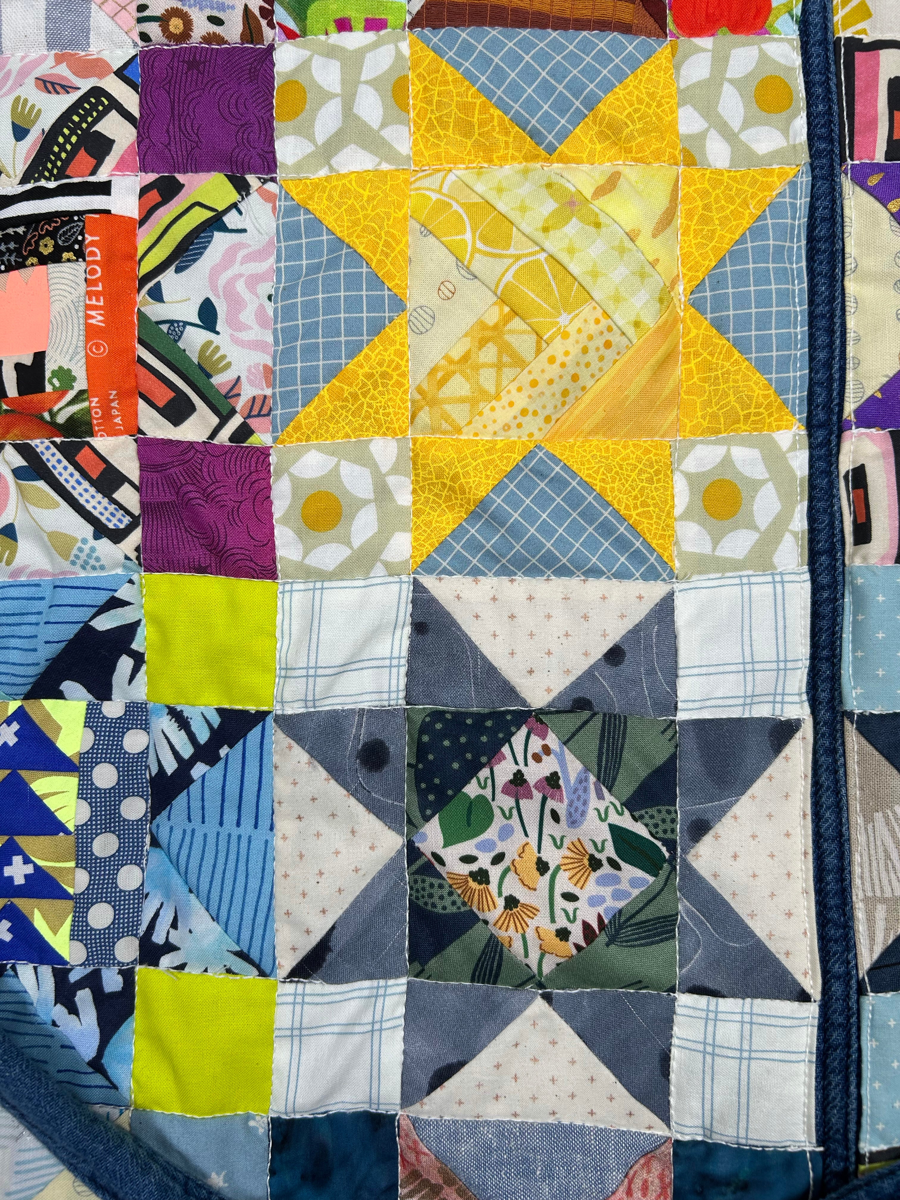 women's quilted patchwork denim jacket: yellow turquoise