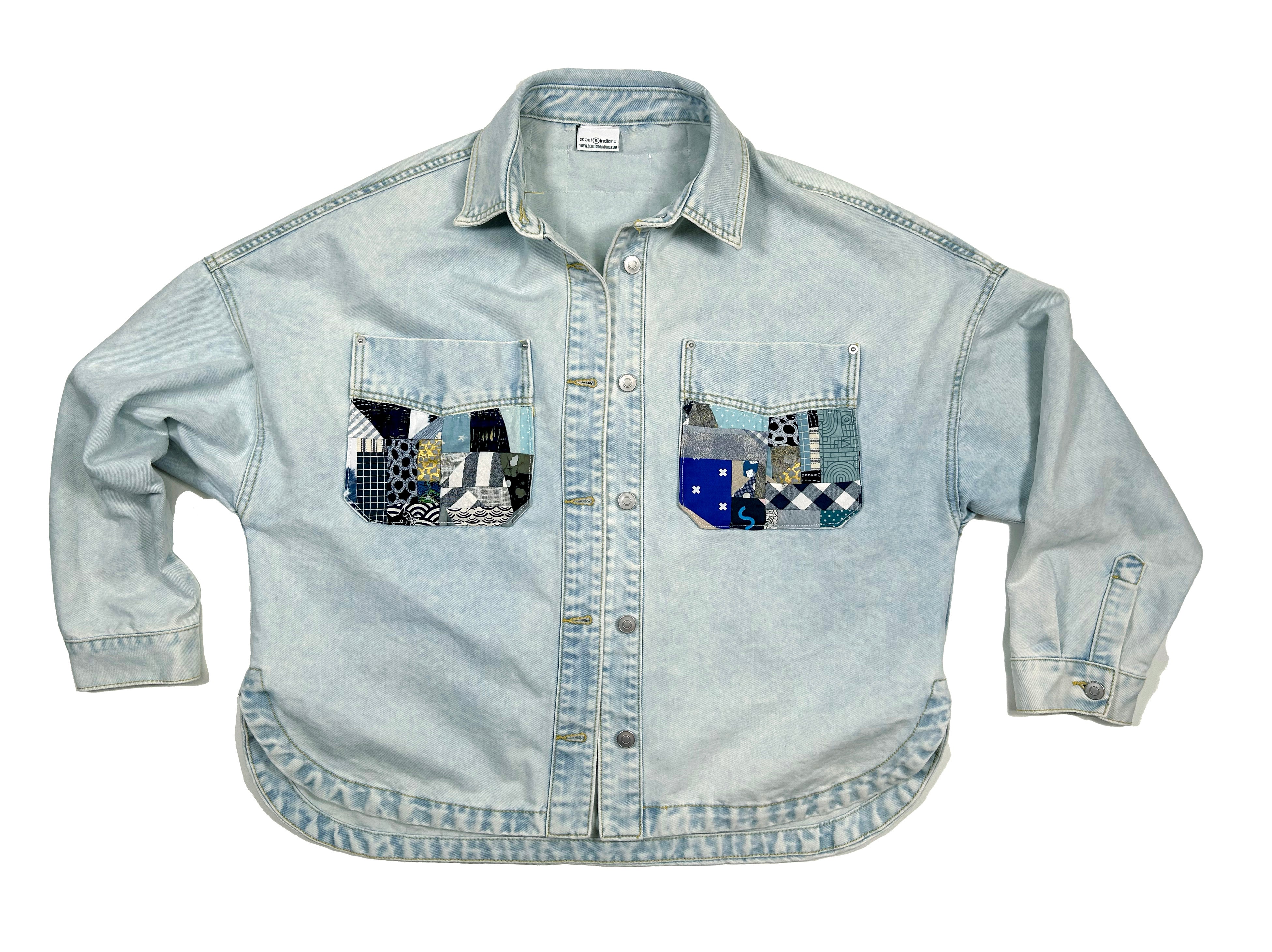 women's upcycled denim shirt jacket: scrappy sawtooth stars