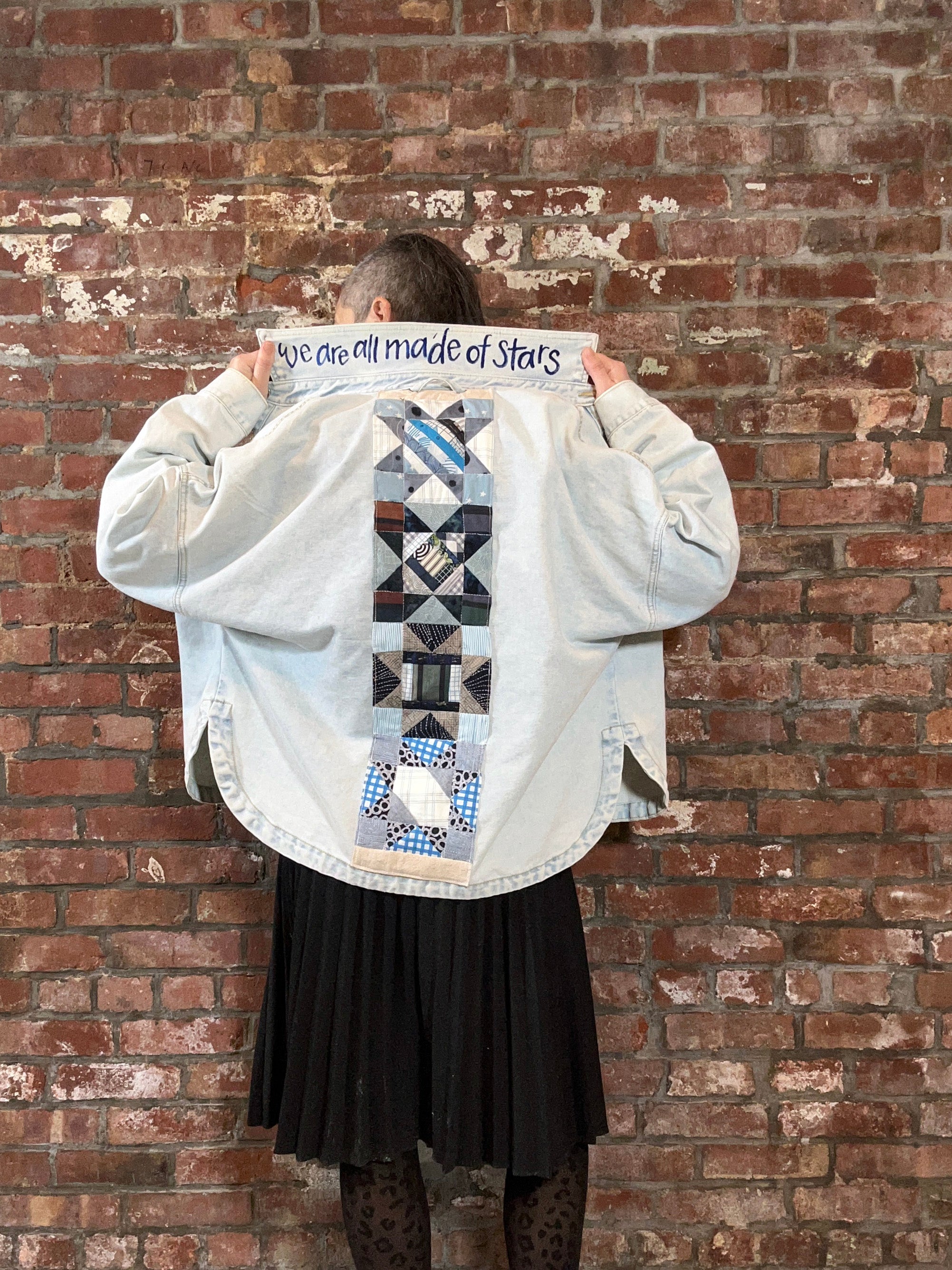 women's machine appliquéd upcycled denim jacket: no longer alone, moon phases
