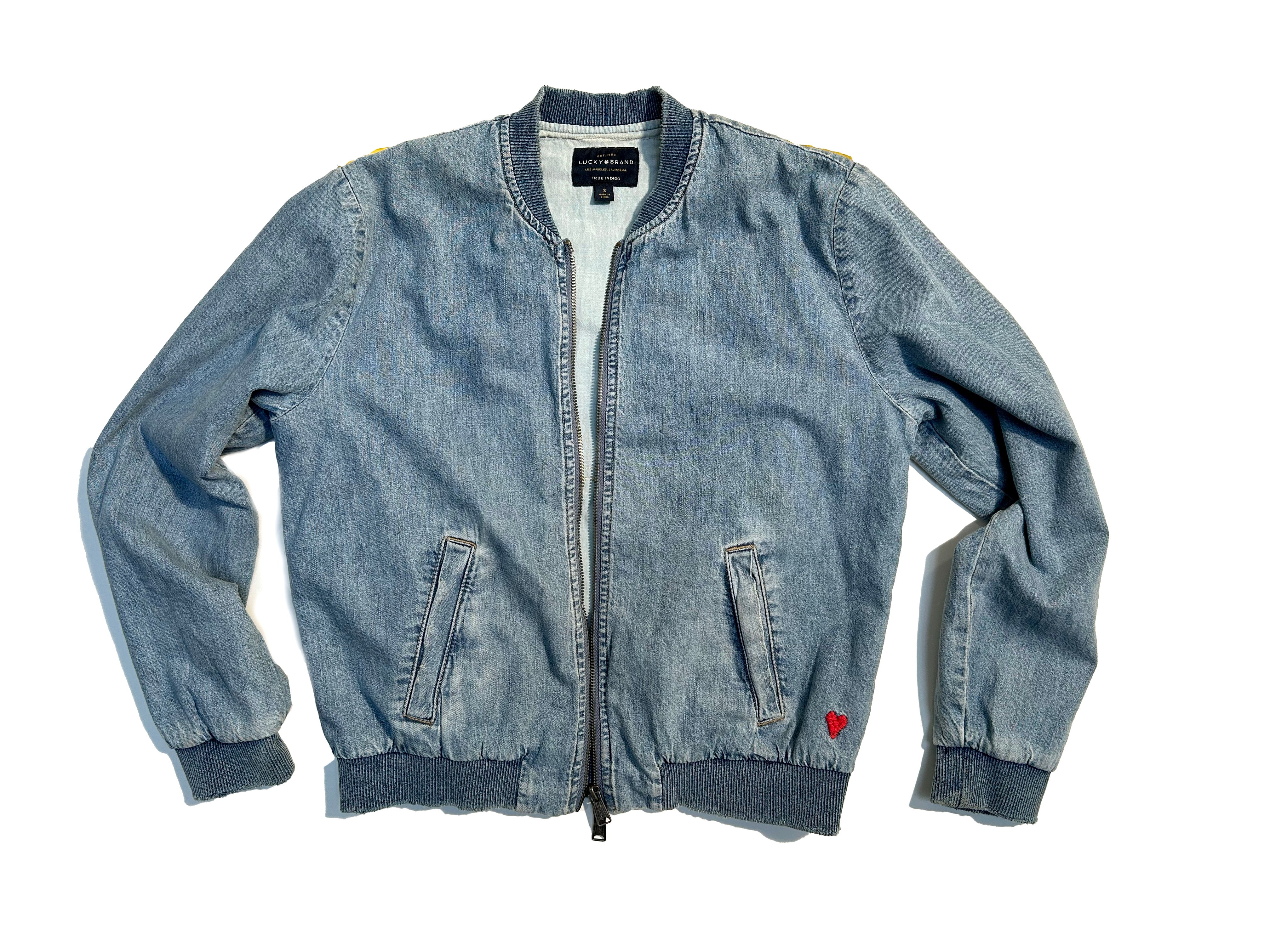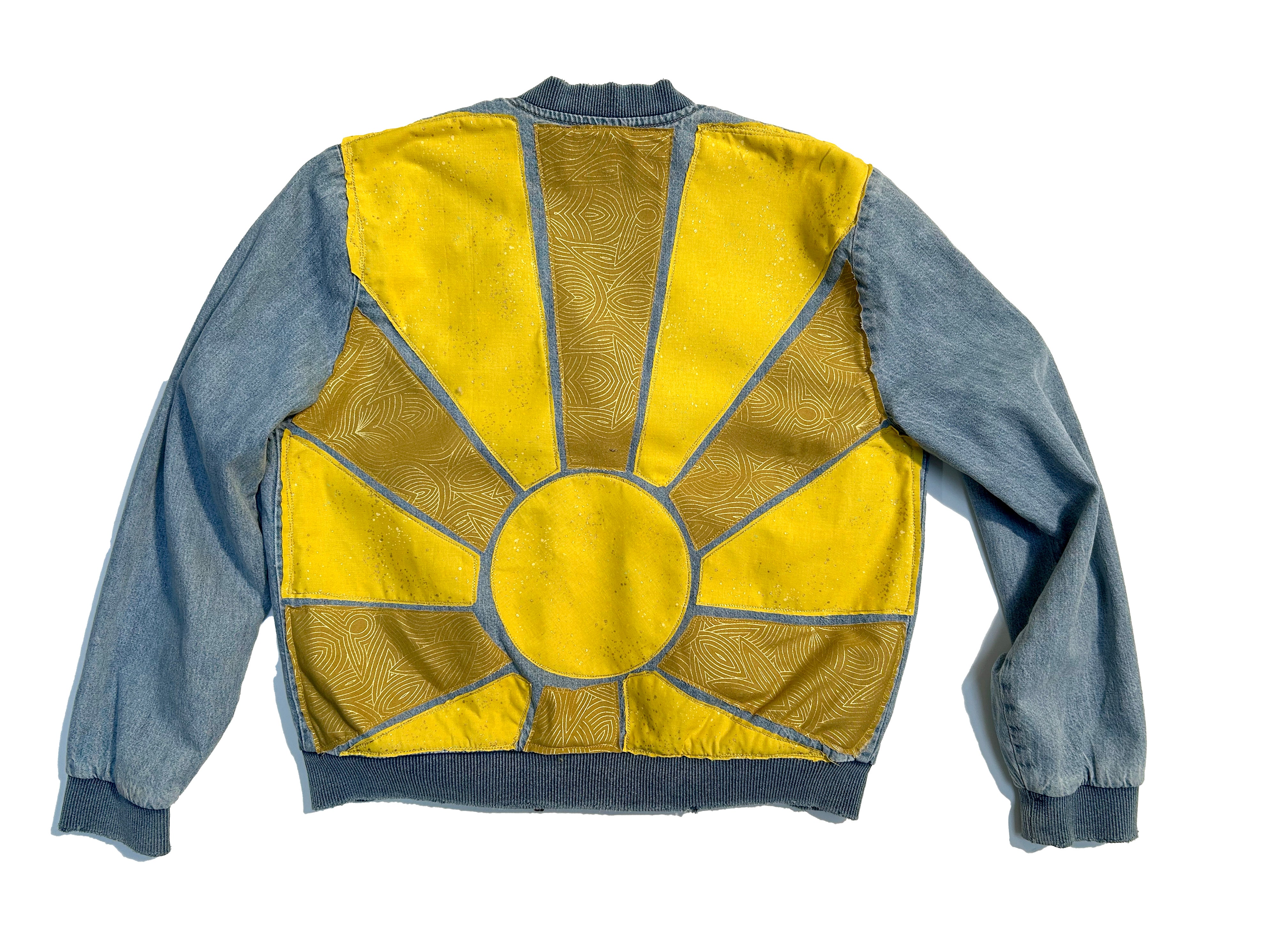 women's upcycled machine appliqué denim bomber jacket: rising sun