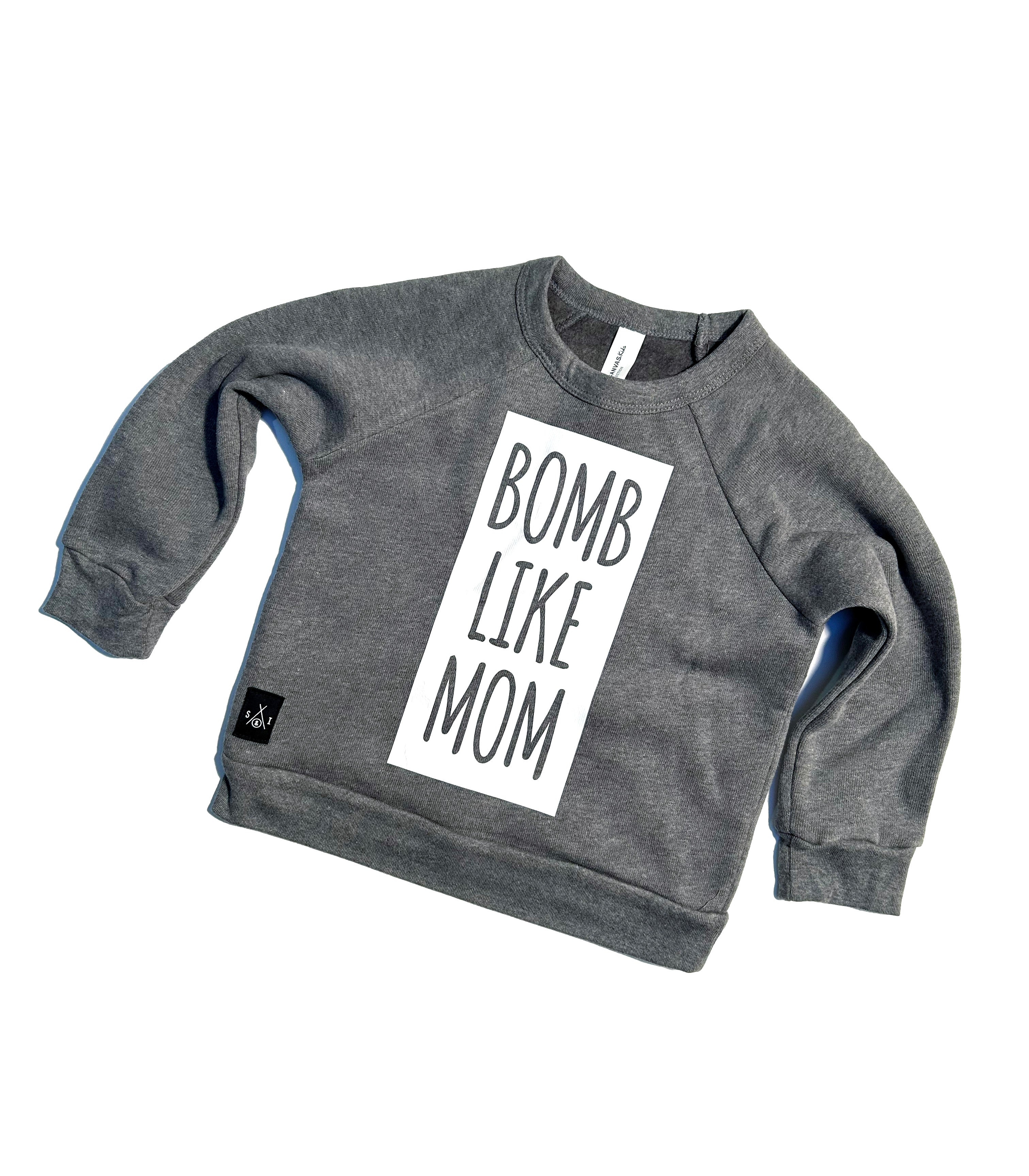 Deep heather gray fleece raglan crewneck sweatshirts are a blend of Polyester and Cotton. They are designed for maximum comfort and fit on kids of all sizes. Sweatshirts are preshrunk and produced in the USA with sustainable manufacturing processes and comprehensive recycling programs for paper waste and fabric scraps. Bomb Like Mom decal is a matte white heat transfer. The graphic is professionally heat pressed on so that the sweatshirts hold up well to washing and the wear and tear of everyday kid life. For longest life, wash gentle cold and low dry inside out.