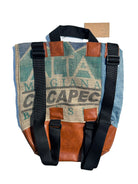 This roll top back pack is made of recycled denim with sashiko stitching and upcycled coffee totes sourced during a visit to Rome. The bag itself is about 16" high when closed, 21" when open, about 15" wide, and a 4" deep box bottom. There are nylon straps and black plastic hardware and closures. Back pack straps are adjustable, with the shortest length being about 24" and the longest length being about 45". The bag is lined with a blue/green floral cotton print.