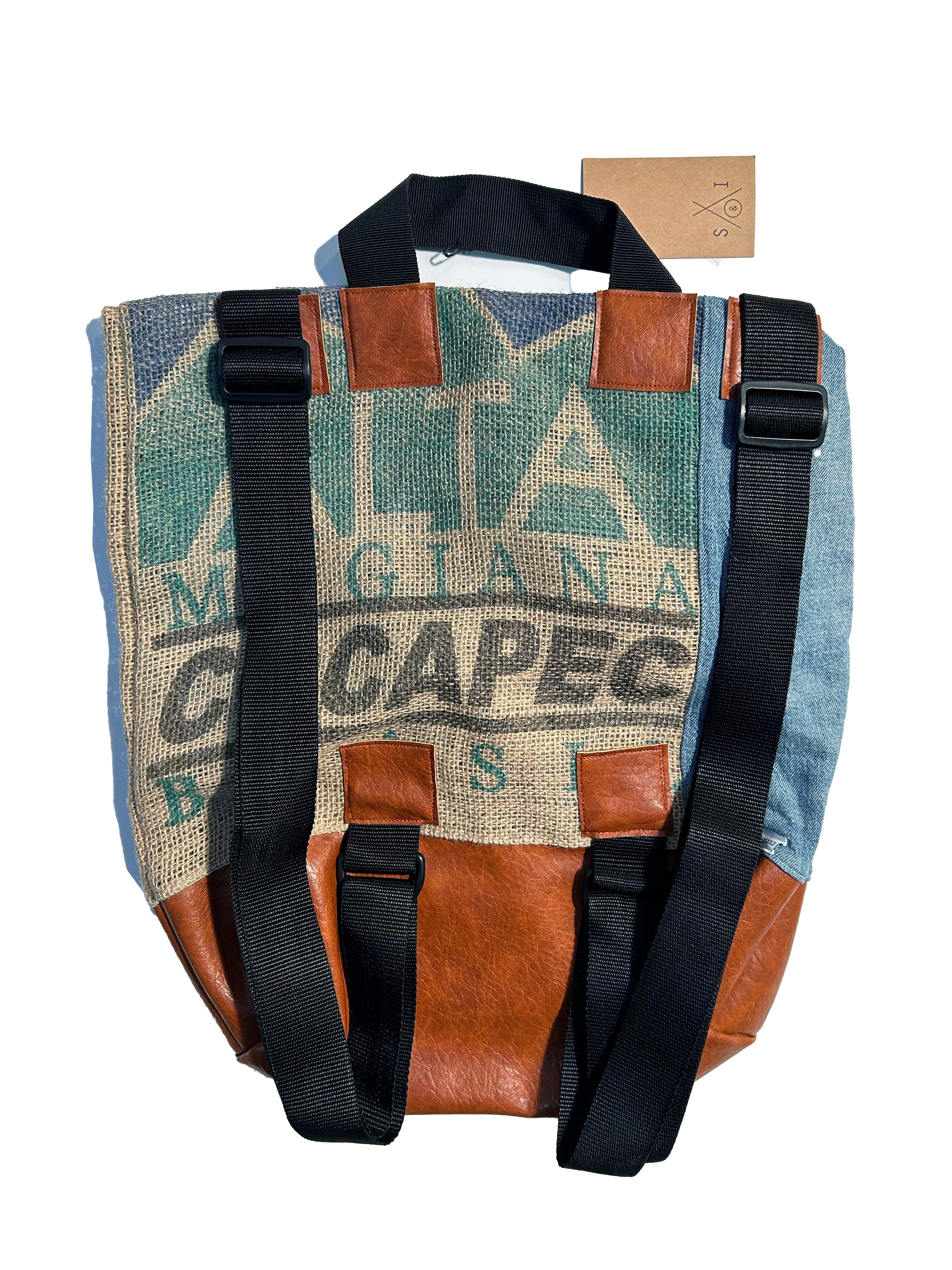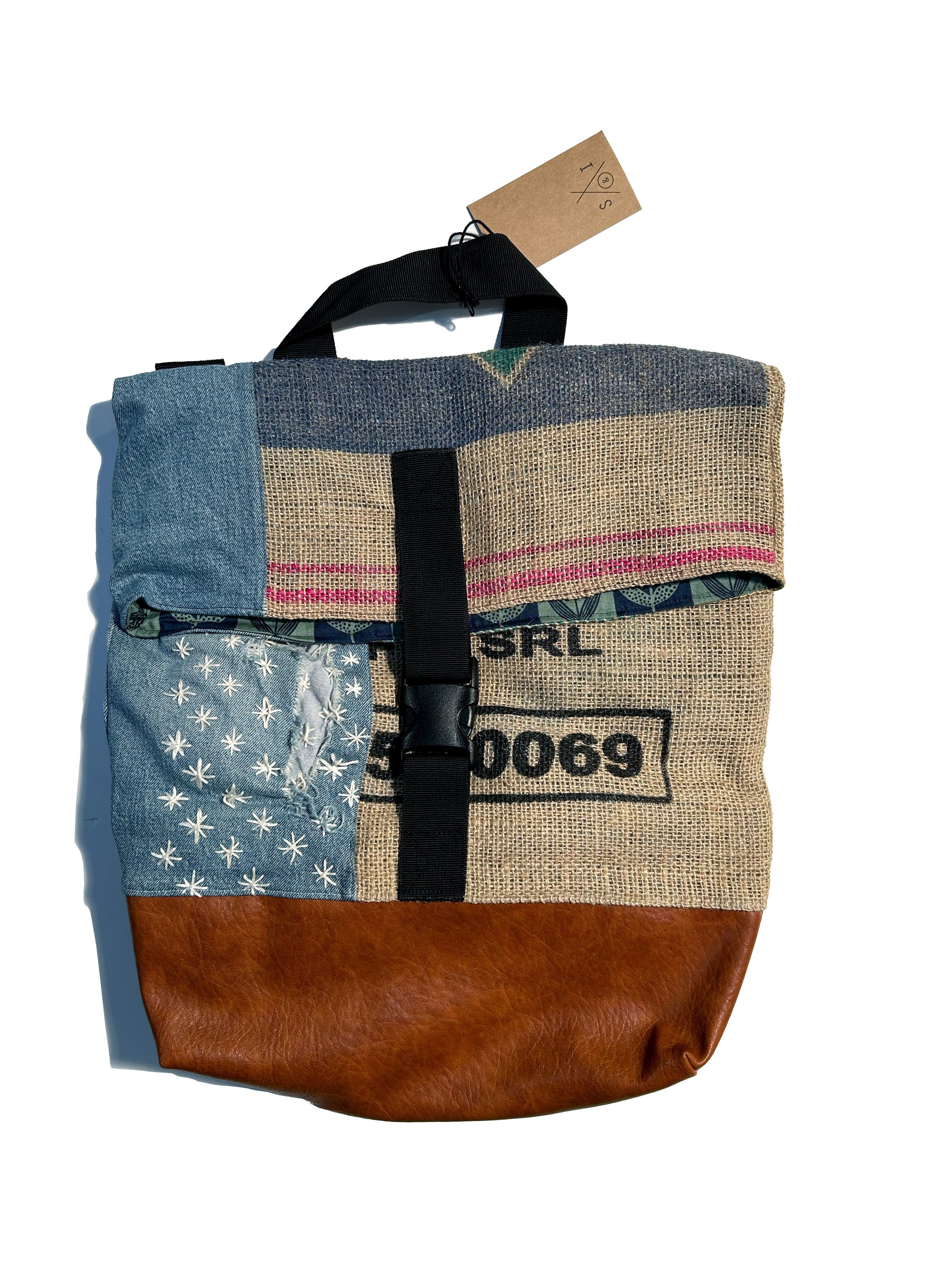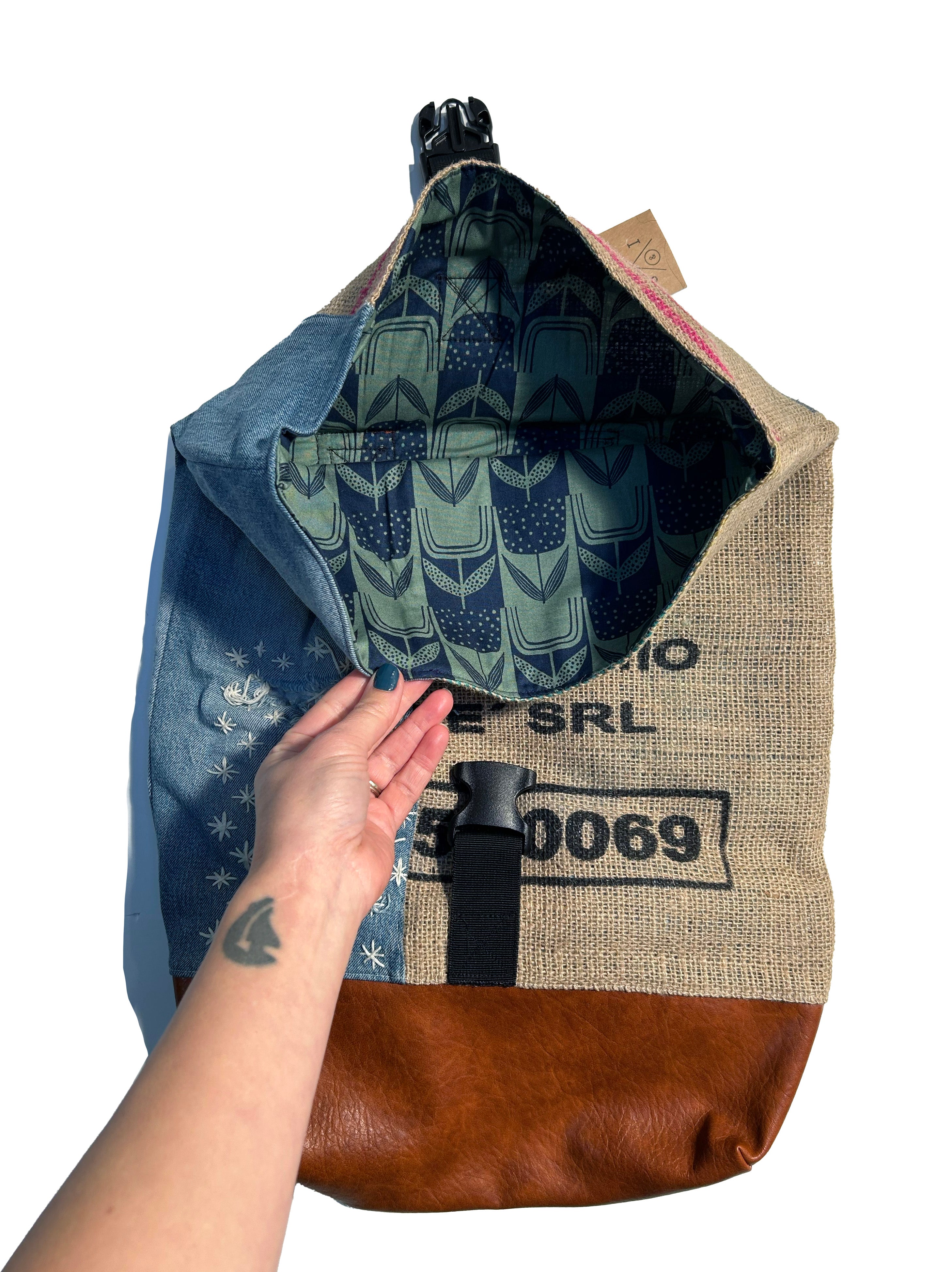 upcycled denim/coffee sack tote bag: roll top back pack
