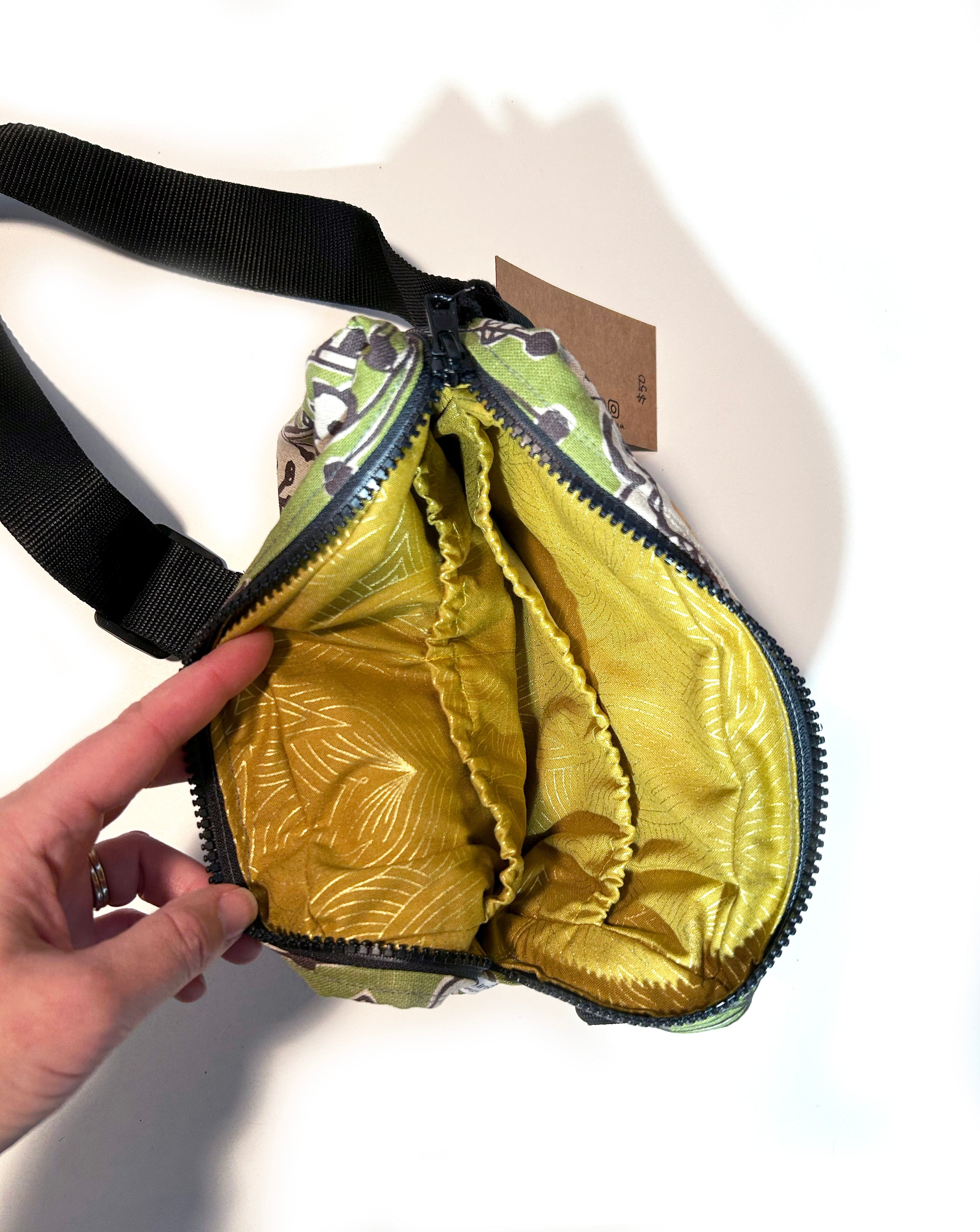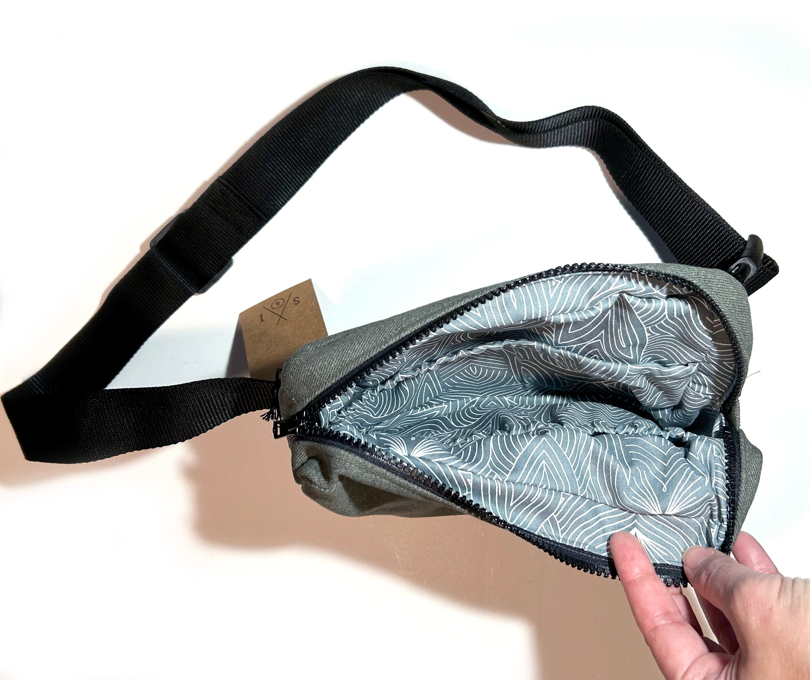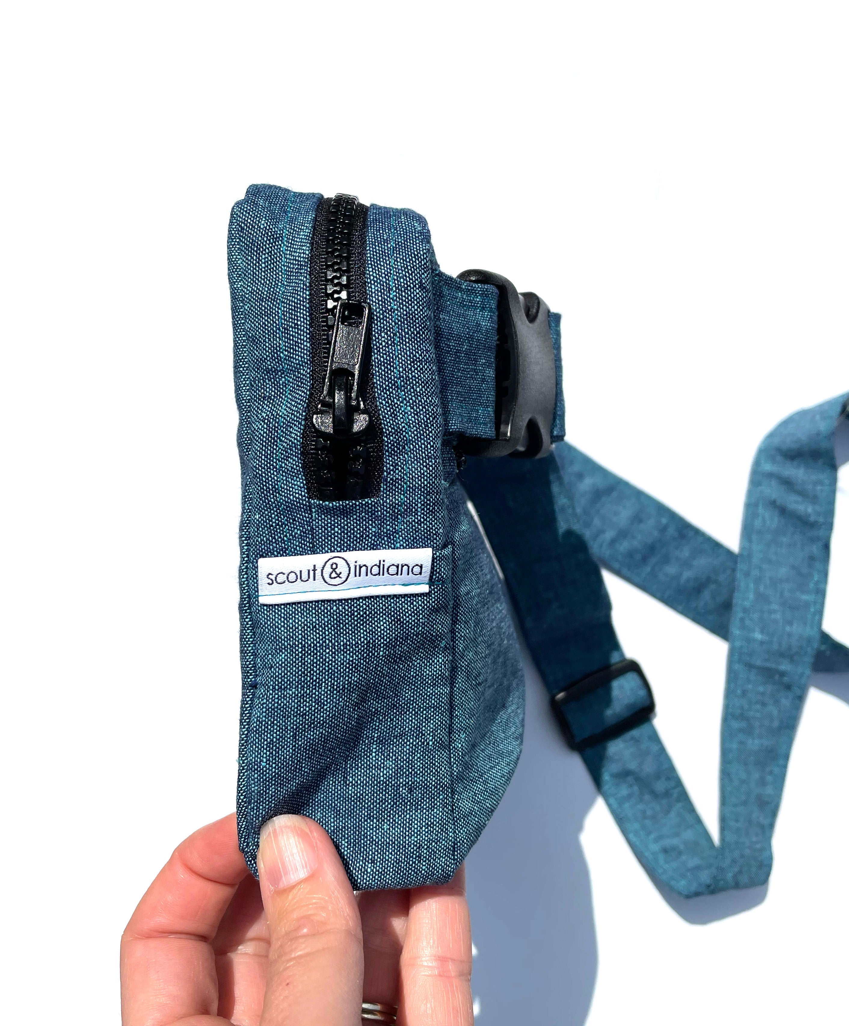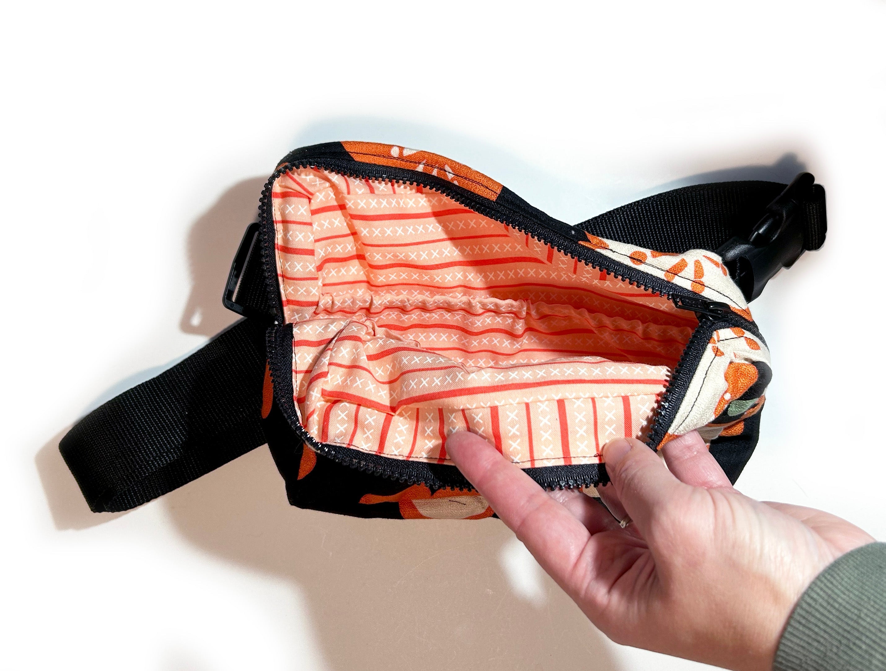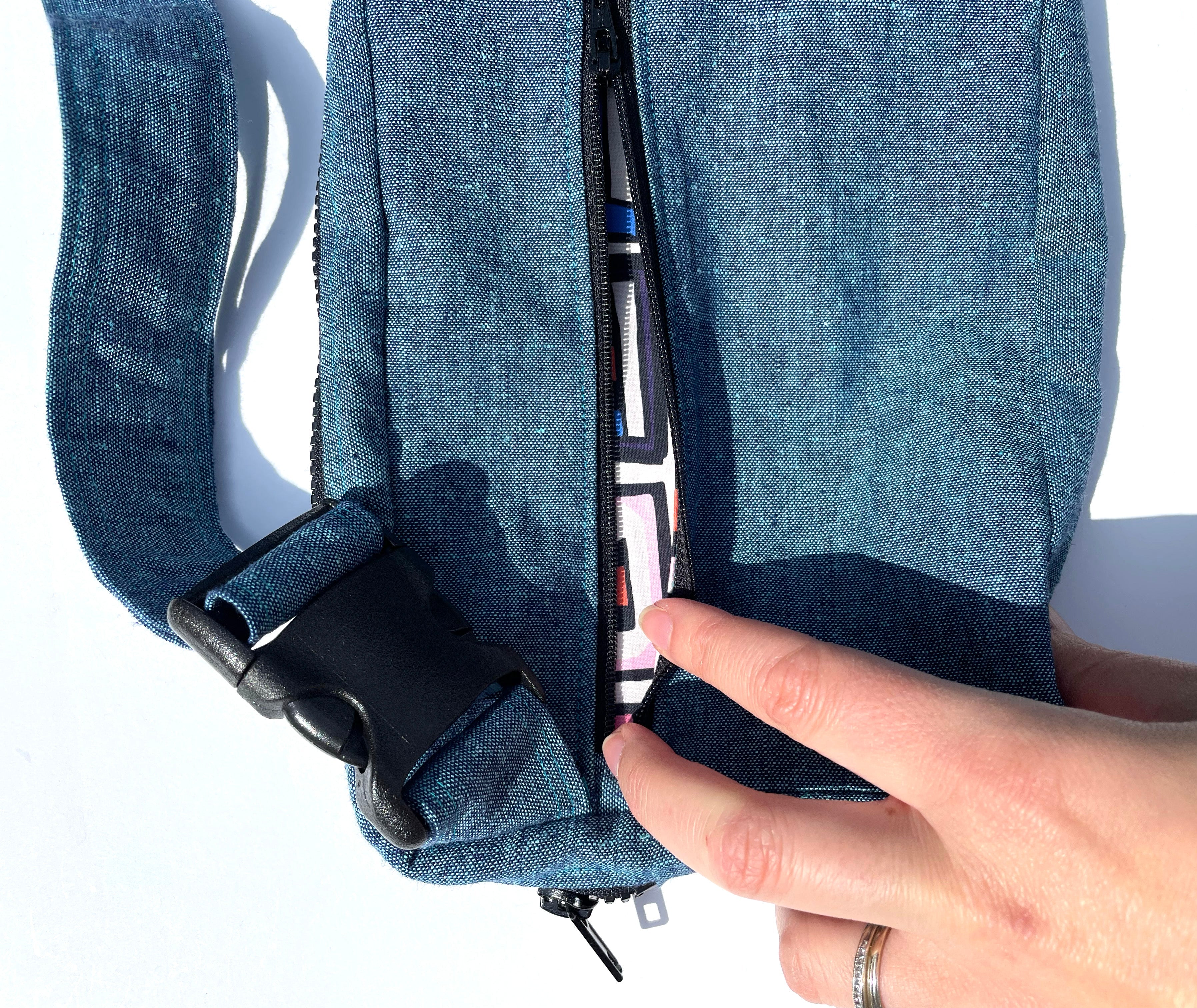 This comfortable and easy-to-wear belt bag has an adjustable strap and a side release plastic buckle making it perfect fit around your waist or across your body - or you can quickly and easily change your mind on the go. This bag was designed for people on the move - it easily fits a long wallet(and/or passport!), keys, and phone. There is a thick plastic top zipper that opens the bag to reveal the inner pouch with two smaller (phone size) pockets on one side and a long pocket on the other. This allows for some separation options for whatever you put inside. A back zipper reveals another pocket that is big enough to accommodate a smartphone.