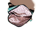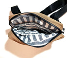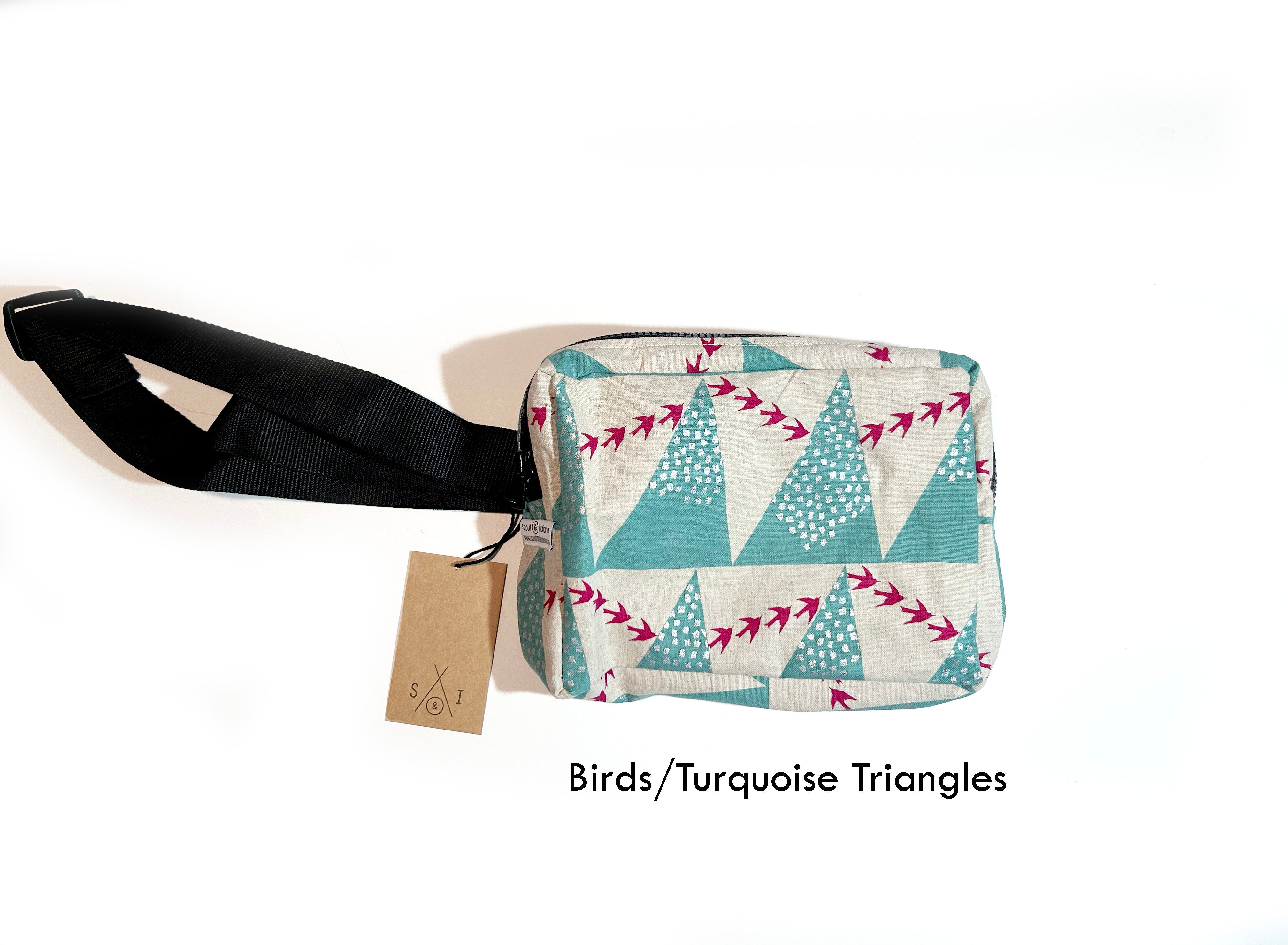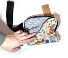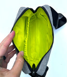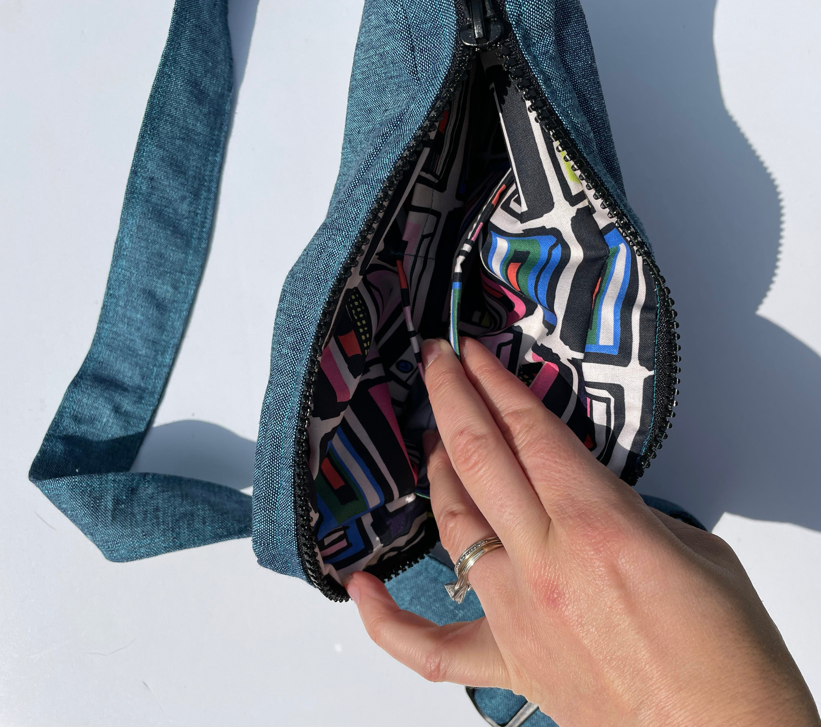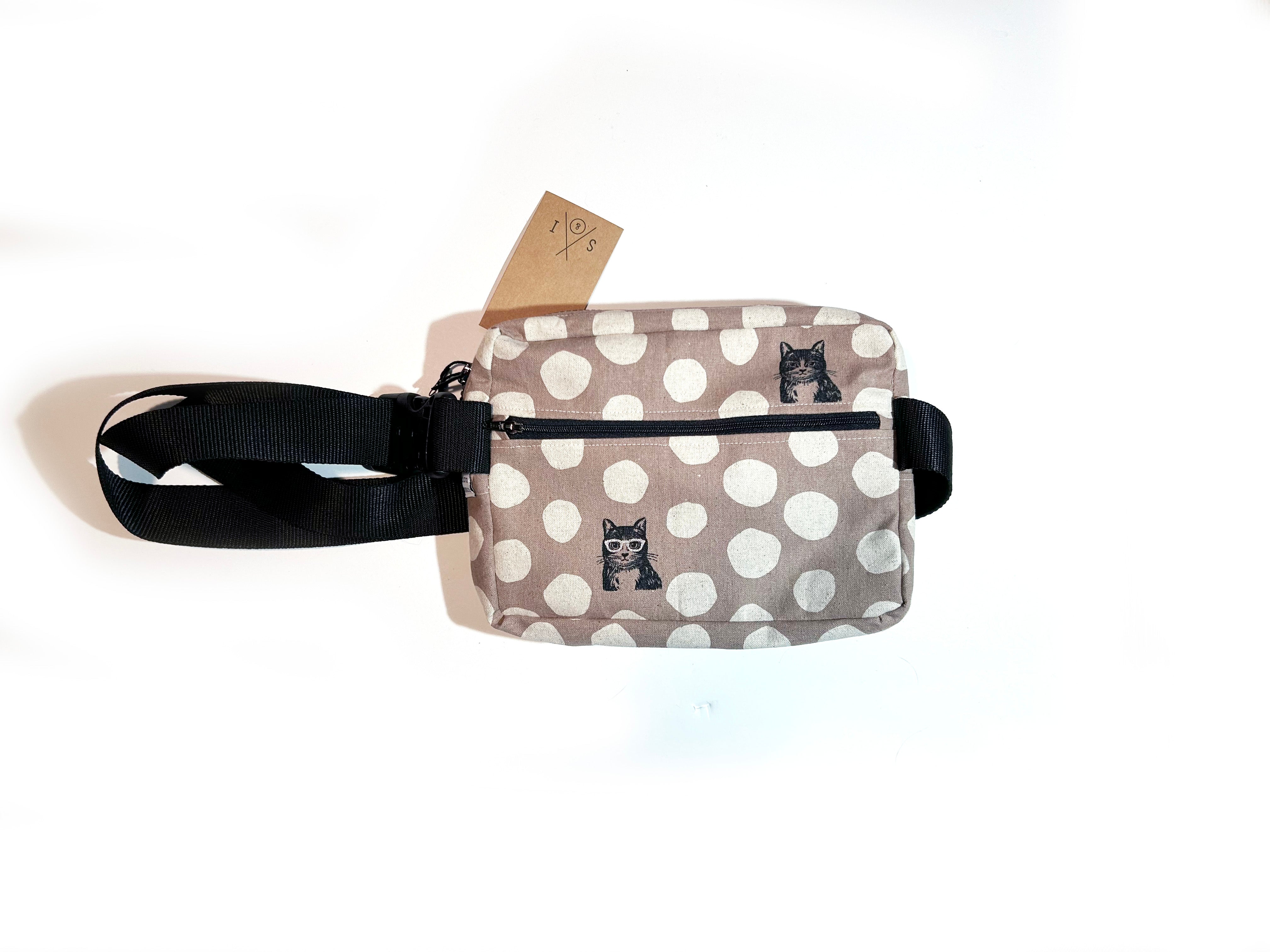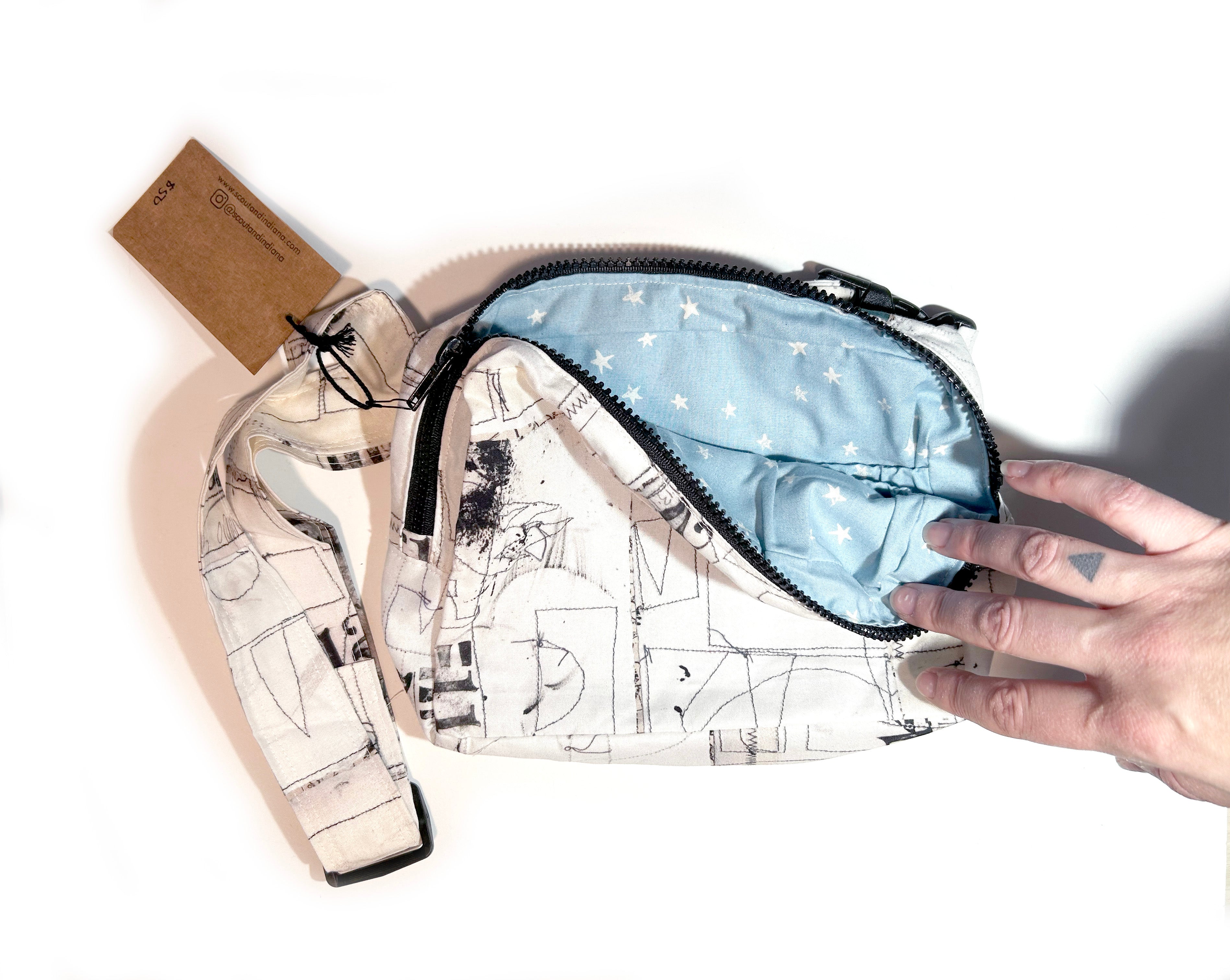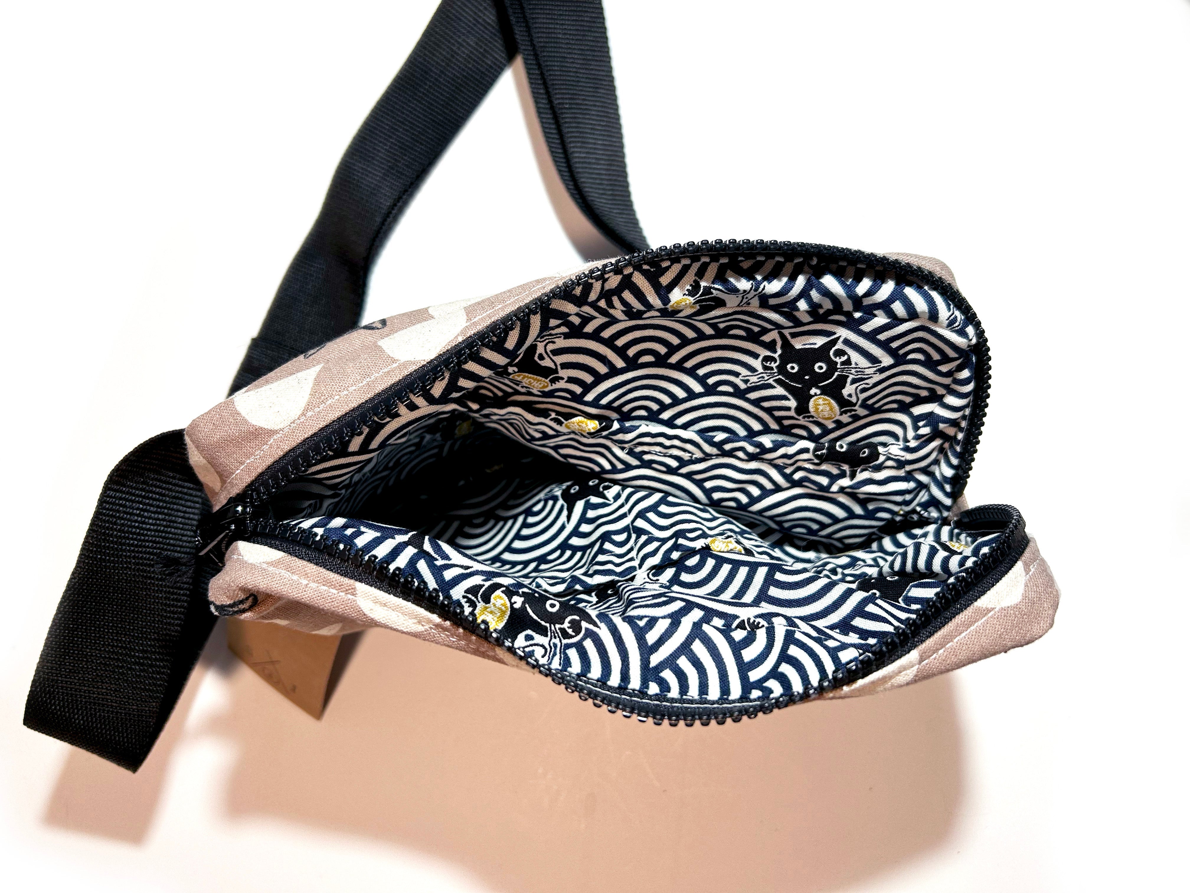 This comfortable and easy-to-wear belt bag has an adjustable strap and a side release plastic buckle making it perfect fit around your waist or across your body - or you can quickly and easily change your mind on the go. This bag was designed for people on the move - it easily fits a long wallet(and/or passport!), keys, and phone. There is a thick plastic top zipper that opens the bag to reveal the inner pouch with two smaller (phone size) pockets on one side and a long pocket on the other. This allows for some separation options for whatever you put inside. A back zipper reveals another pocket that is big enough to accommodate a smartphone.