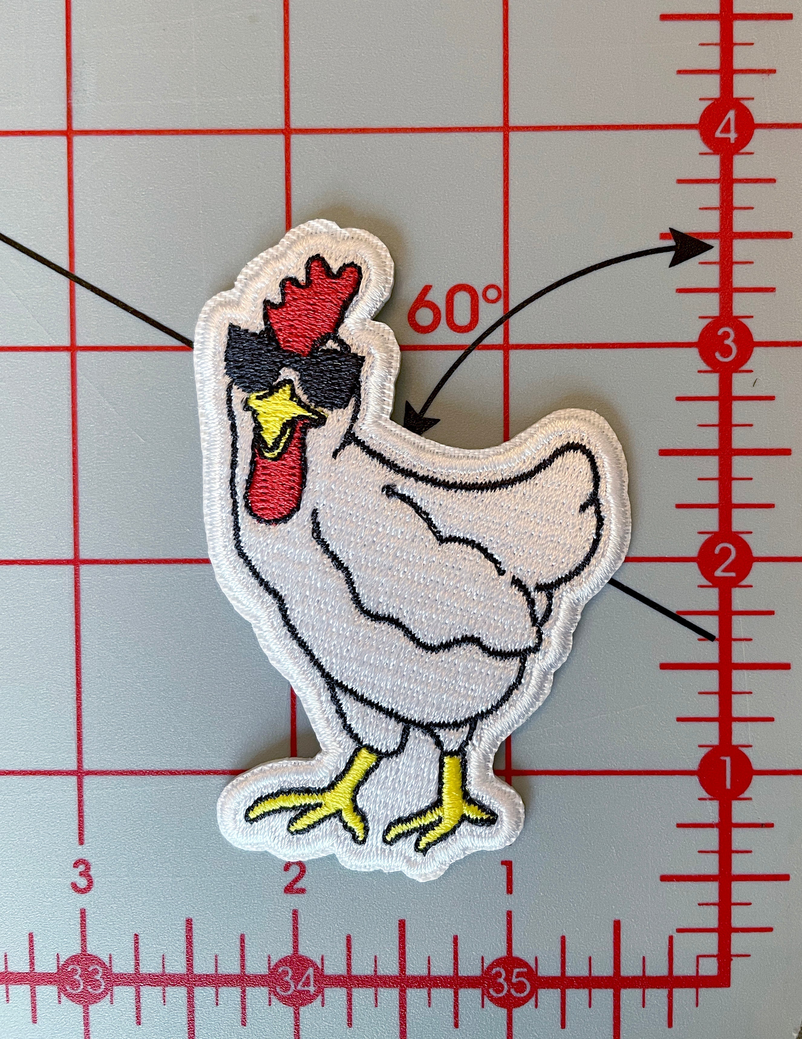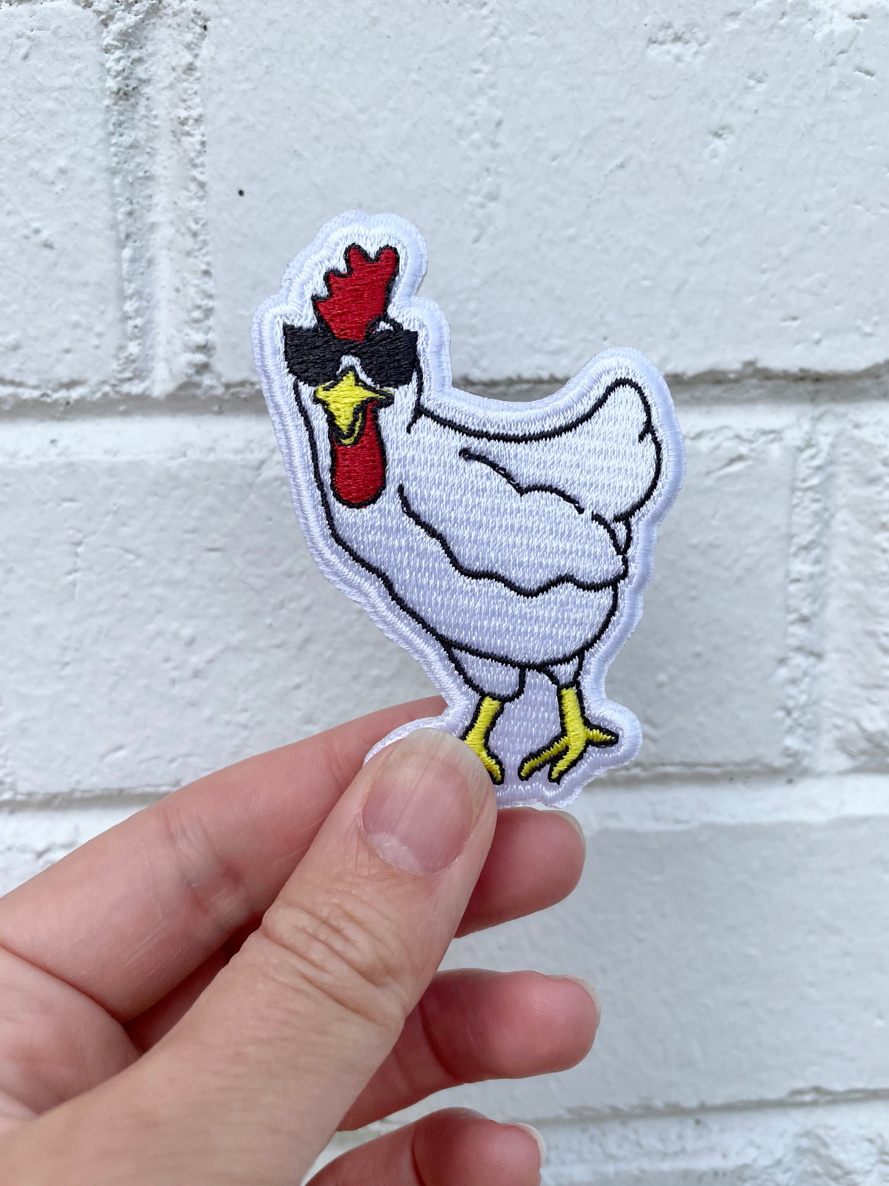 This iron on patch is a cool chicken is strutting around in some stylish sunglasses. It's the perfect iron on addition to a jacket or bag for anyone who thinks chickens are funny, and/or appreciates the lyric "these chickens are jackin' my style".