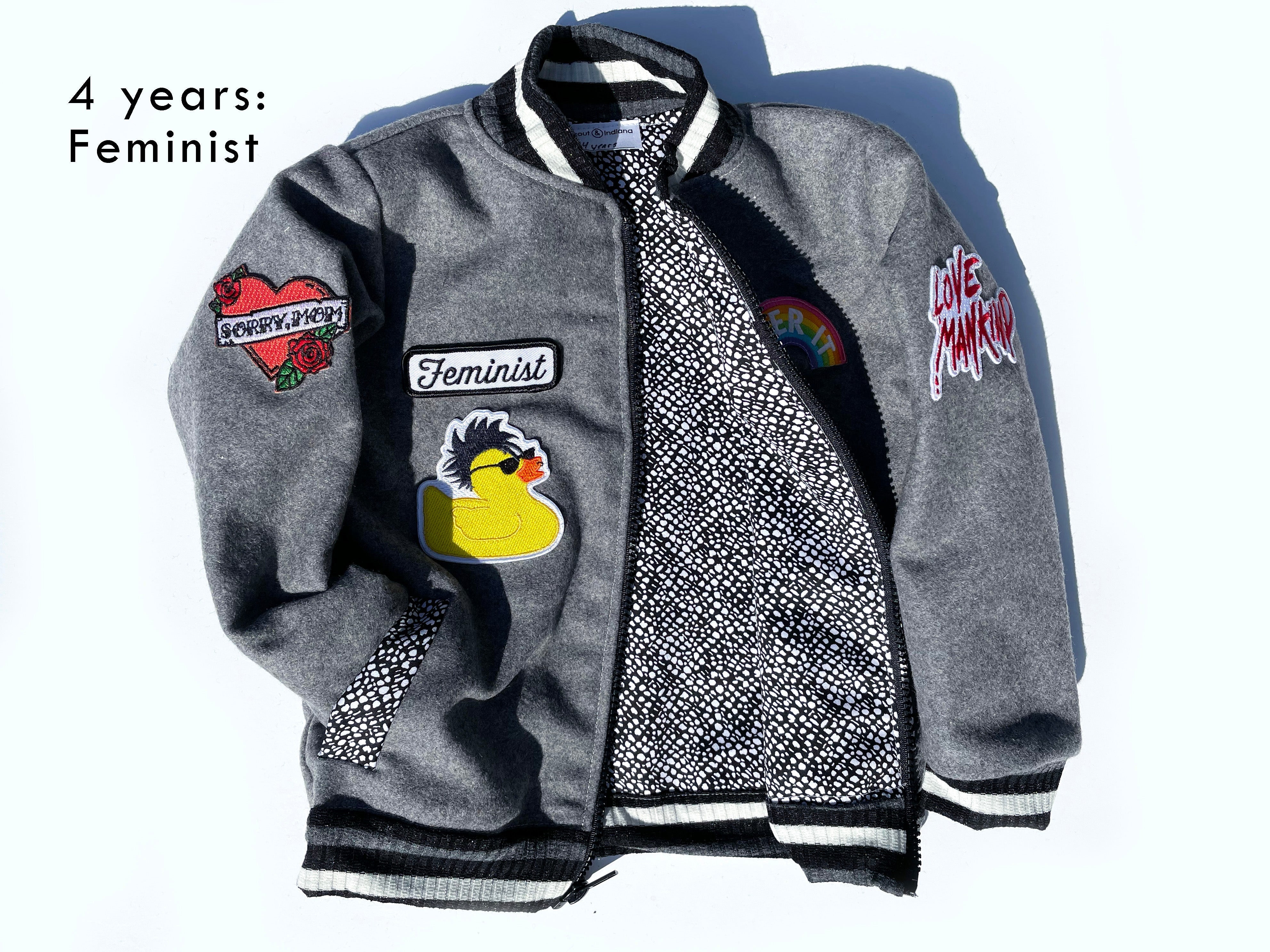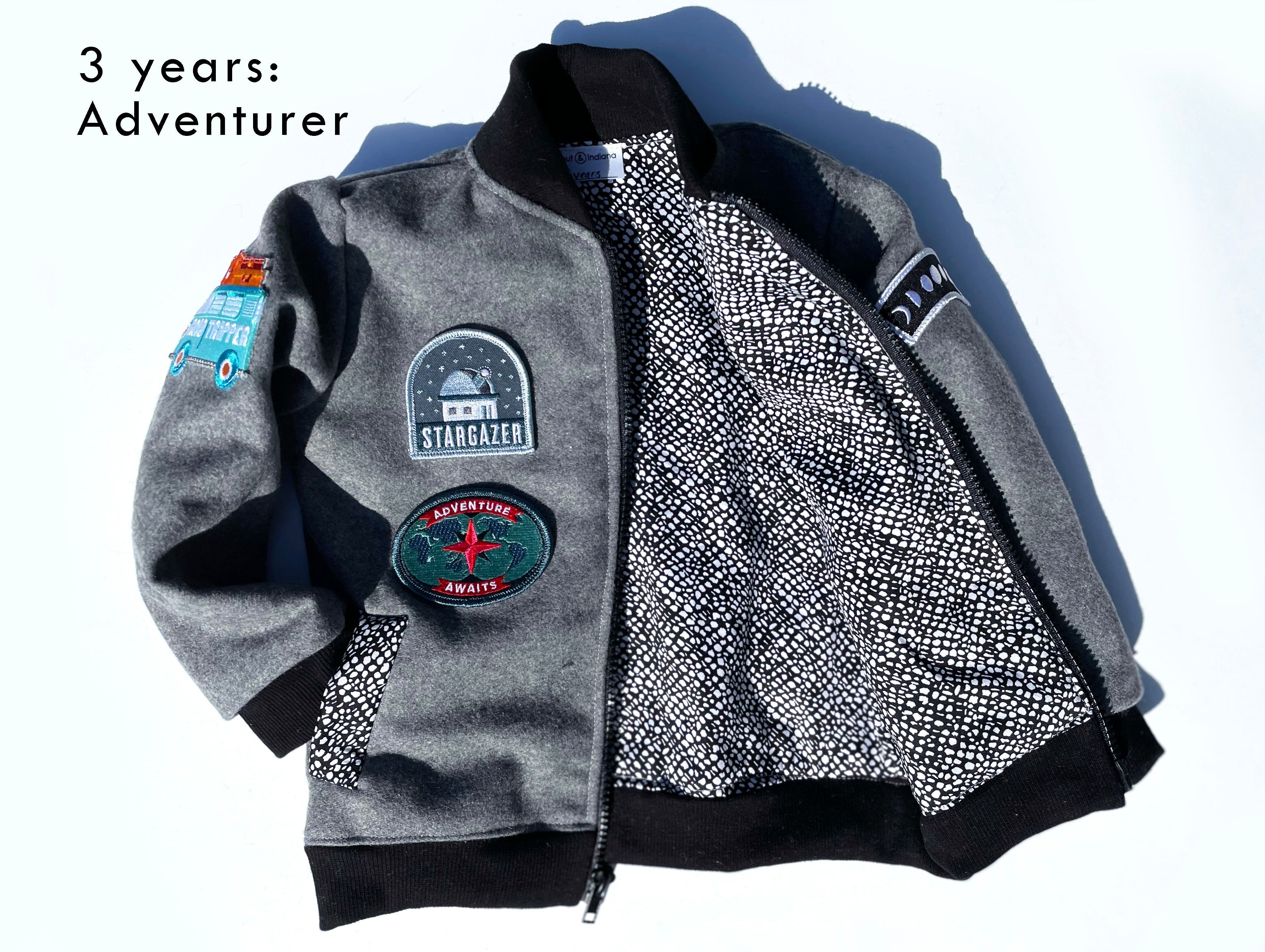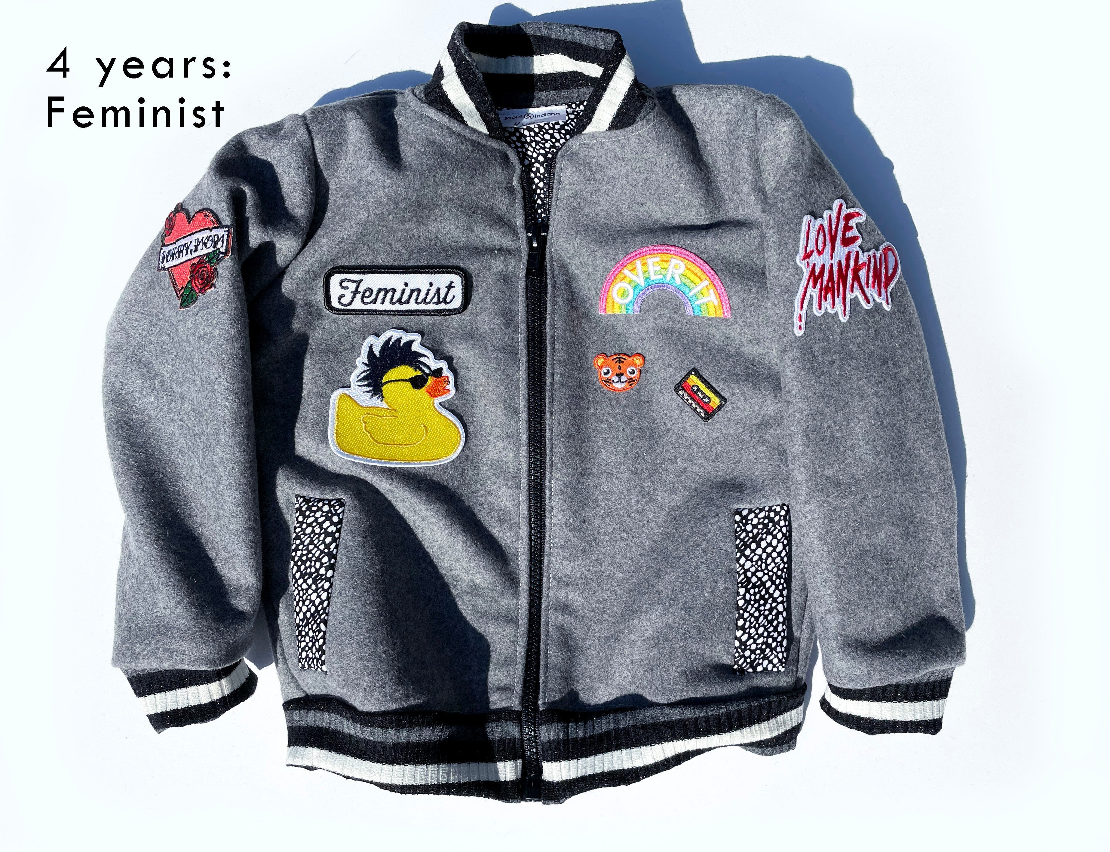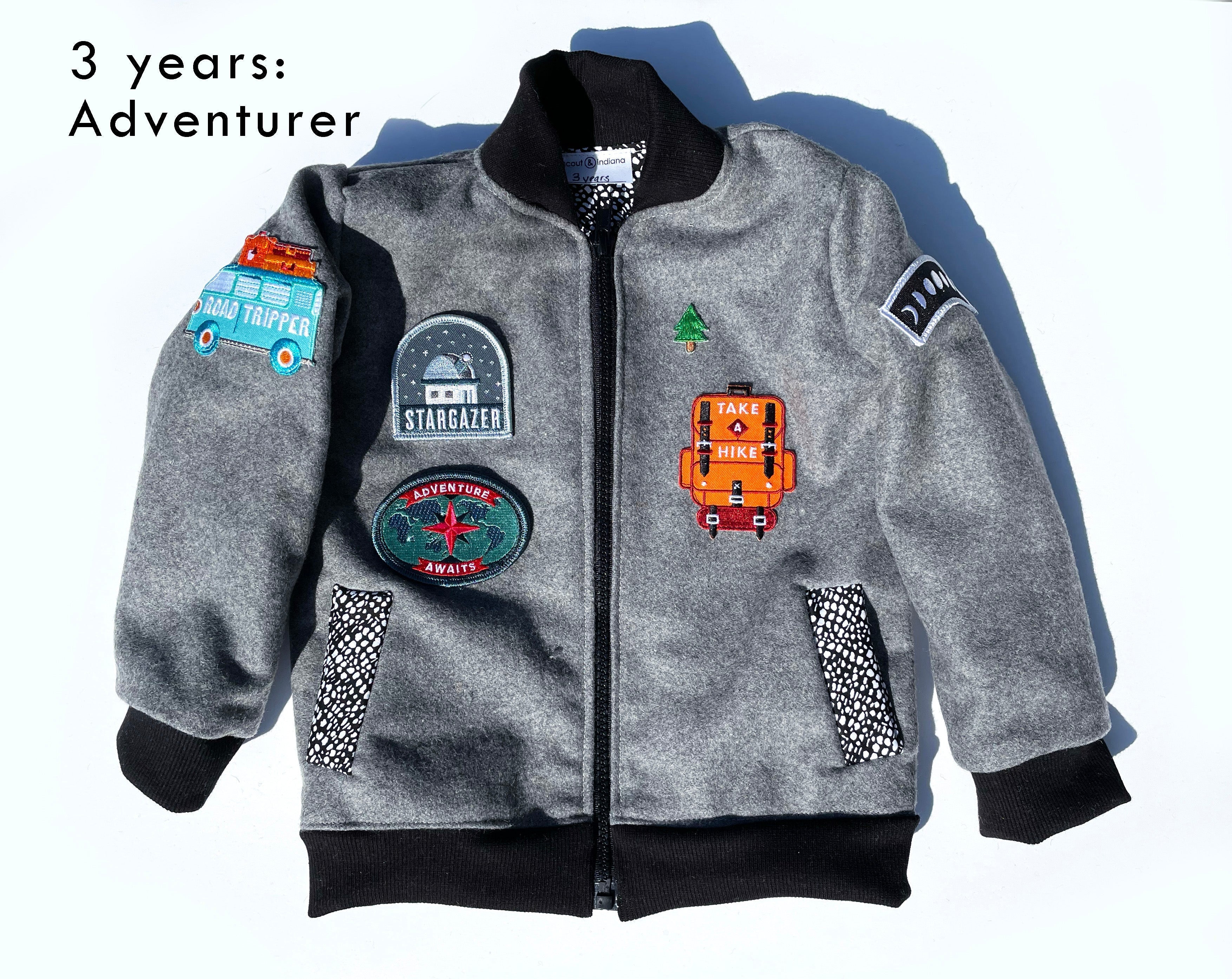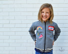 Keep your kiddos cozy AND cool this fall with this stylish twist on a classic bomber jacket. The jacket itself is handmade with a Telio Wool Blend Melton Light Grey Mix fabric. It is lined with a Cotton Spandex Sateen fabric; cuffs and collars are a Rib Knit (color/pattern may vary slightly based on availability) . There are two pockets and a black plastic zipper closure. Each jacket is decorated with a variety of patches on the front panels and sleeves (as seen in pics). Please leave us a note at checkout to let us know if the jacket is gender specific and/or if you have a patch theme preference (food, science, exploring, feminism, etc).