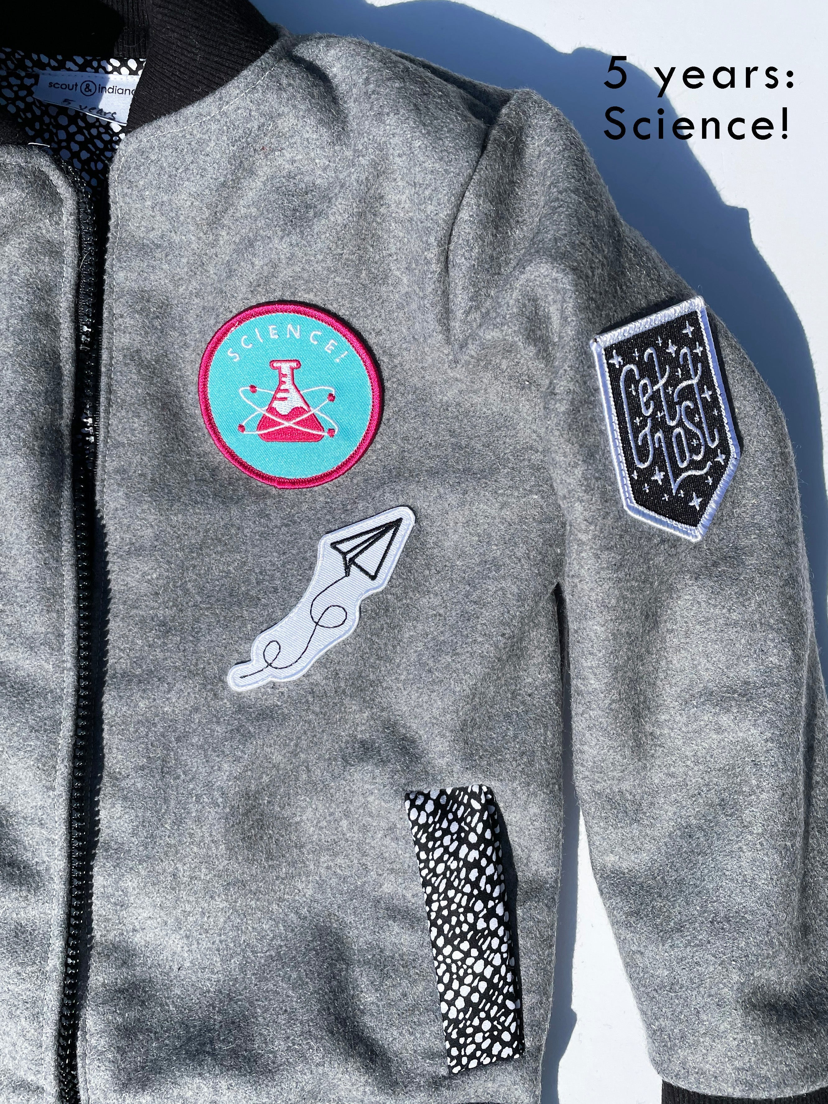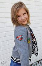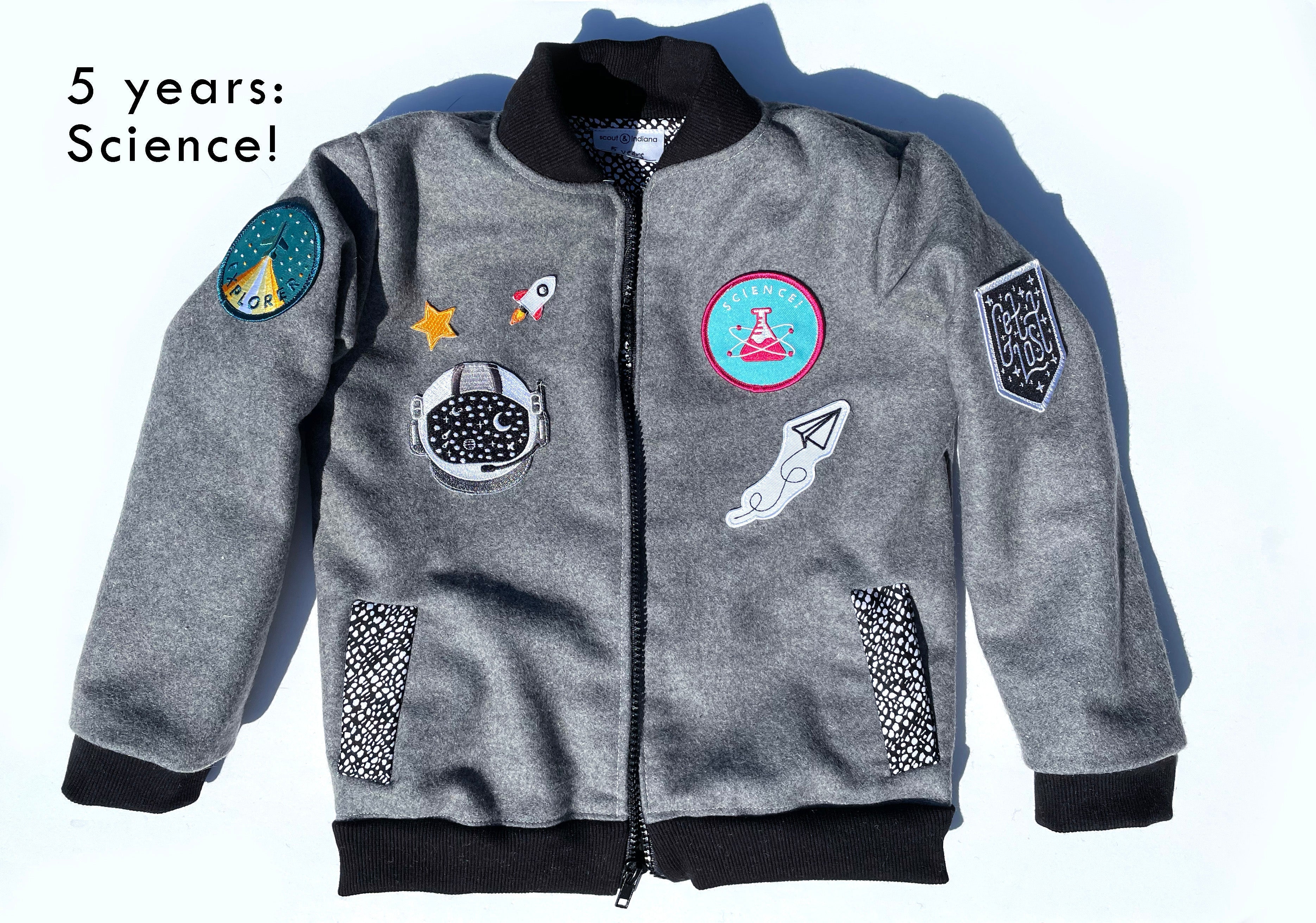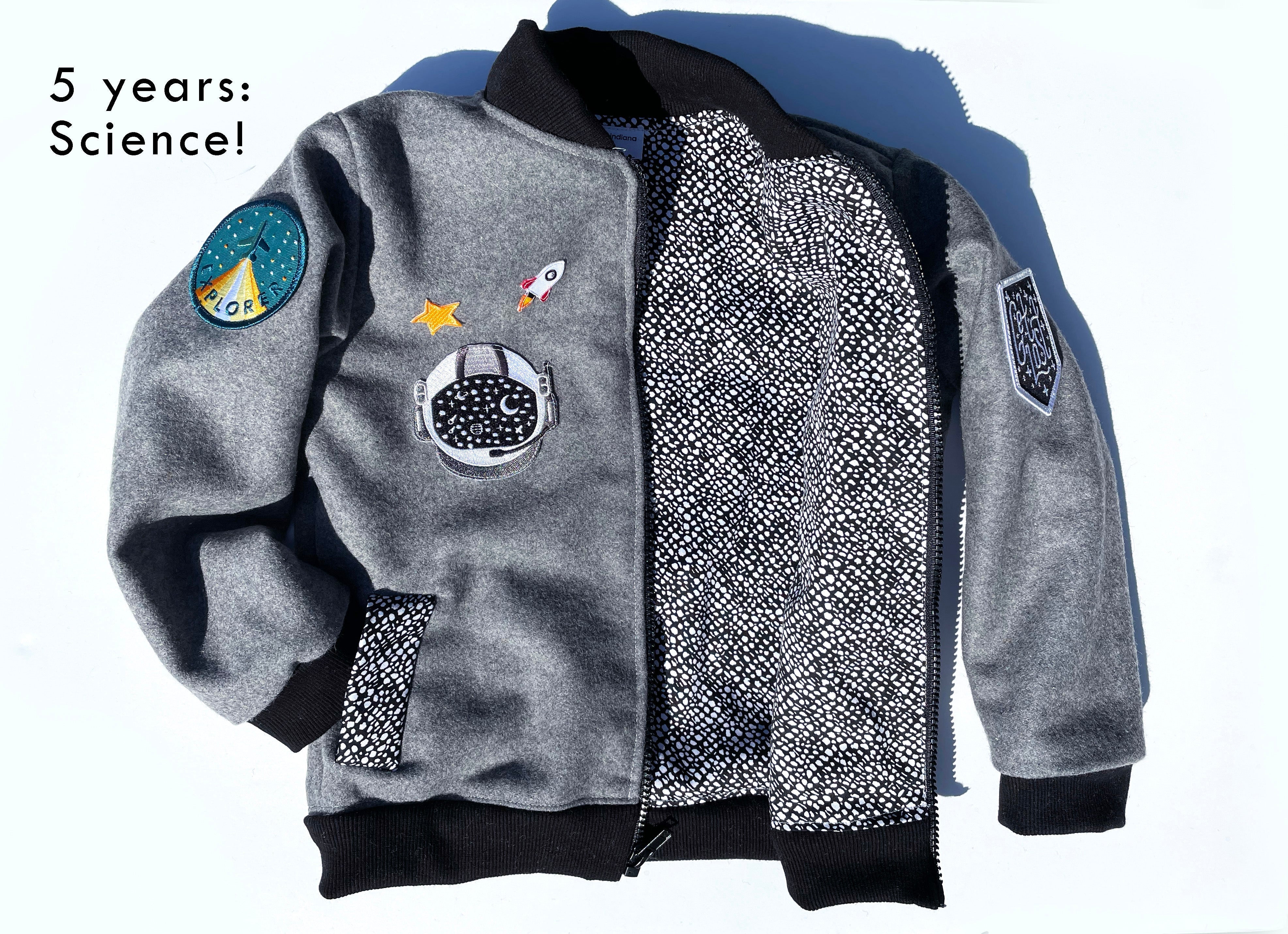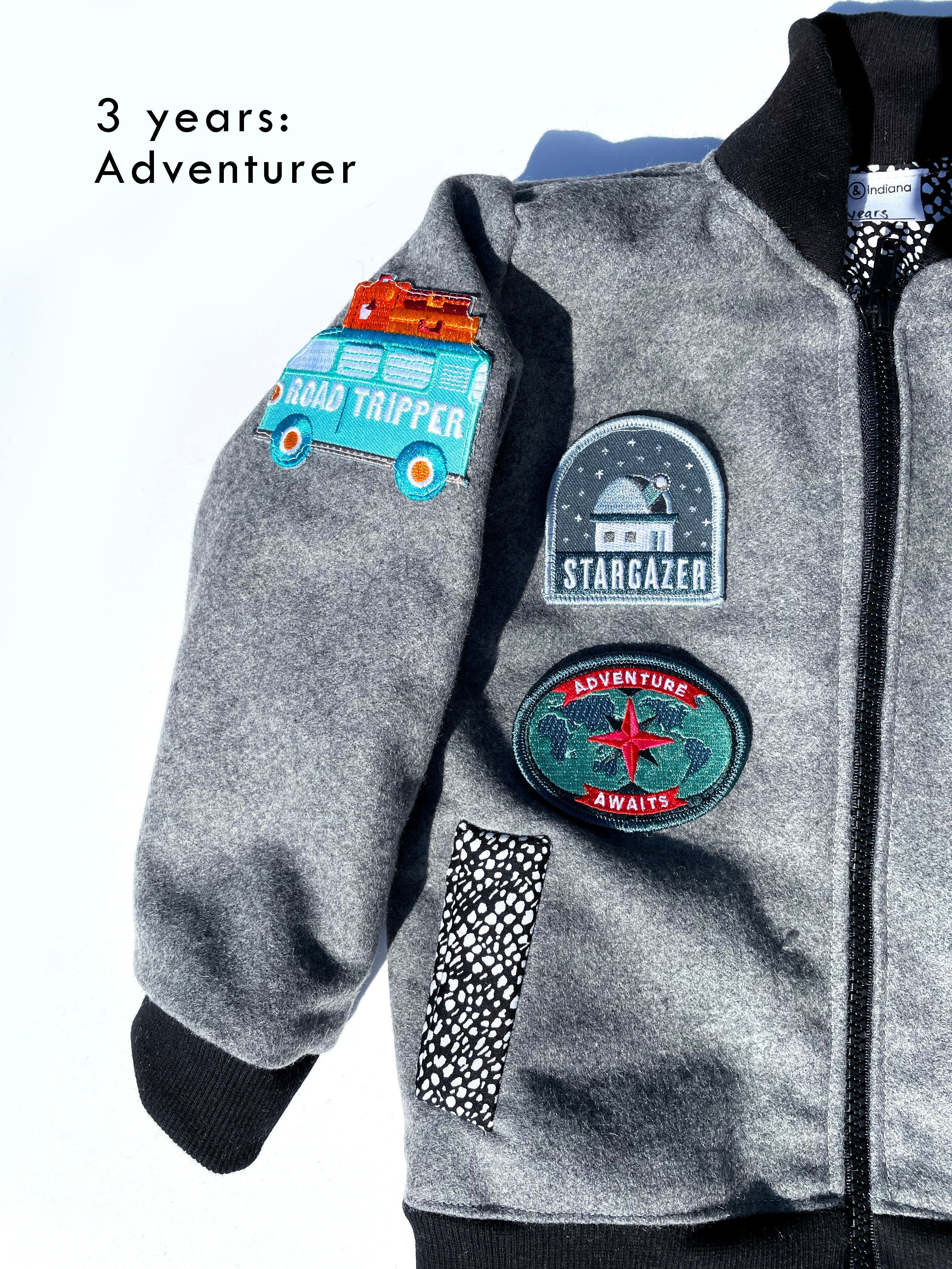 Keep your kiddos cozy AND cool this fall with this stylish twist on a classic bomber jacket. The jacket itself is handmade with a Telio Wool Blend Melton Light Grey Mix fabric. It is lined with a Cotton Spandex Sateen fabric; cuffs and collars are a Rib Knit (color/pattern may vary slightly based on availability) . There are two pockets and a black plastic zipper closure. Each jacket is decorated with a variety of patches on the front panels and sleeves (as seen in pics). Please leave us a note at checkout to let us know if the jacket is gender specific and/or if you have a patch theme preference (food, science, exploring, feminism, etc).