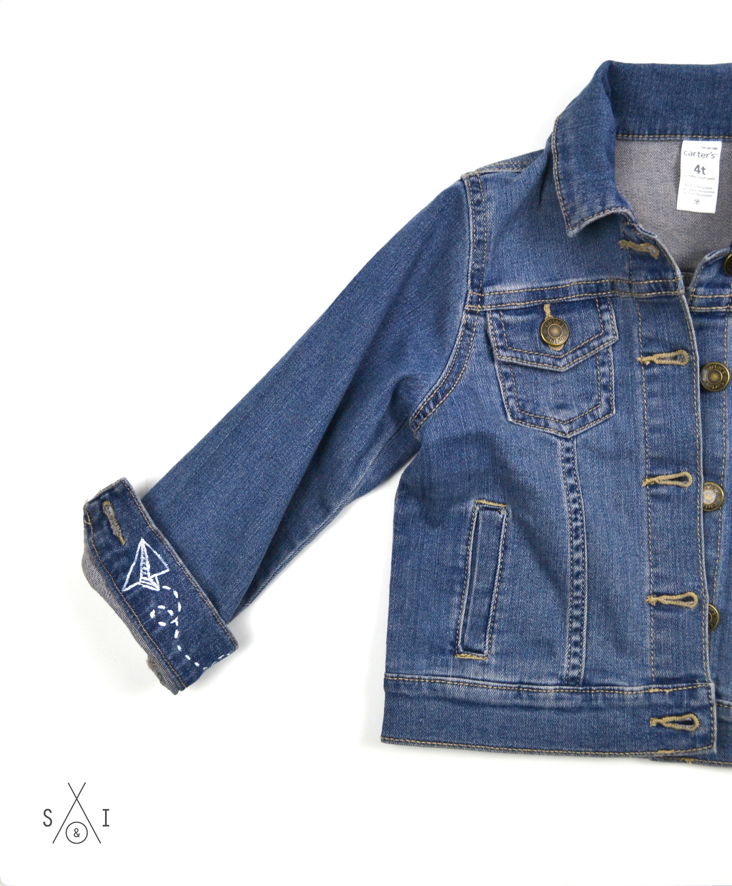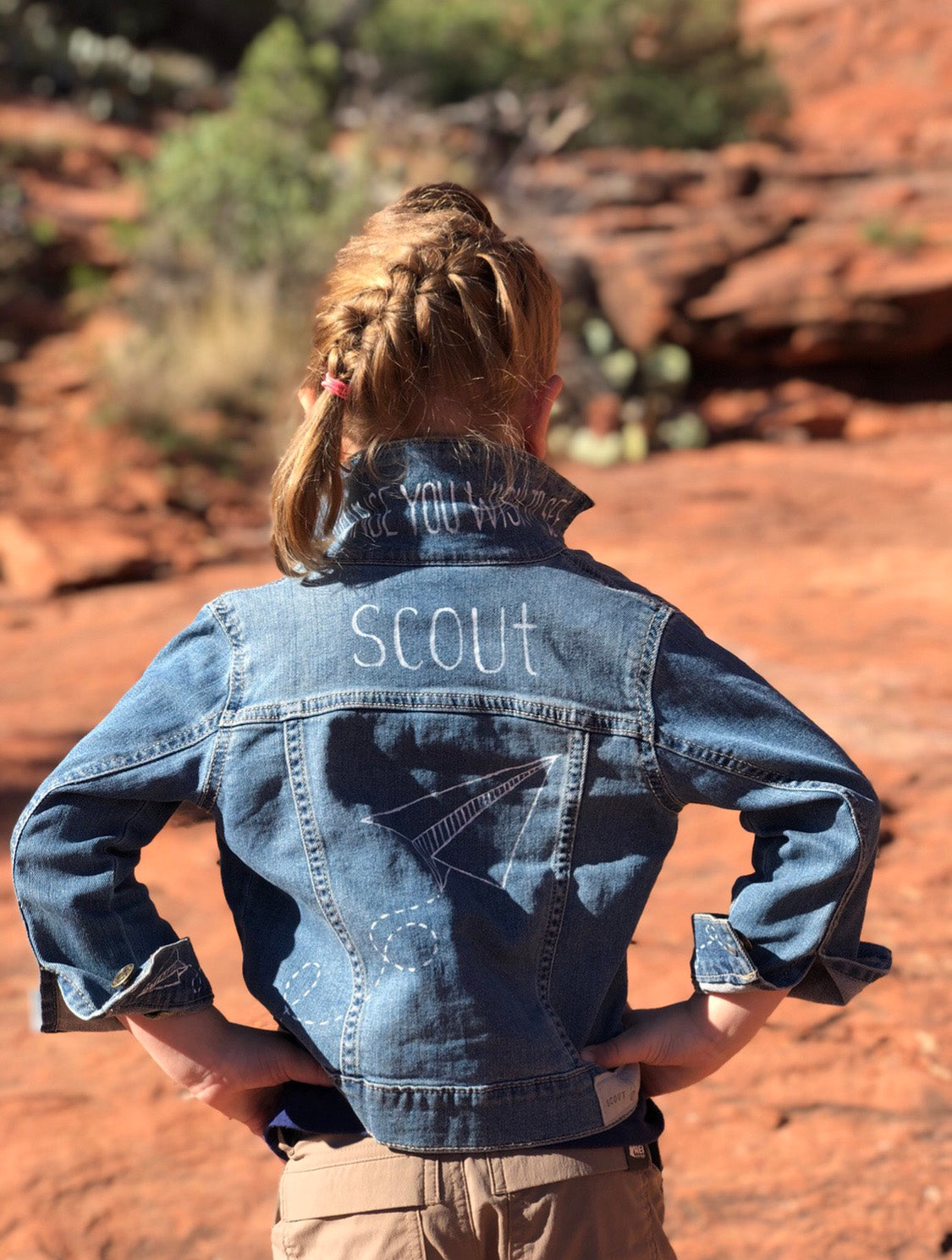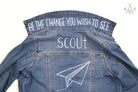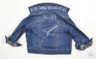 Jackets are upcycled so contact us at team@scoutandindiana.com and/or leave us a note at check out if you have a specific request regarding type/cut/wash of jacket. This classic wardrobe essential captures the whimsy of childhood with a handpainted paper airplane looping through the air. The jacket can be personalized with your child's name on the upper back panel. The insides of the cuffs also have some handpainted swirling paper airplane accents. A popped collar reveals the phrase ' Be The Change You Wish To See' , handpainted in a simple modern hand writing - this can also be customized or changed.
