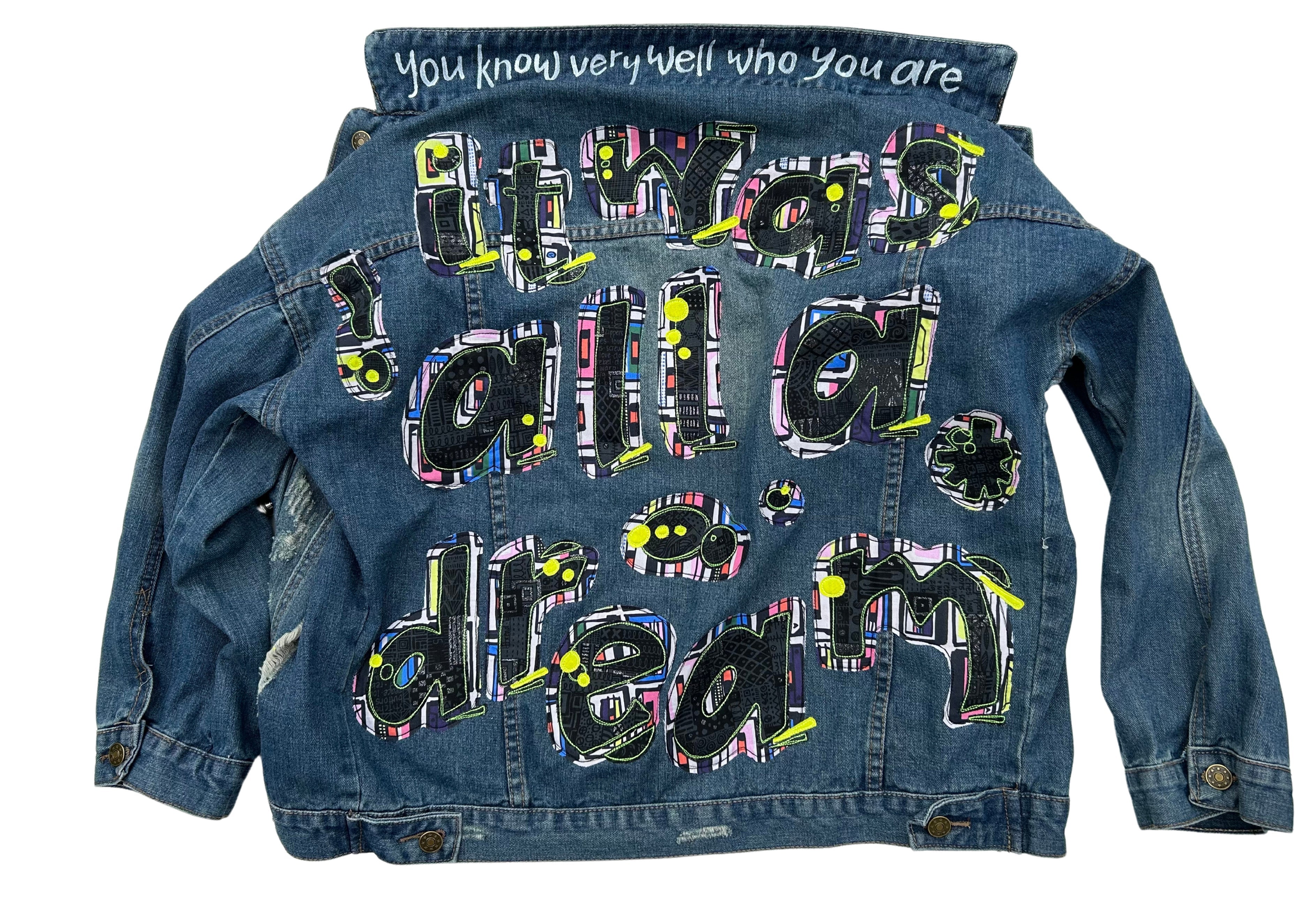 women's graffiti machine embroidered upcycled denim jacket: it was all a dream, relaxed fit