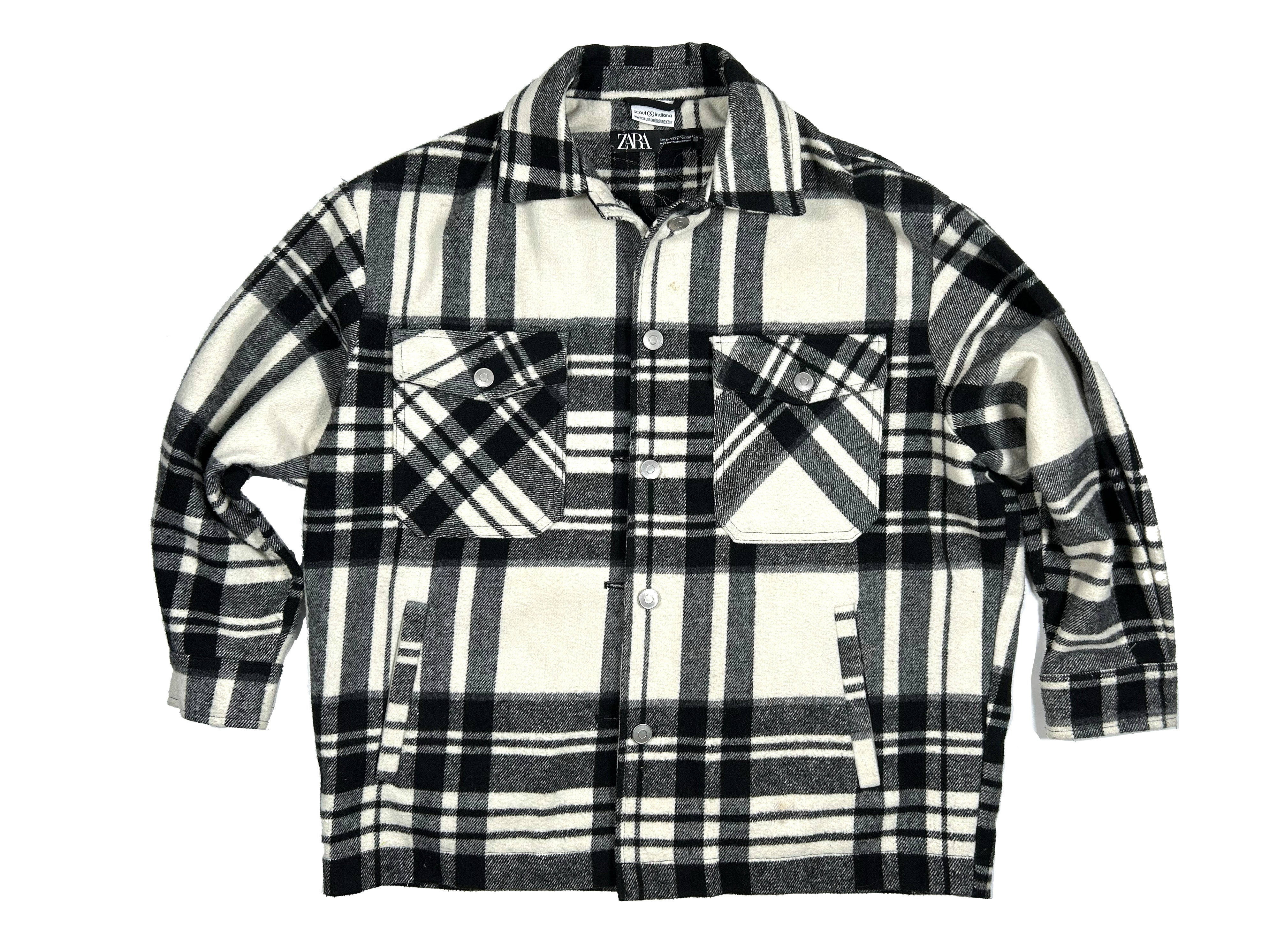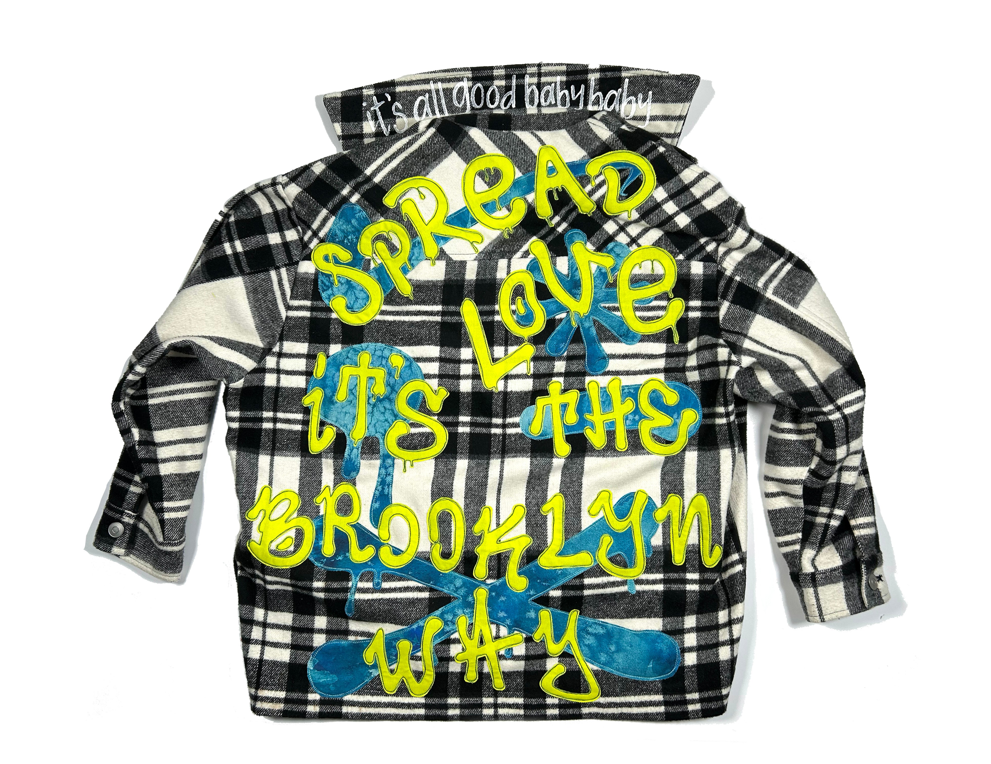 This is an upcycled Zara plaid flannel shirt jacket in a size S. It is a thick flannel in a black and white plaid pattern. It is an oversized fit with two top load and two side load pockets. It is 68% polyester, 24% acrylic, 6% wool, and 2% other fibers and has button closure. The back back panel has machine appliqué graffiti that reads 'spread love, it's the Brooklyn way' made up of various quilt shop quality cottons. A popped collar reveals the phrase ' it's all good baby baby' (Biggie Smalls) in a modern hand painted font.