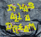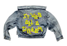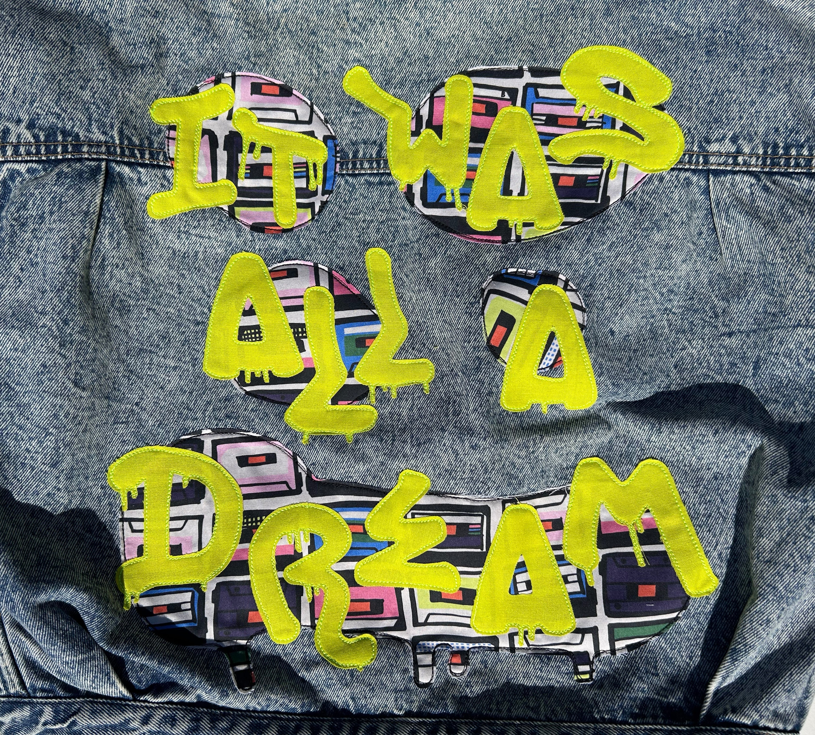 women's graffiti machine embroidered upcycled denim jacket: it was all a dream, vintage acid wash