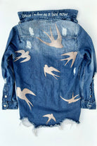 women's machine appliquéd upcycled denim jacket: sparrows 2