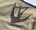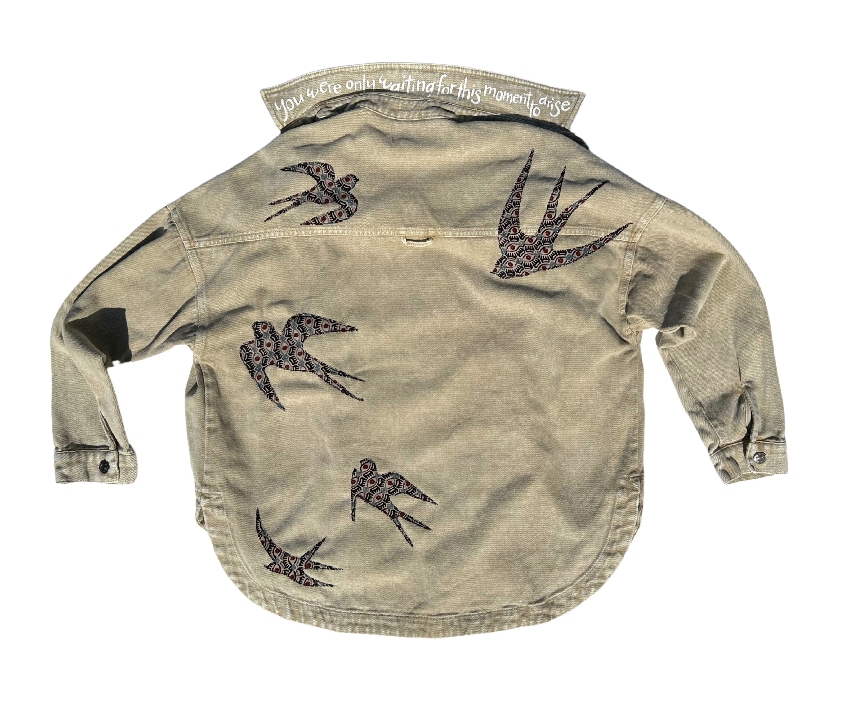 This is an upcycled Mustard Seed denim shirt jacket in size S. It is a tan wash in a relaxed fit in a oversized shirt style. It is 100% cotton and has snap closure and two top load pockets. The entire back panel has machine appliqué sparrows cut out of a cotton print made by Indian artisans and sourced in France. One also spans over the left shoulder and one is coming out of the left front pocket. A popped collar reveals the phrase ' you were only waiting for this moment to arrive' (Beatles) in a modern hand painted font.