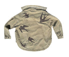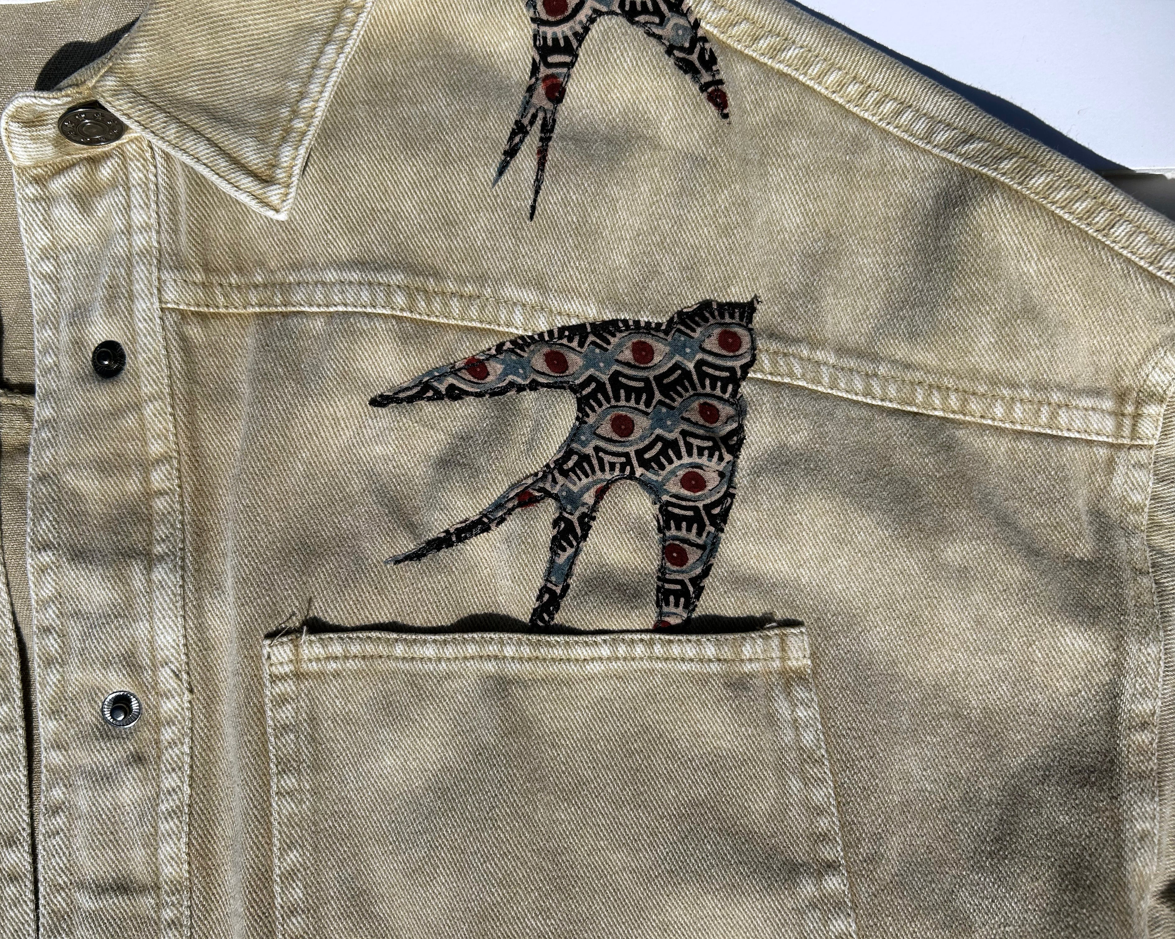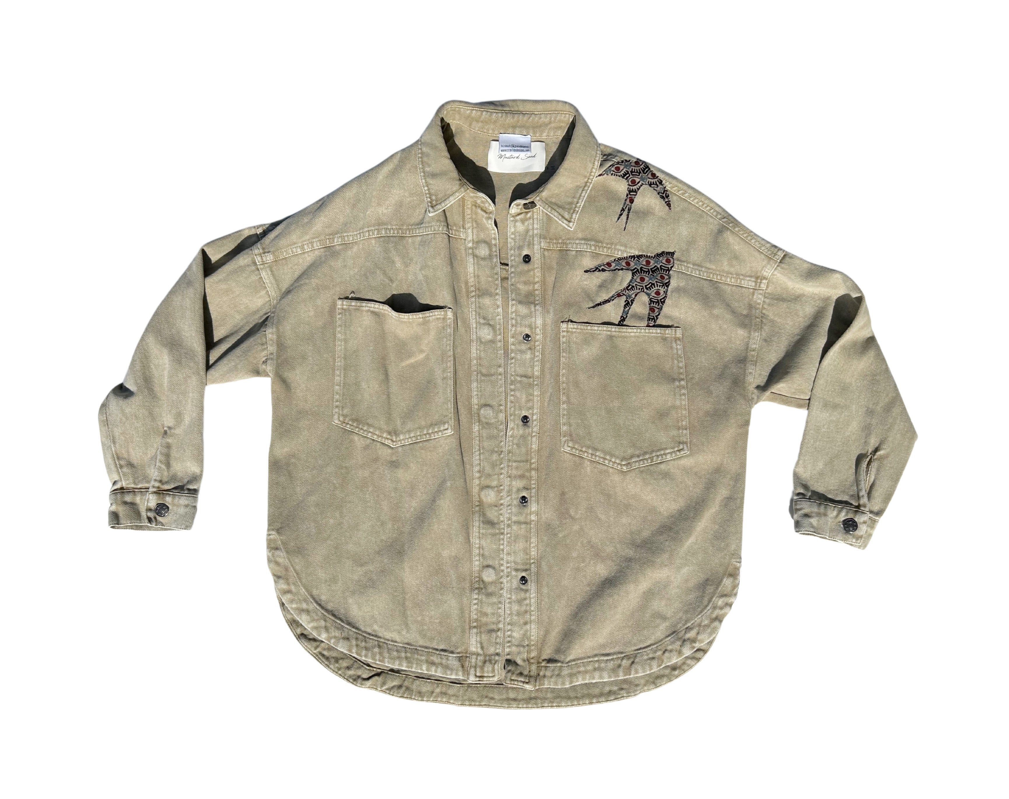 women's machine appliquéd upcycled denim shirt jacket: sparrows