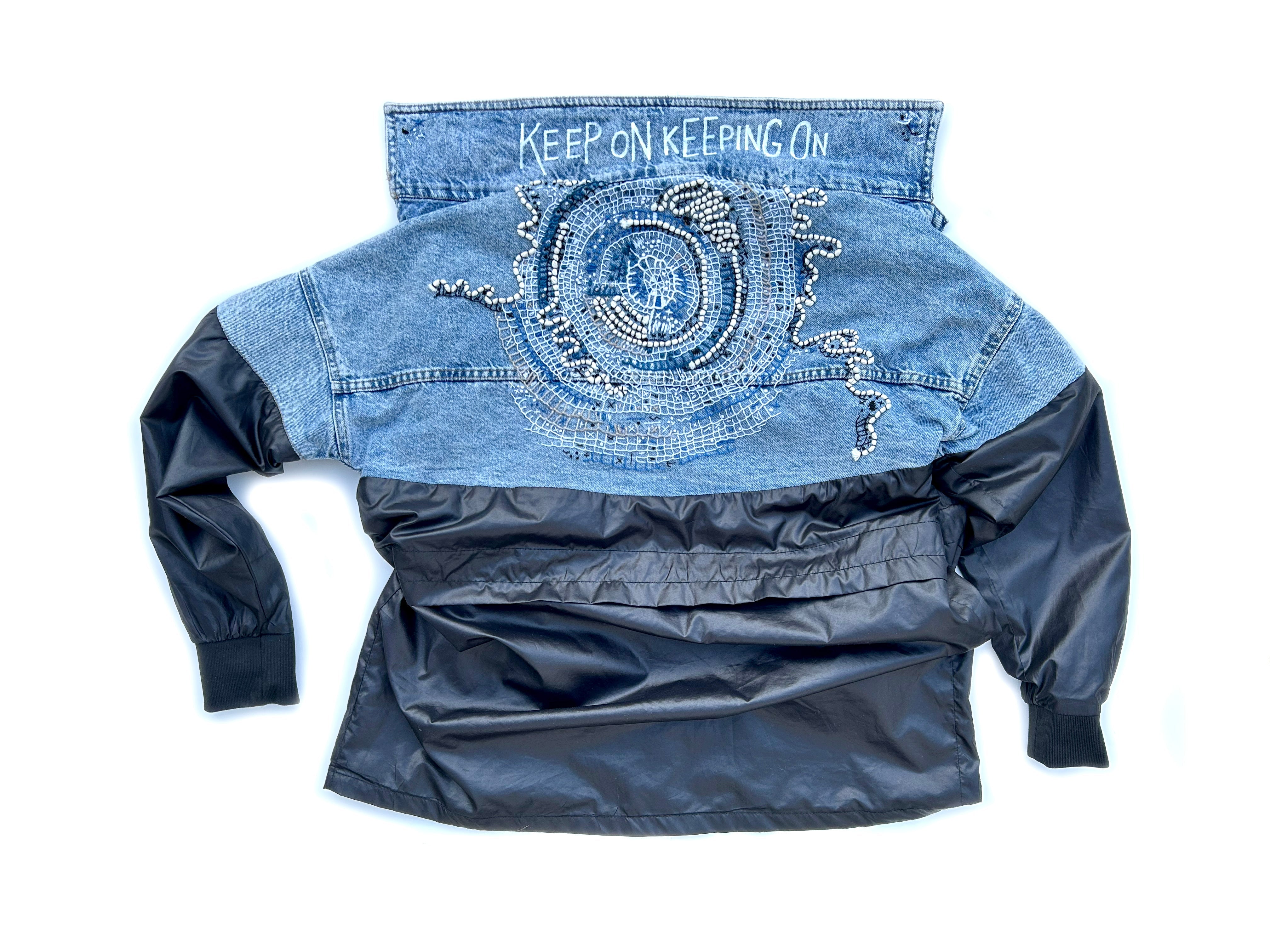 This is an upcycled half wind breaker, half denim, Flam mode jacket, size L. Sourced in Prague, the top half is 100% cotton, with hand stitched cotton embroidery. The bottom section is a black 100% polyester fabric. The denim section is a button closure with top load breast pockets. The bottom, polyester portion is a zipper closure. A popped collar reveals the phrase "Keep on keeping on" (Bob Dylan).