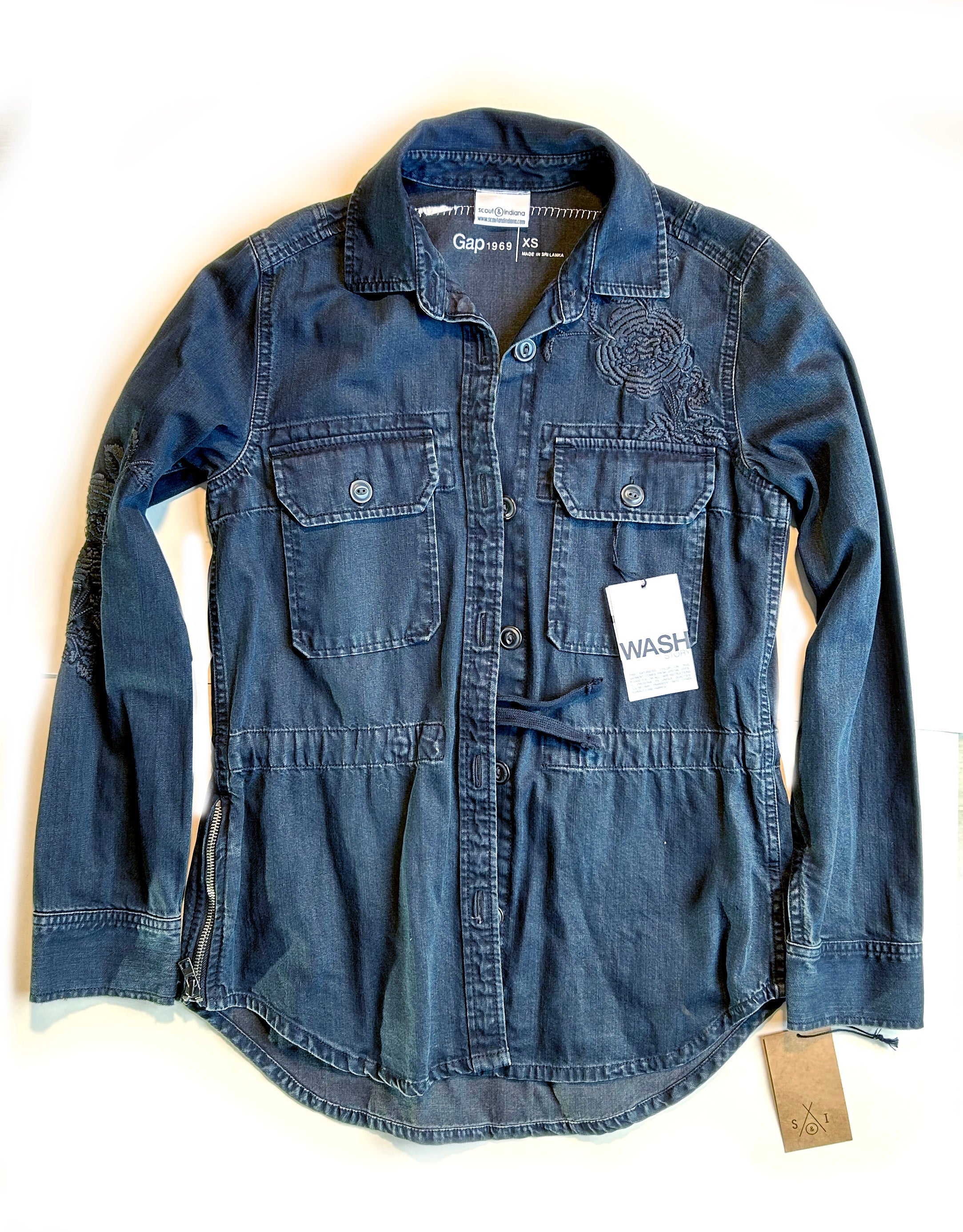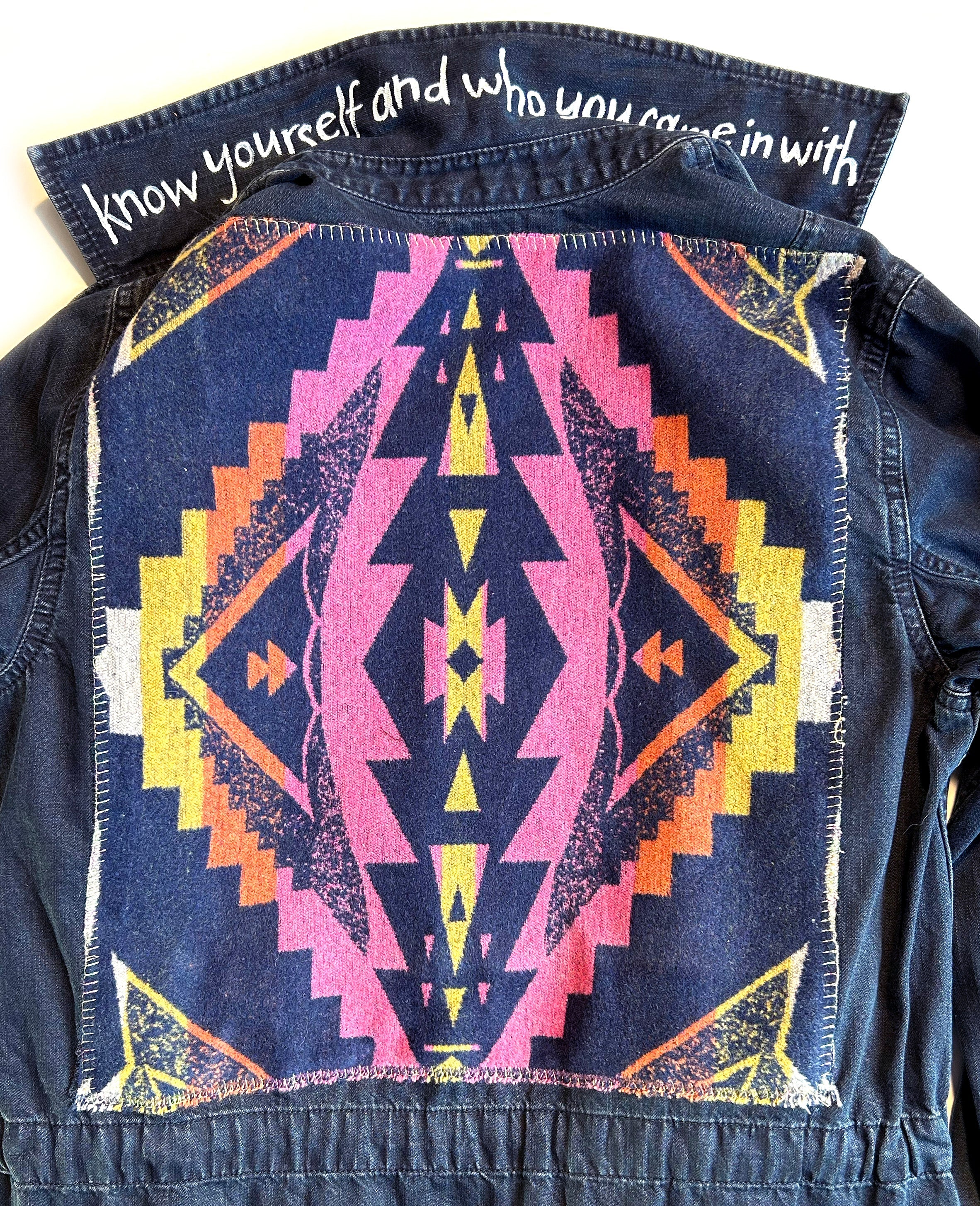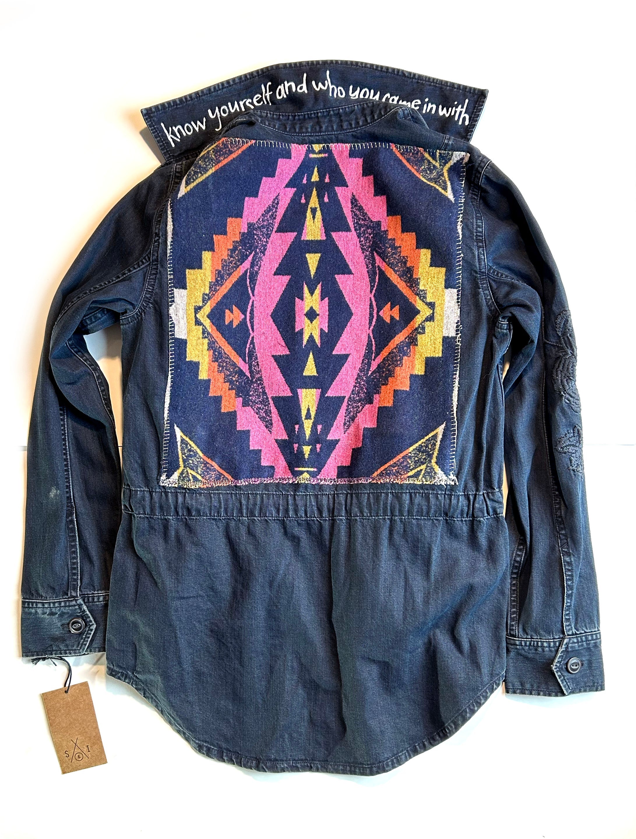This upcycled Gap 1969 denim jacket is a size XS.  It is a shirt coat style so the fit is relaxed and adjustable with a drawstring in the inside waist area.  A popped collar reveals the phrase "know yourself and who you came in with" (Rainbow Kitten Surprise).  The center back panel features an upcycled remnant from a Southwestern wool blanket.  There is a button closure, two top load pockets, and zippers at the sides under the waist adjuster.  There is some floral black lace like appliqué on the sleeves and above the front right pocket.  It is 100% cotton.
