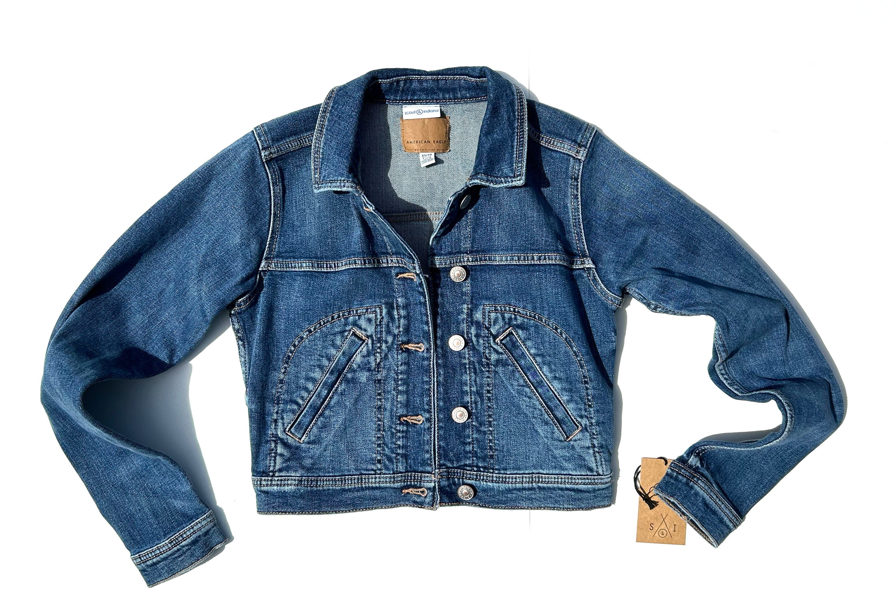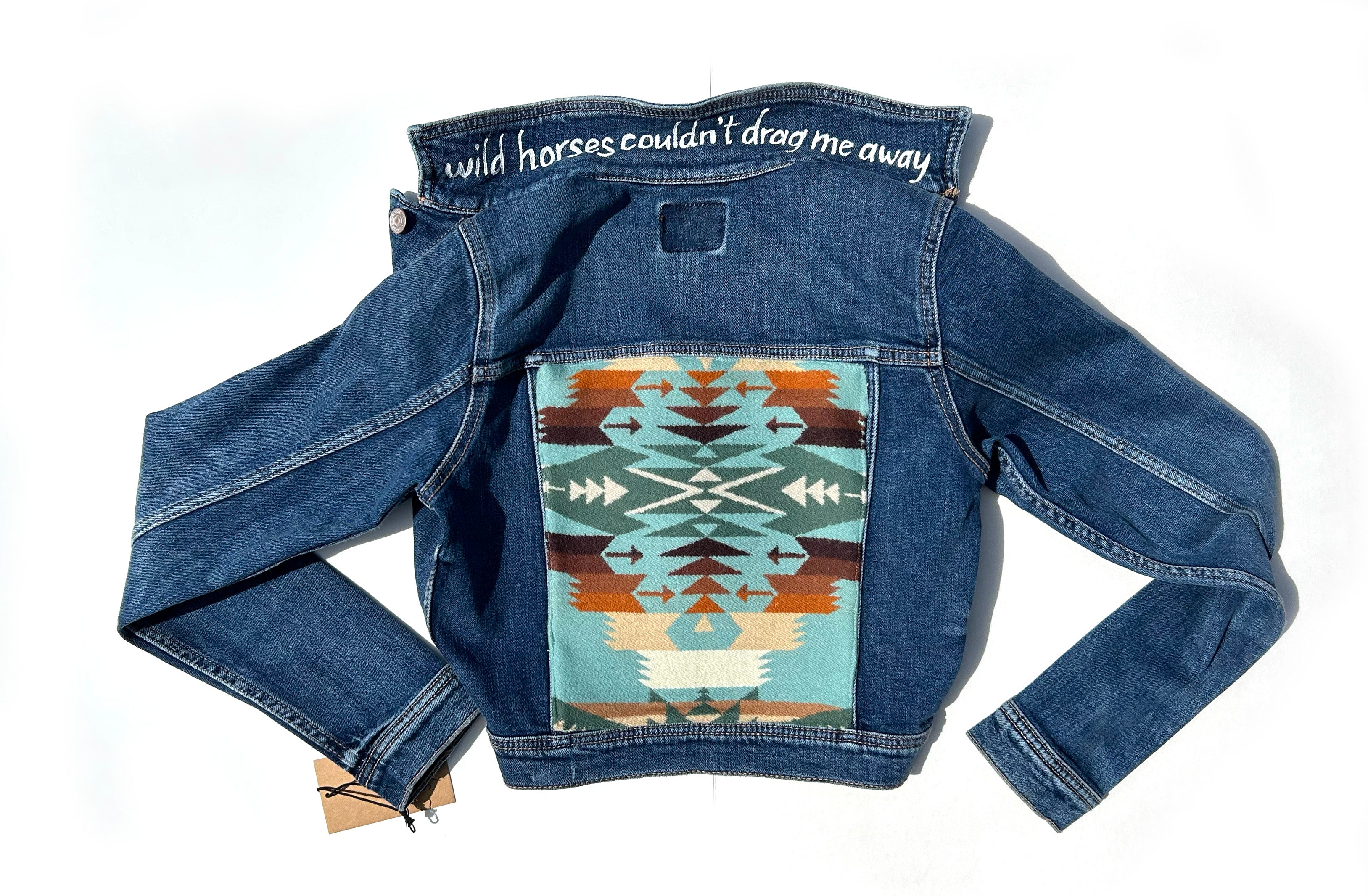This upcycled American Eagle denim jacket is a size XS. It is a medium/dark wash in a cropped fit. A popped collar reveals the phrase "wild horses couldn't drag me away" (Rolling Stones). The center back panel features an upcycled remnant from a Southwestern wool blanket. There is a button closure and two side load pockets. It is 98% cotton, 1% elastane, and 1% other finer.