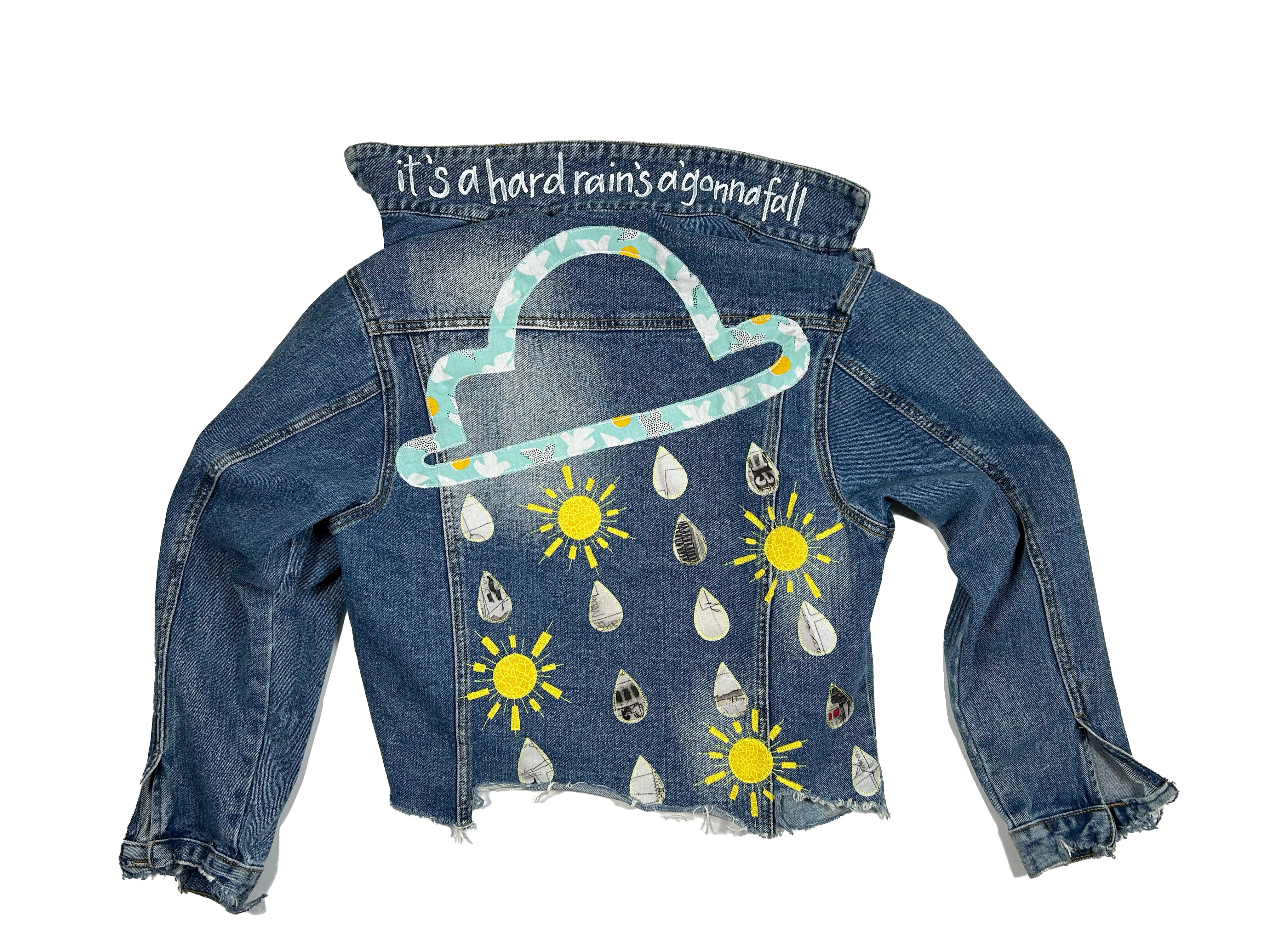This is an upcycled iW!ngStudio denim jacket in a size S. It is a mid wash with some fading throughout and some distressing on the bottom edge and cuffs. The fit is traditional, almost relaxed. It is 100% cotton and has button closure. There are two side load pockets and two top load pockets. The back back panel has machine appliqué graffiti style cloud with rain and suns design, created with various quilt quality cottons. The popped collar reads 'it's a hard rain, that's gonna fall' (Bob Dylan).