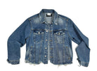 women's upcycled graffiti style machine appliquéd denim jacket: a hard rain is gonna fall