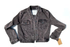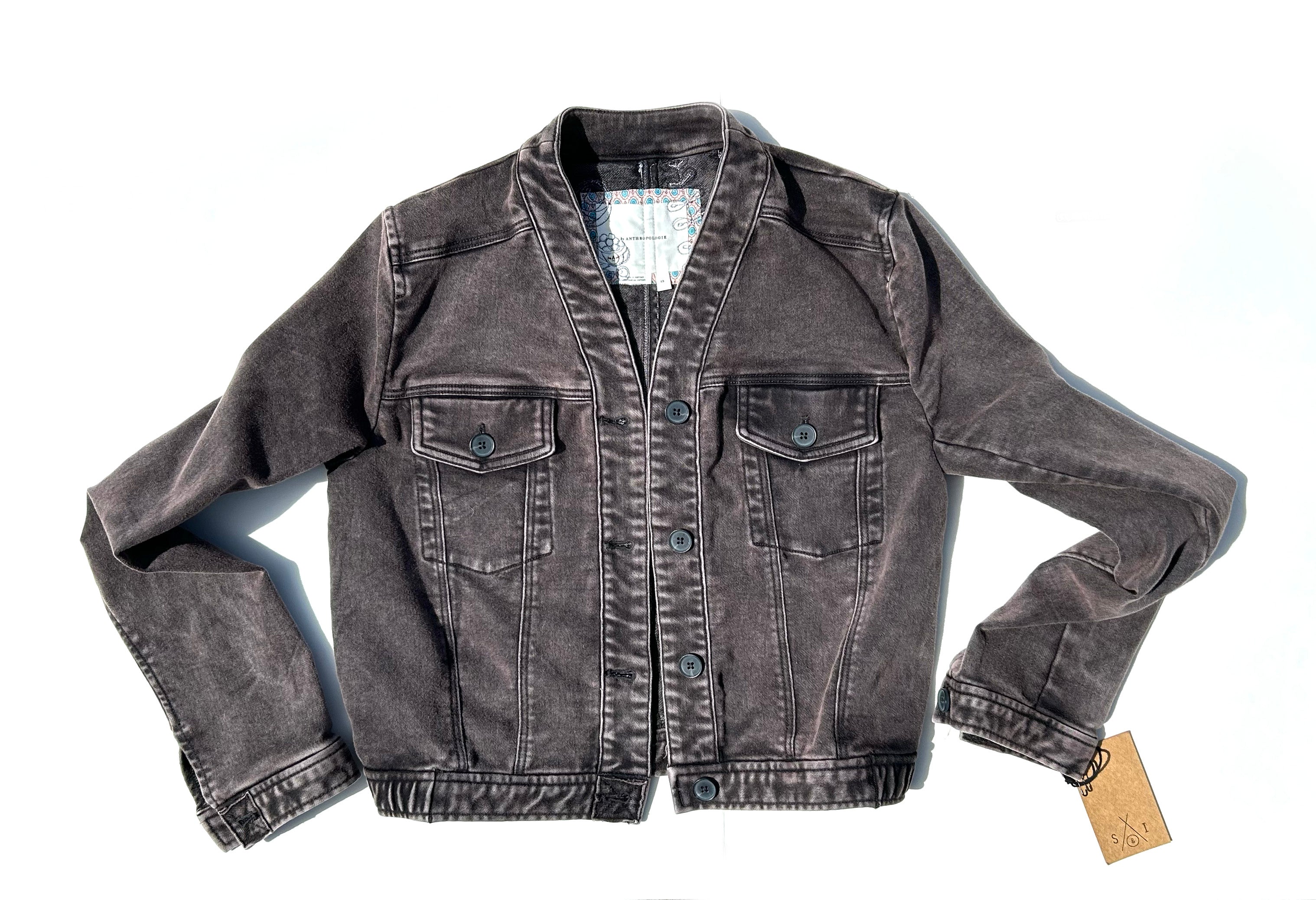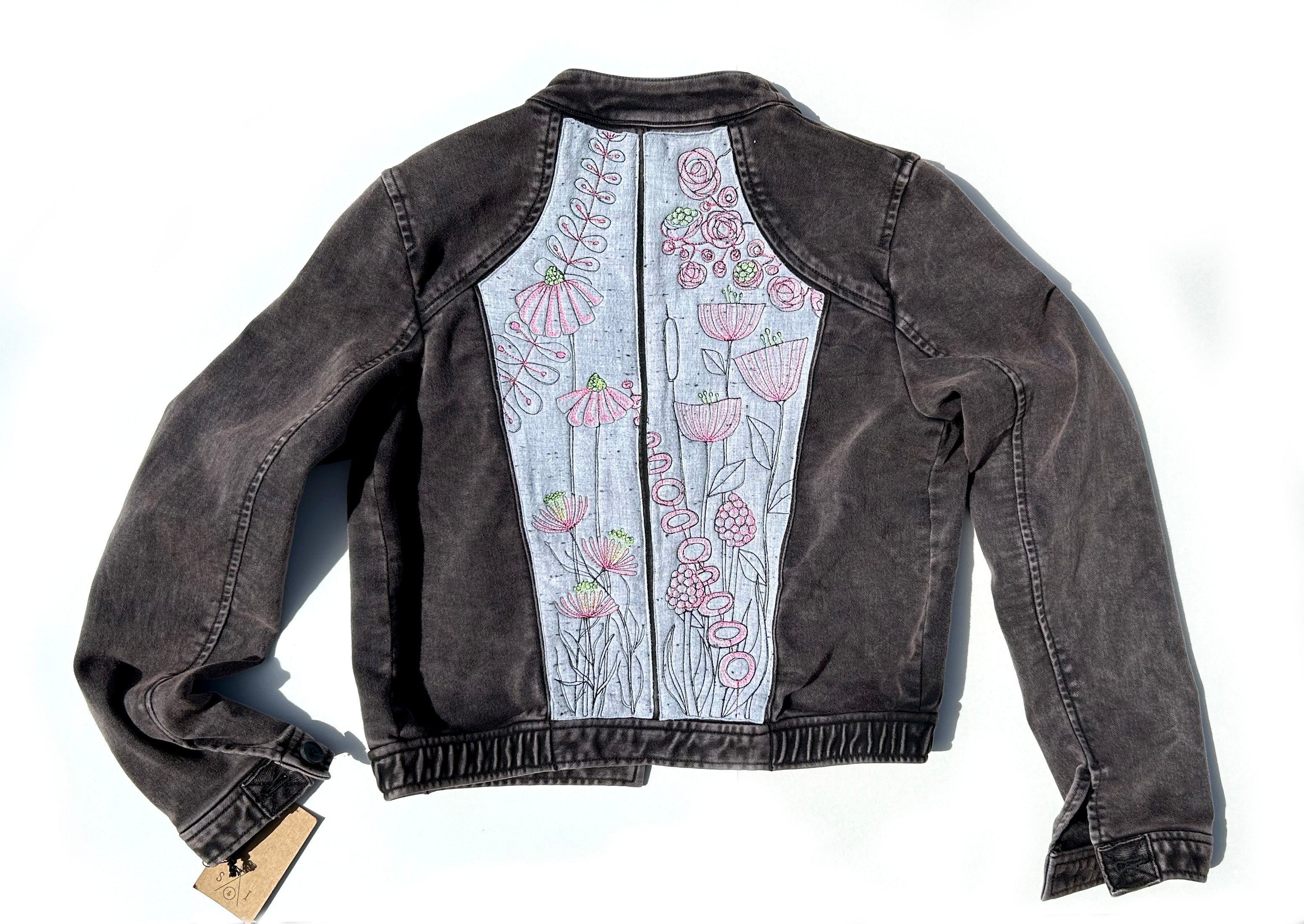 This is an upcycled Anthropology dark greyish cotton jacket, size XS. The jacket has two top load breast pockets; it is 80% cotton, 18% polyester, 2% elastane. It is a fitted jacket with button closure. The back features two upcycled mens shirting panels with thread painted wildflowers in several thread colors.