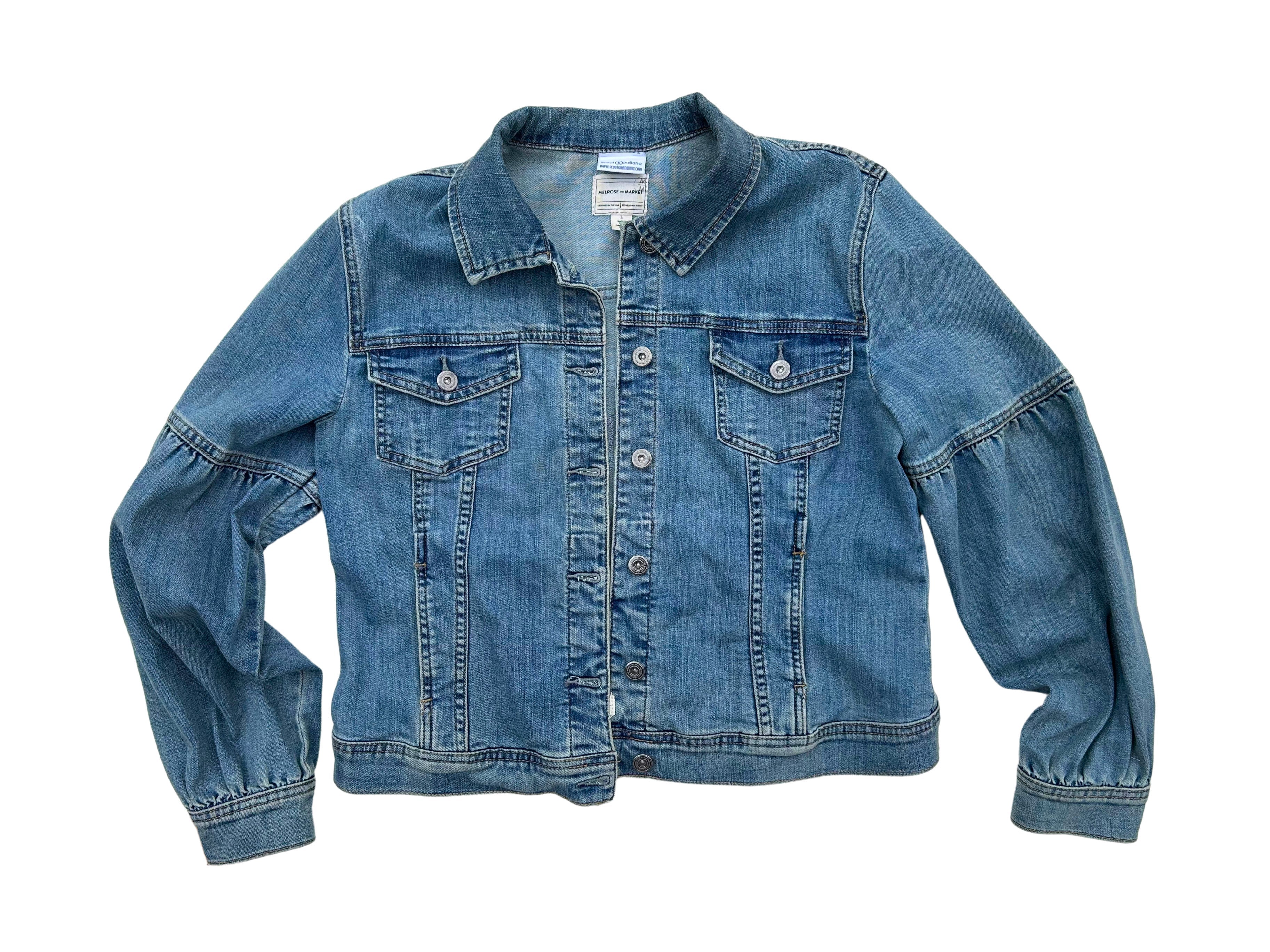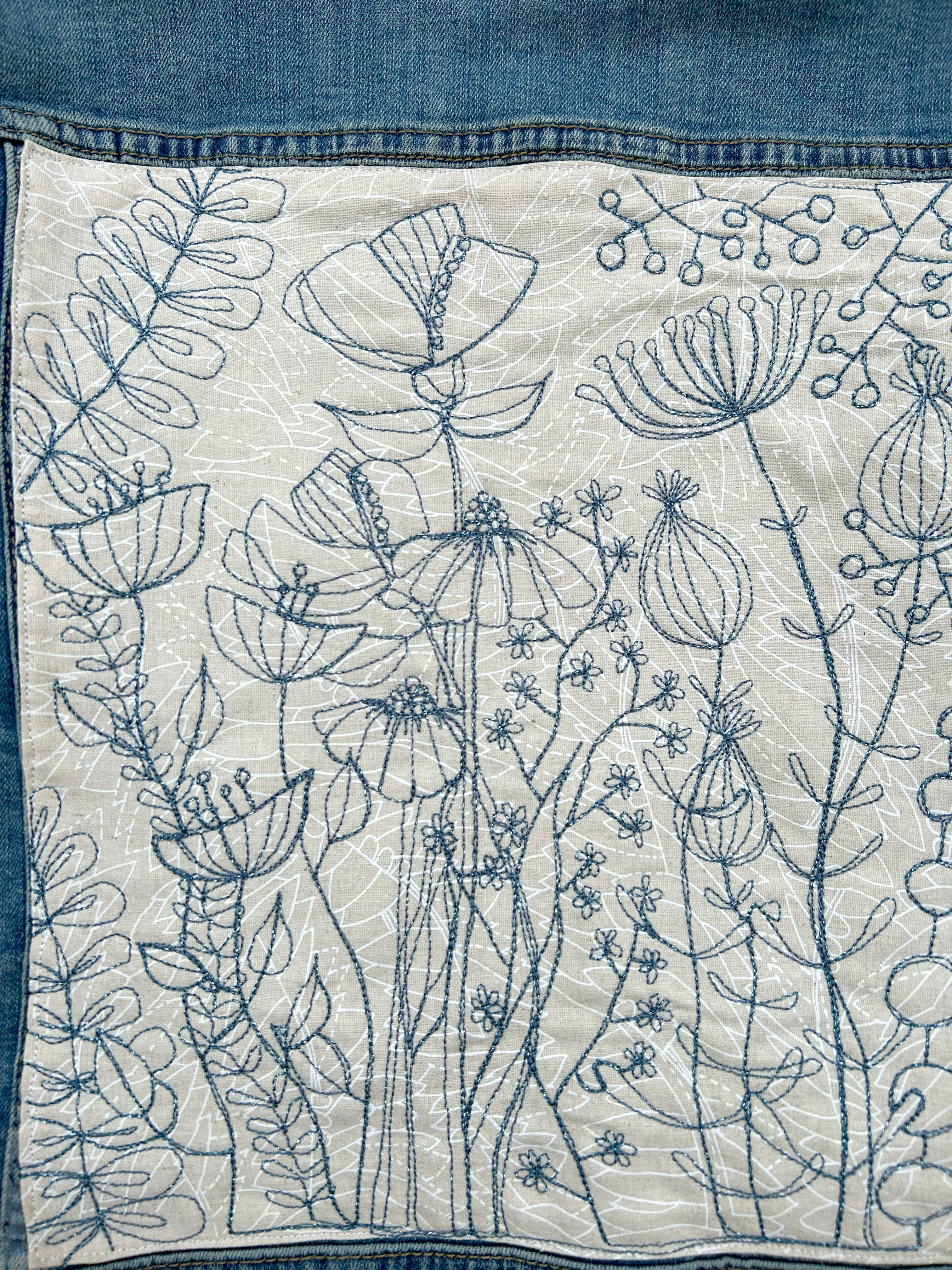 This is an upcycled women’s MelRose Market jacket, size L. It is a medium wash with a classic fit. The sleeves have an interested gathering around the biceps making it just a little different from your classic jean jacket. There are two top load breast pockets, two side load pockets, and a button closure. It is 79% cotton, 20% polyester, 1% elastane. The back panel features a linen blend in a light tan/natural color print with thread painted wildflowers in a blue rayon thread with metallic flecks.