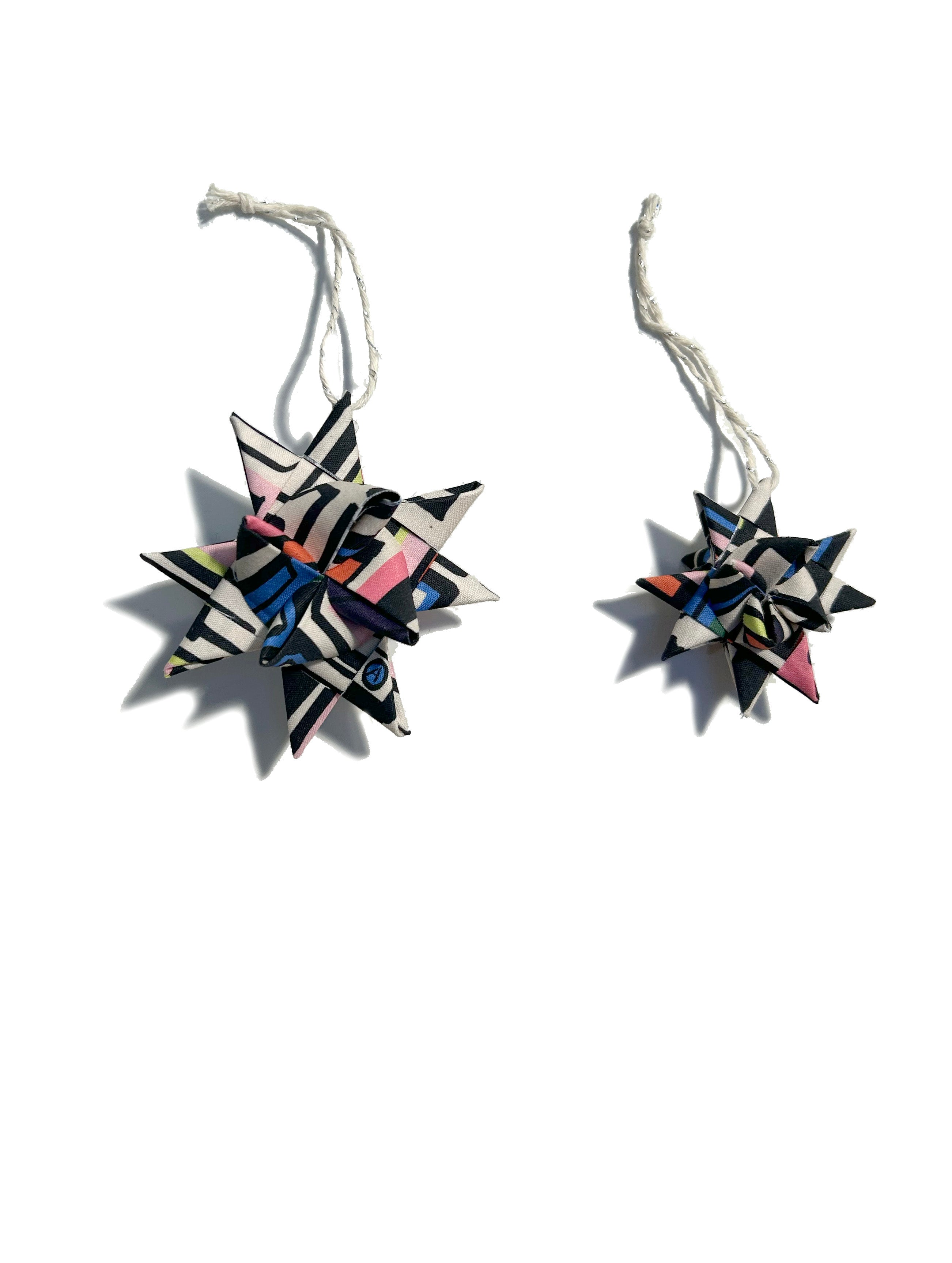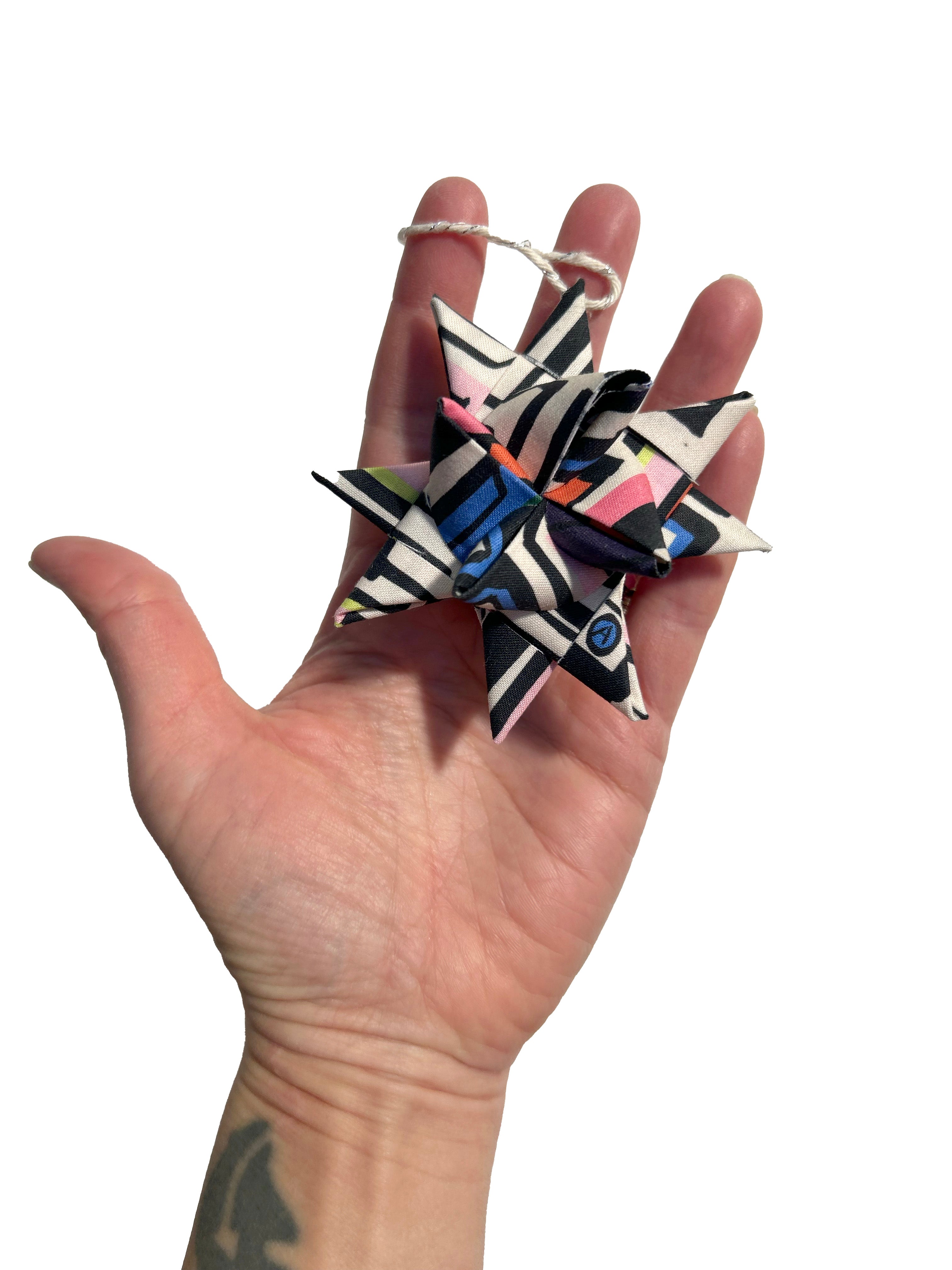 These 3D German (or Froebel) stars are hand folded from stabilized quilt shop quality cotton. They are stiff and hold their shape so they can be hung on the tree, or anywhere else, and are beautiful from all angles. They come in two sizes, 3" (dimensions ~3"x3"x2") and 2" (dimensions ~2"x2"x1.5")