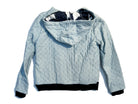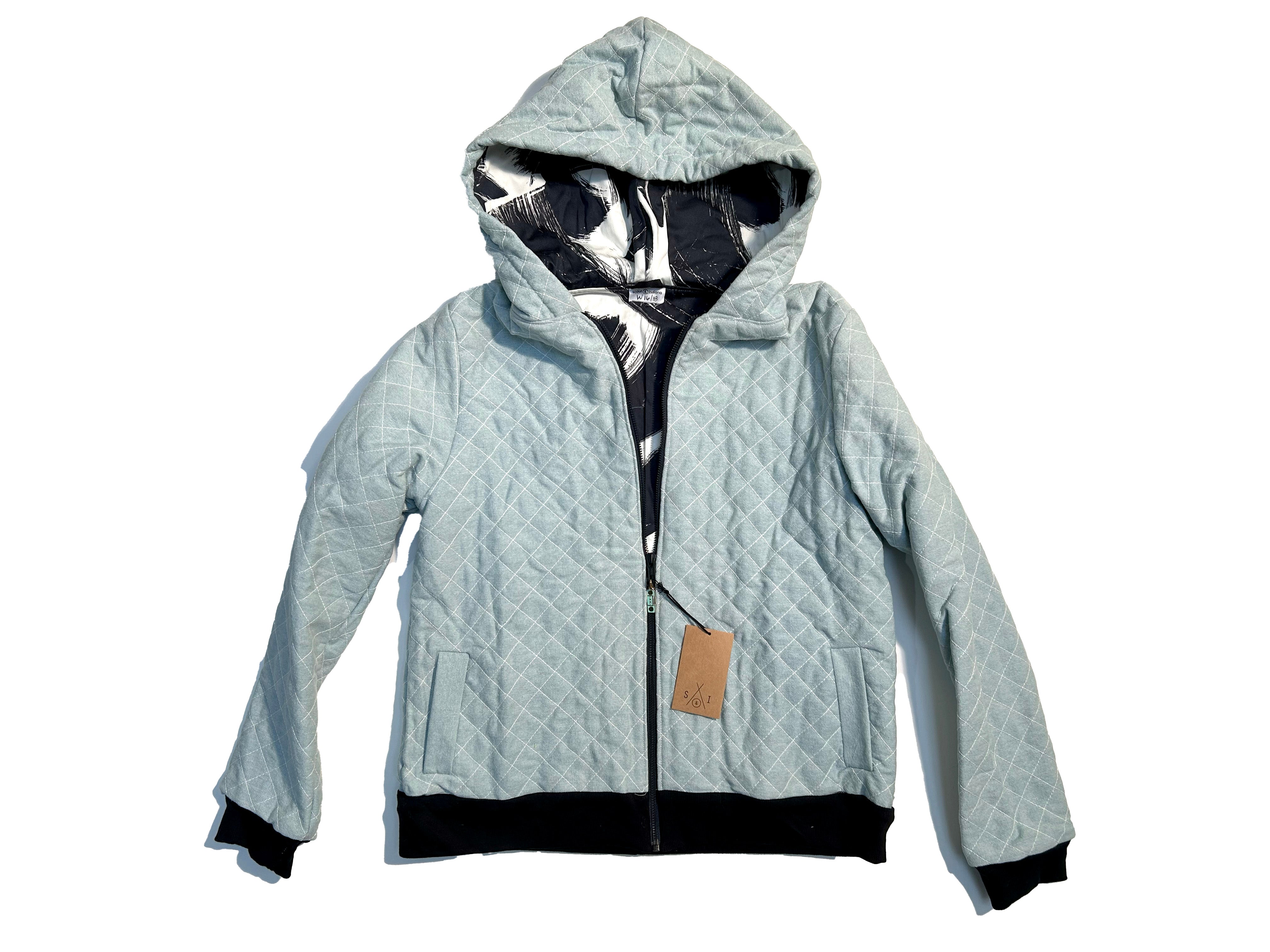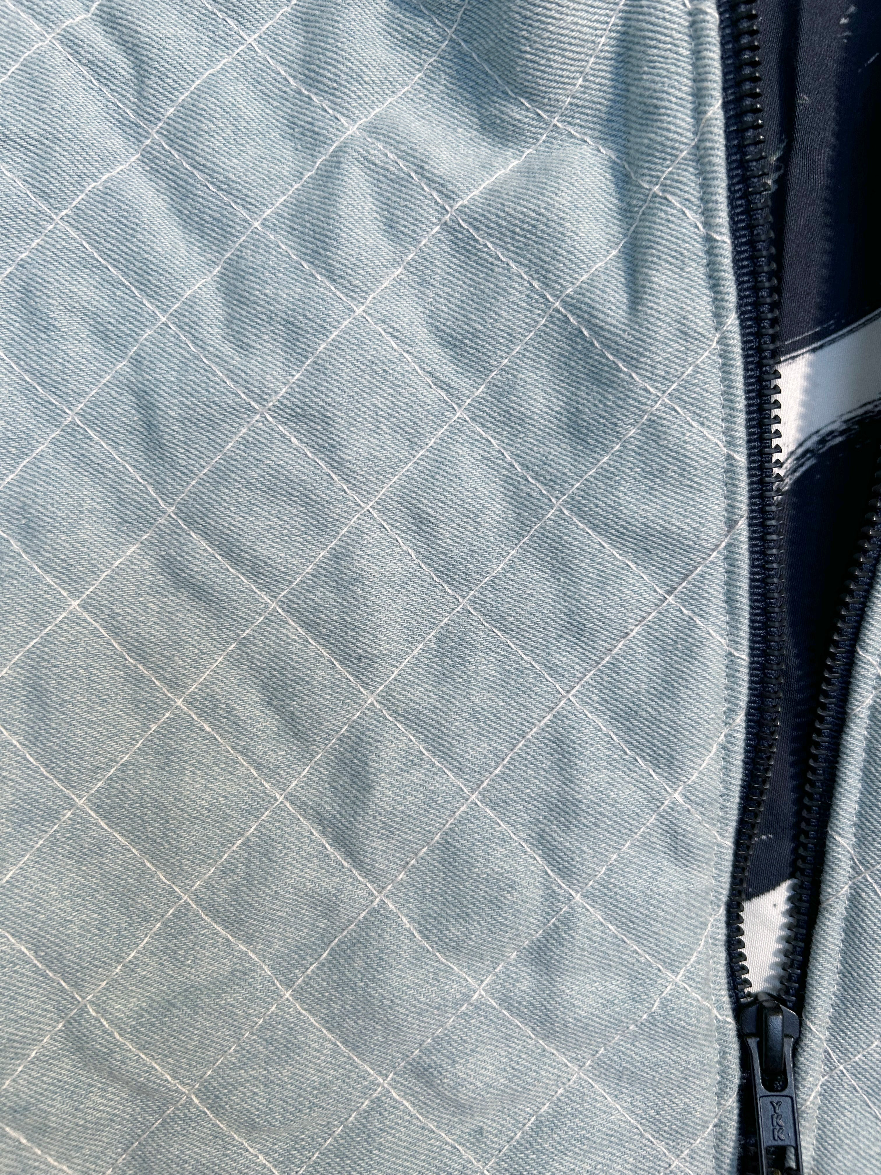 This bomber jacket is made of quilted light wash denim. The denim is broken in a rather soft, not stiff. The jacket is lined with a stretch cotton sateen with a black/white brush strokes design. It is a size 16/18 and has two side load pockets, elastic at the cuffs, and a zipper closure with a boombox zipper pull. Size 16/18 has a 40" bust, a 42" high hip, a sleeve length of 25.25", and a bodice length of 24".