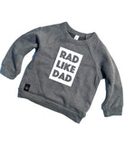 Deep heather gray fleece raglan crewneck sweatshirts are a blend of Polyester and Cotton. They are designed for maximum comfort and fit on kids of all sizes. Sweatshirts are preshrunk and produced in the USA with sustainable manufacturing processes and comprehensive recycling programs for paper waste and fabric scraps. Rad Like Dad decal is a matte white heat transfer. The graphic is professionally heat pressed on so that the sweatshirts hold up well to washing and the wear and tear of everyday kid life. For longest life, wash gentle cold and low dry inside out.