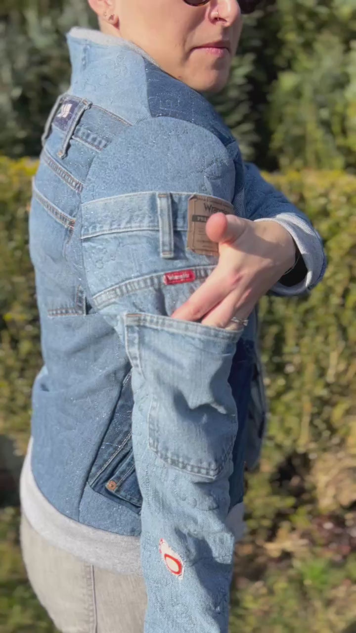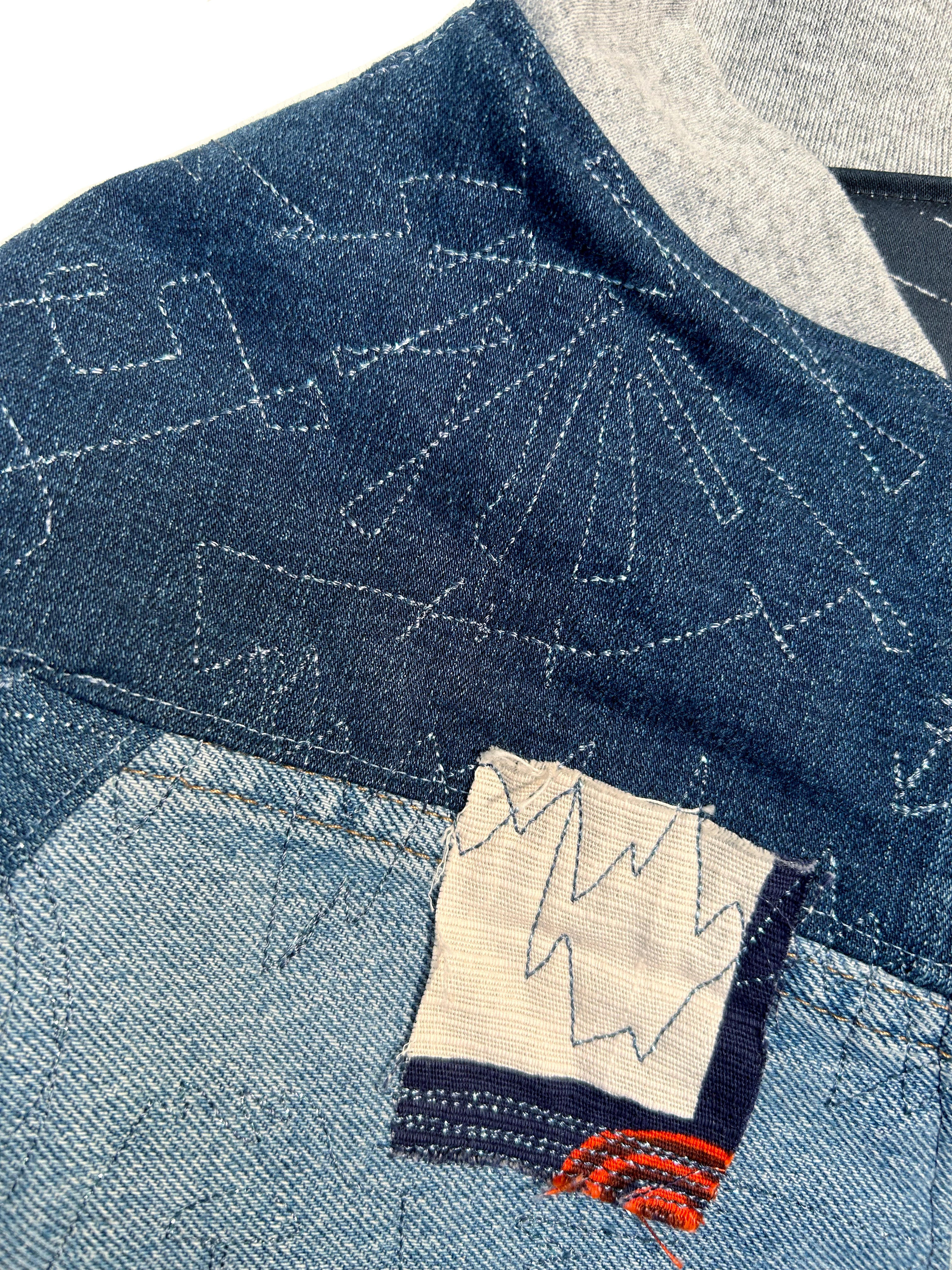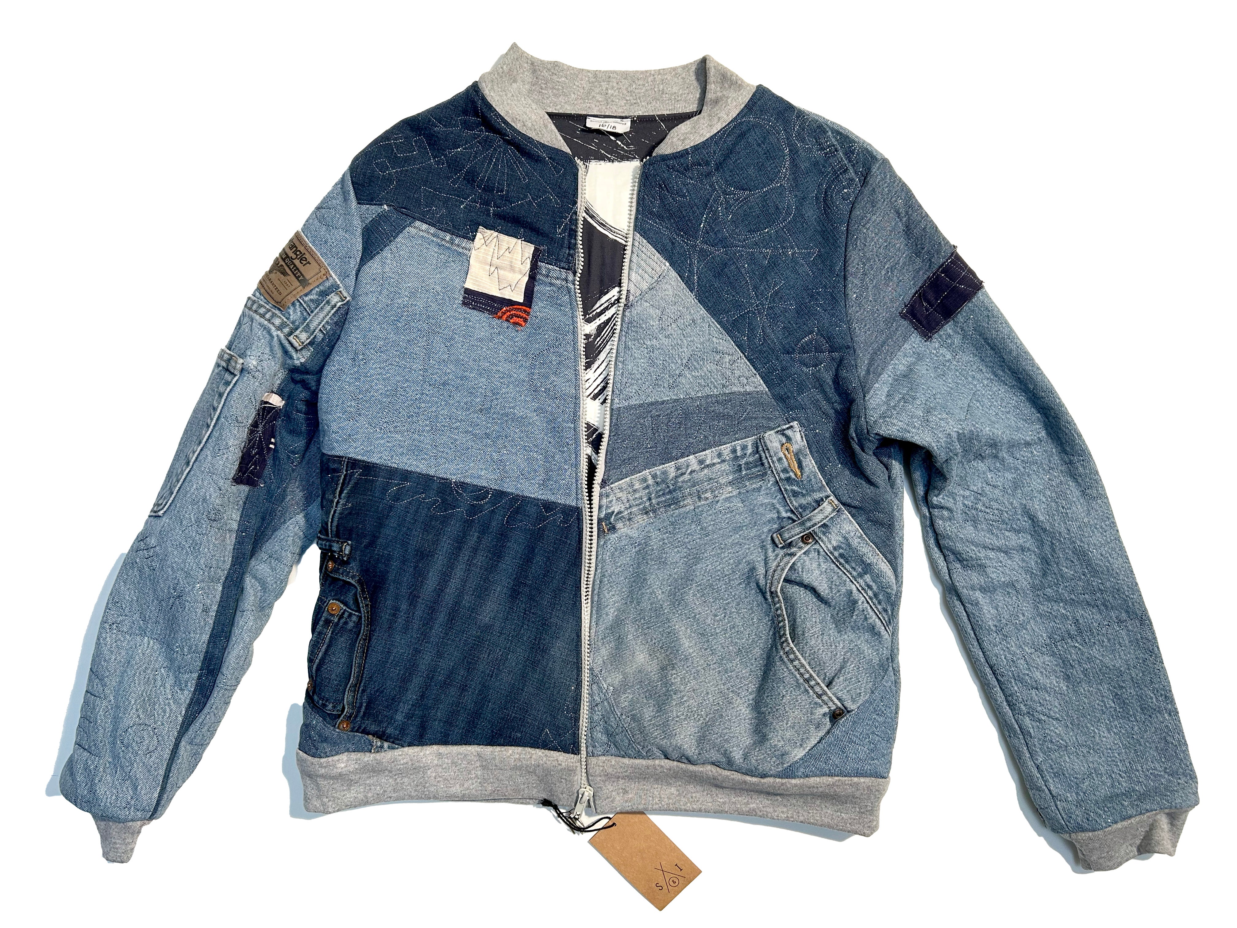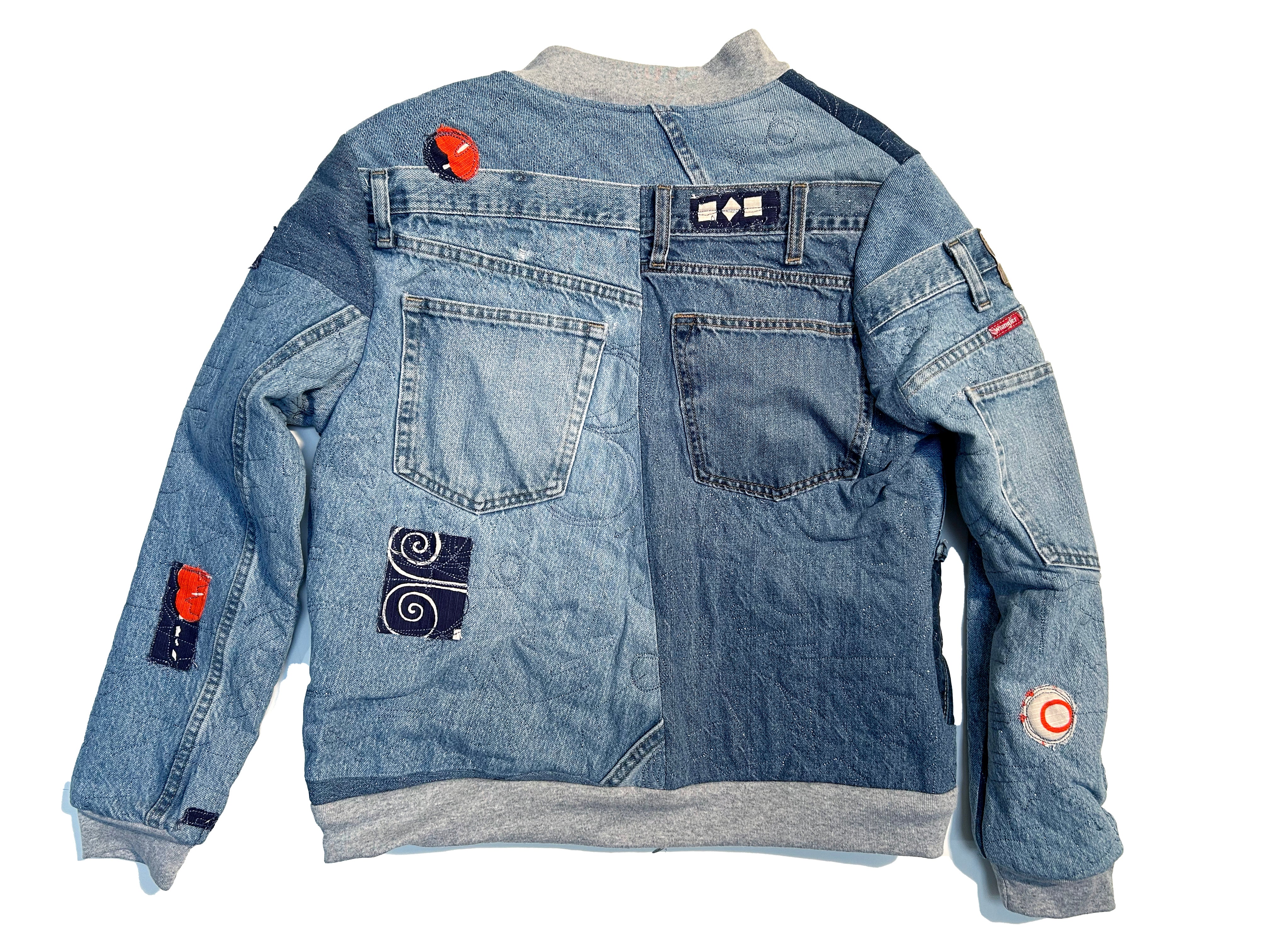 thread painted upcycled denim bomber jacket: patchwork denim & vintage fabric