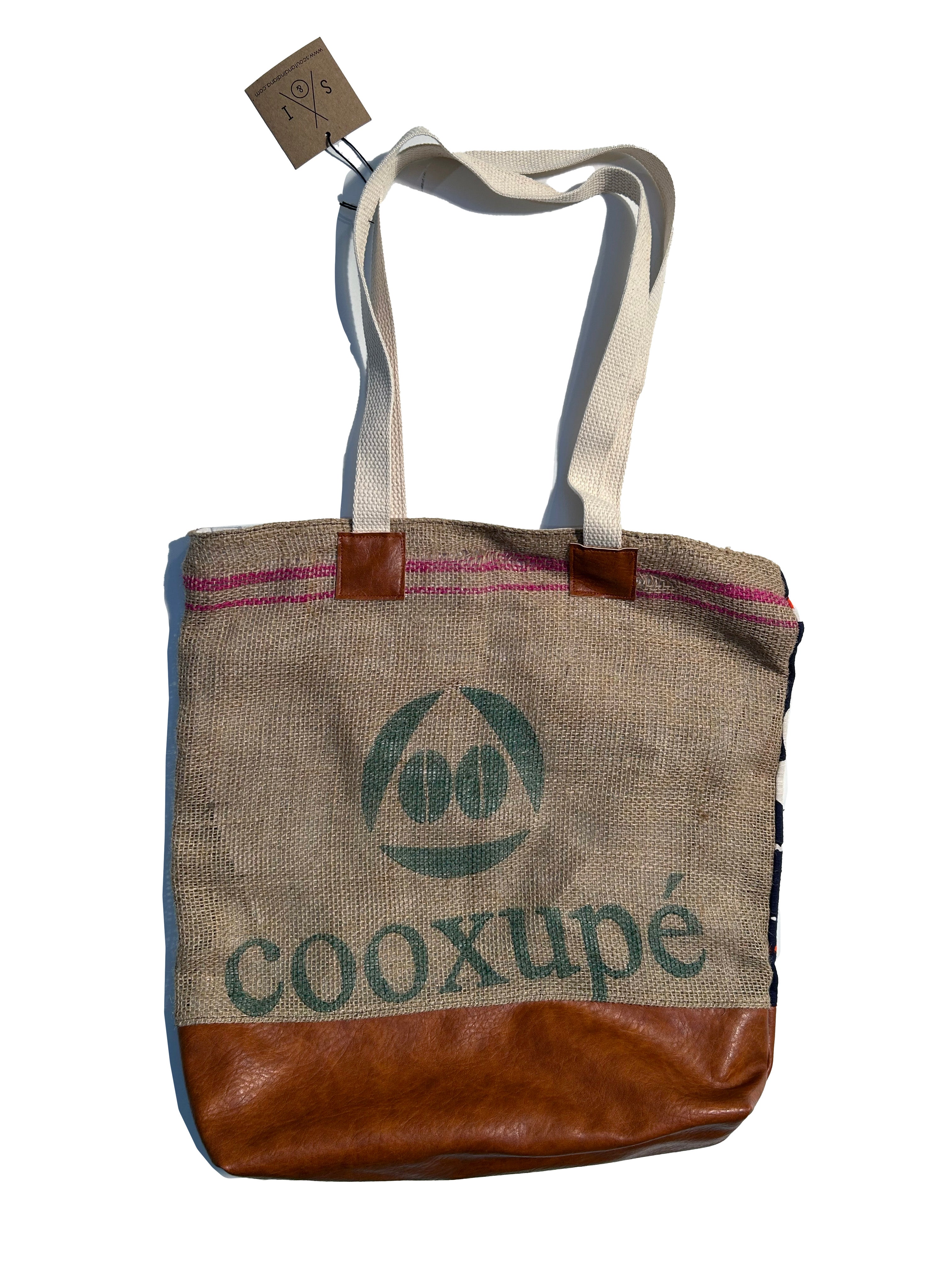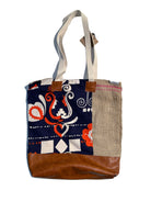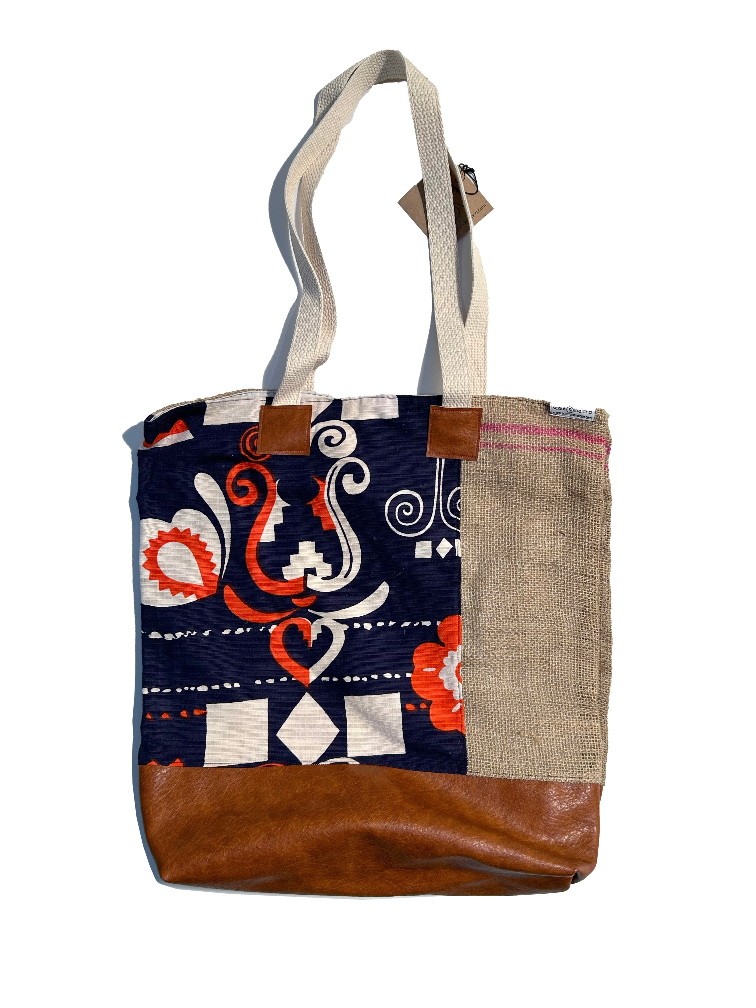 This tote bag is made of upcycled vintage fabric sourced during a visit to Prague, as well as upcycled coffee totes sourced during a visit to Rome. The bag itself is about 17" high, about 17" wide, and a 4.5-5" deep box bottom. There are cotton straps in a natural color and the lining is a white/gray cotton print.