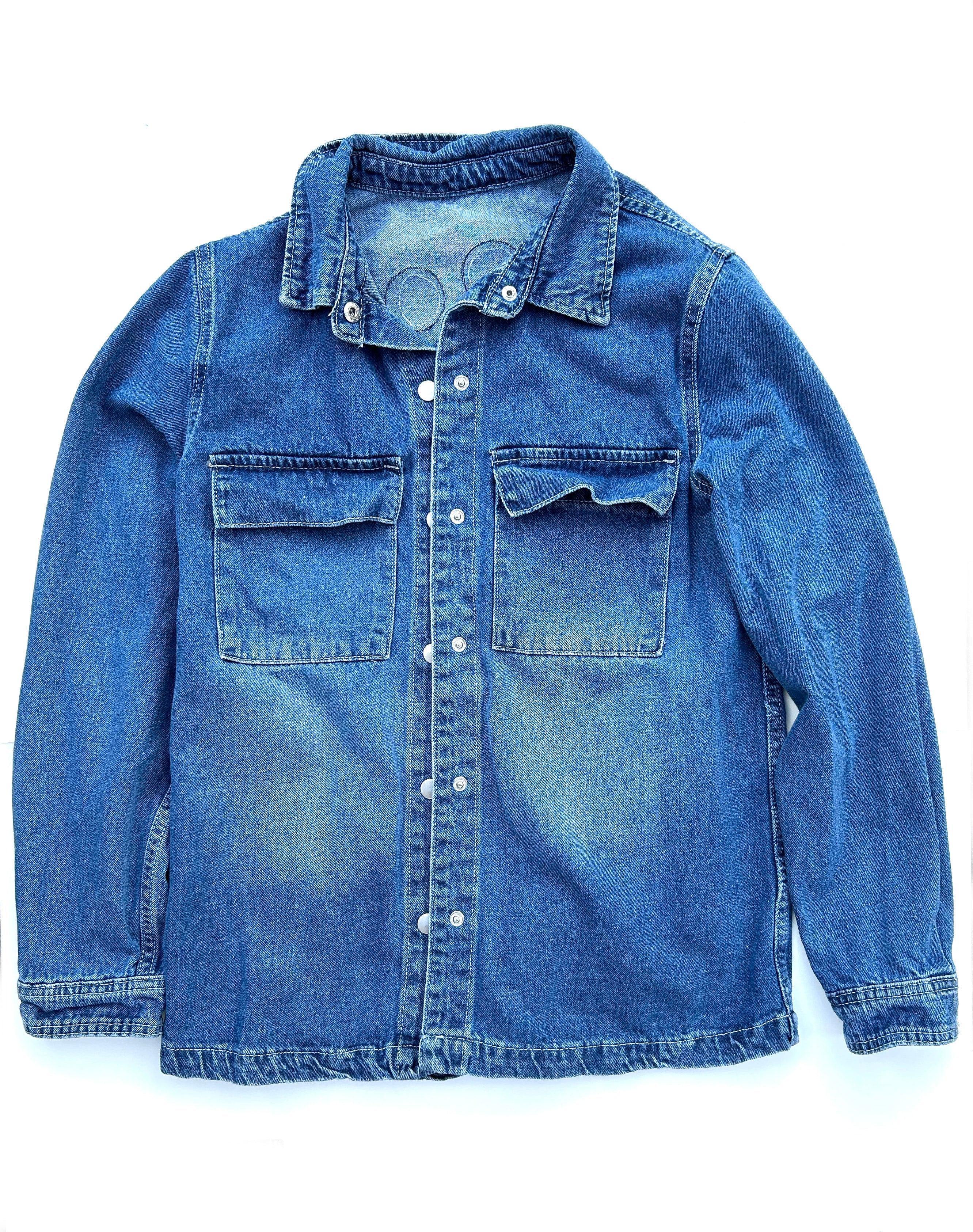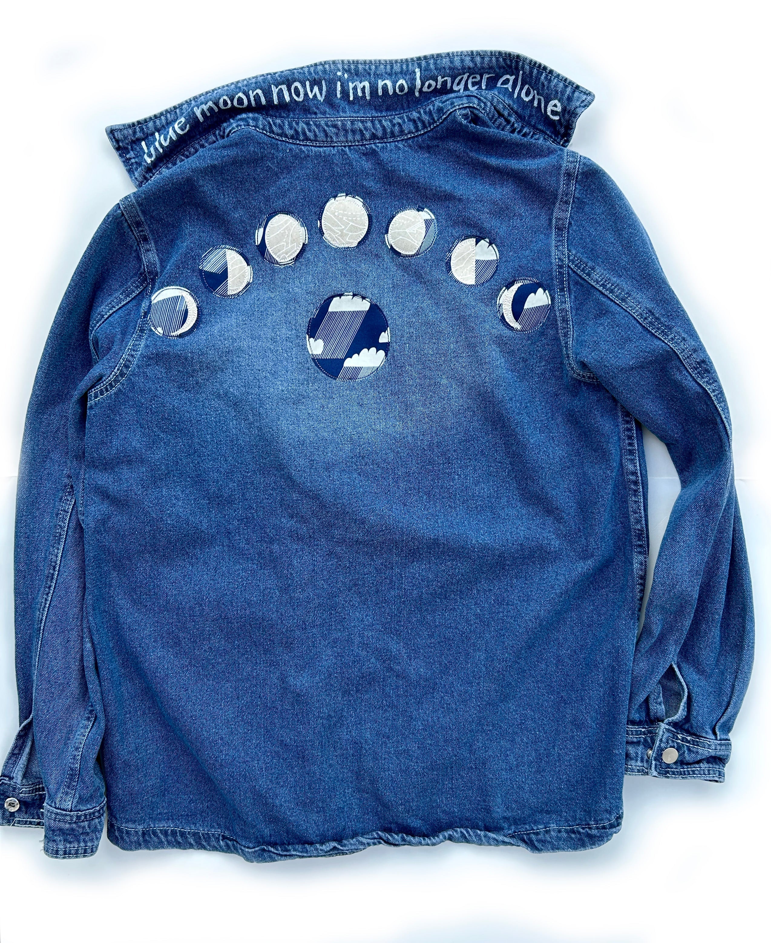 This is an upcycled unbranded denim shirt jacket, size S. It is a medium/dark wash with two top load breast pockets and snap closure. It is 100% cotton and on the thicker side. The back features machine appliquéd phases of the moon in natural, white, and blue fabrics. A popped collar reveals the phrase "blue moon, now I'm no longer alone" (Richard Rodgers/Lorenz Hart).