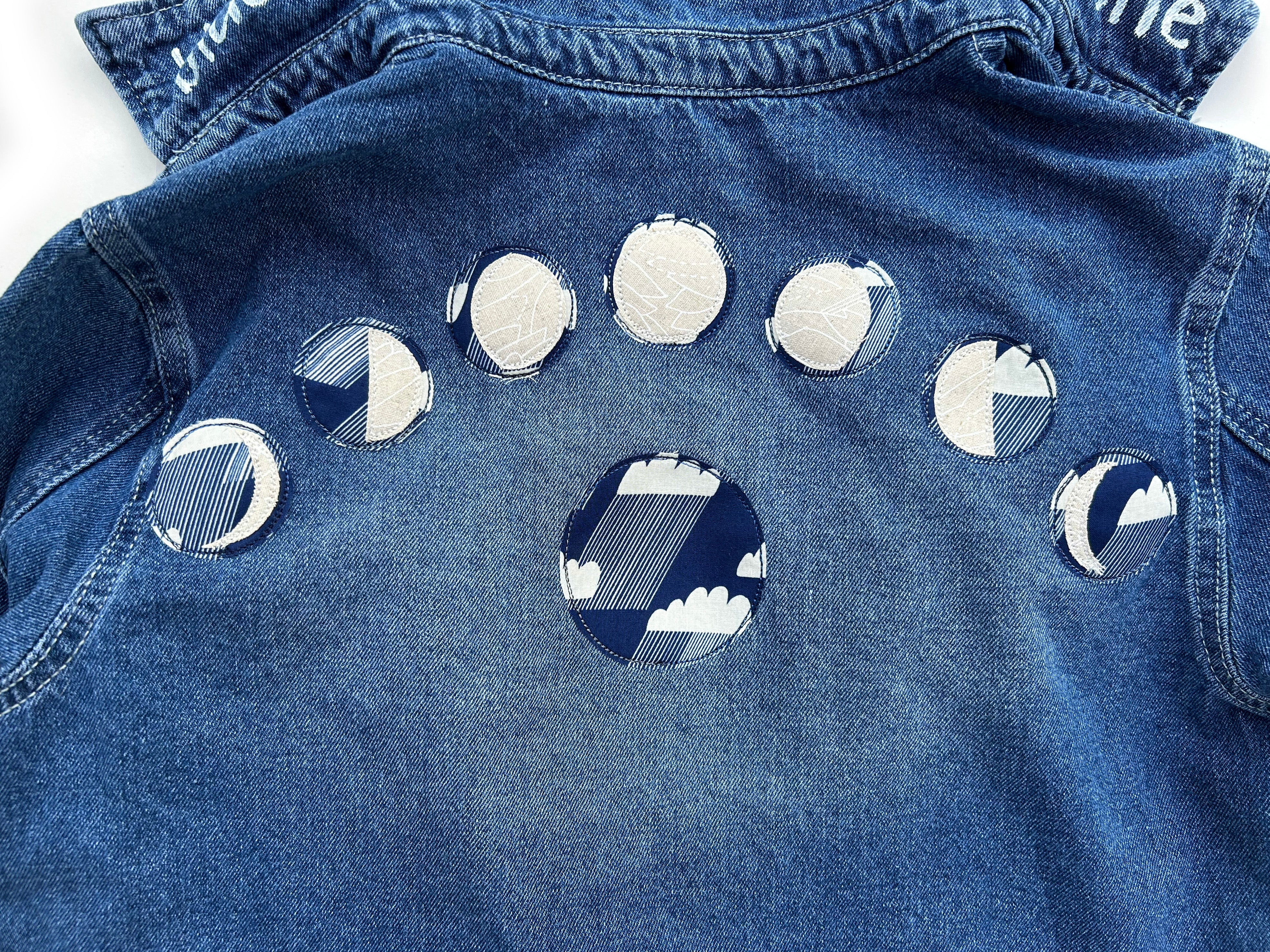 women's machine appliquéd upcycled denim shacket: no longer alone, moon phases