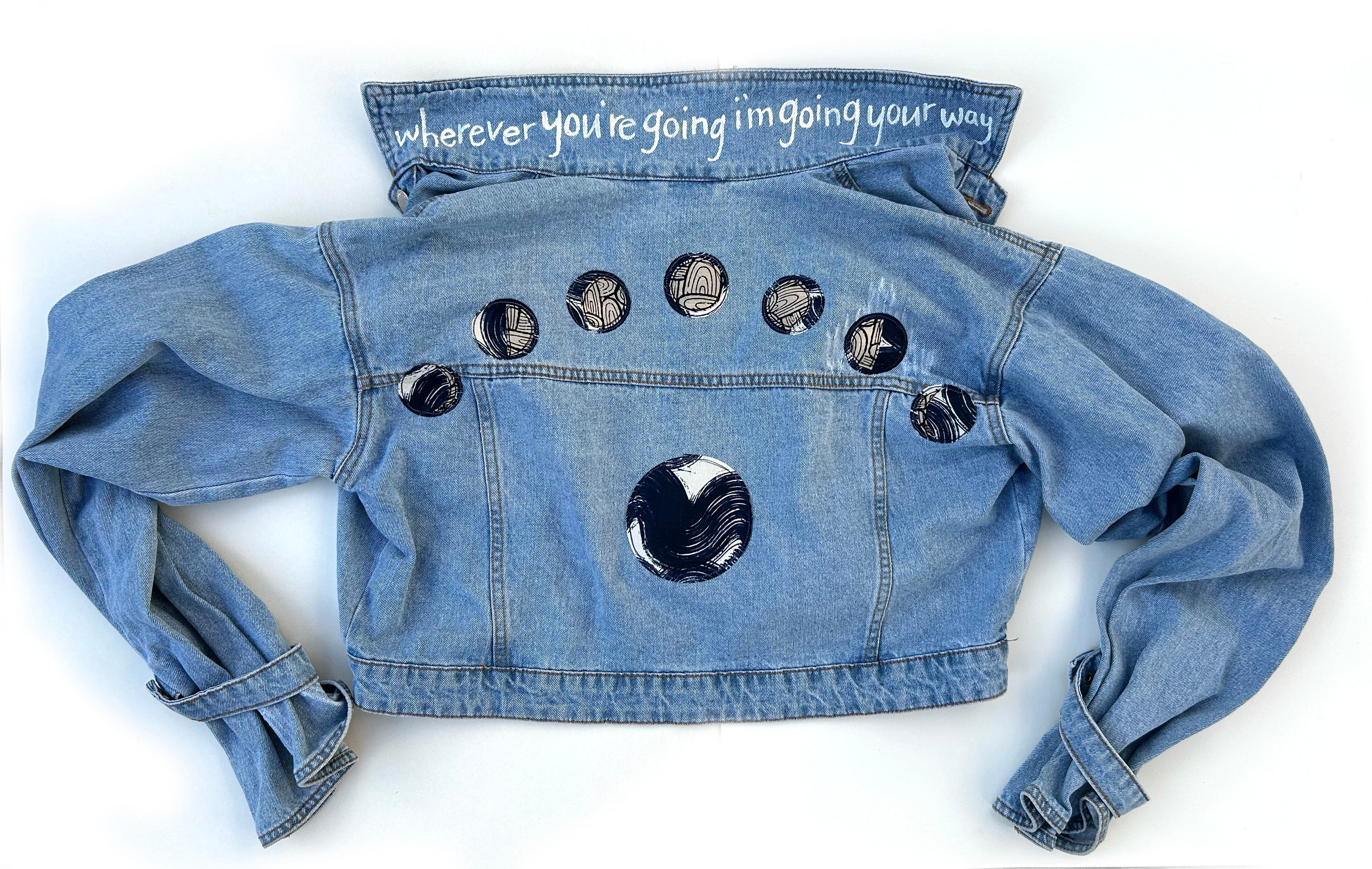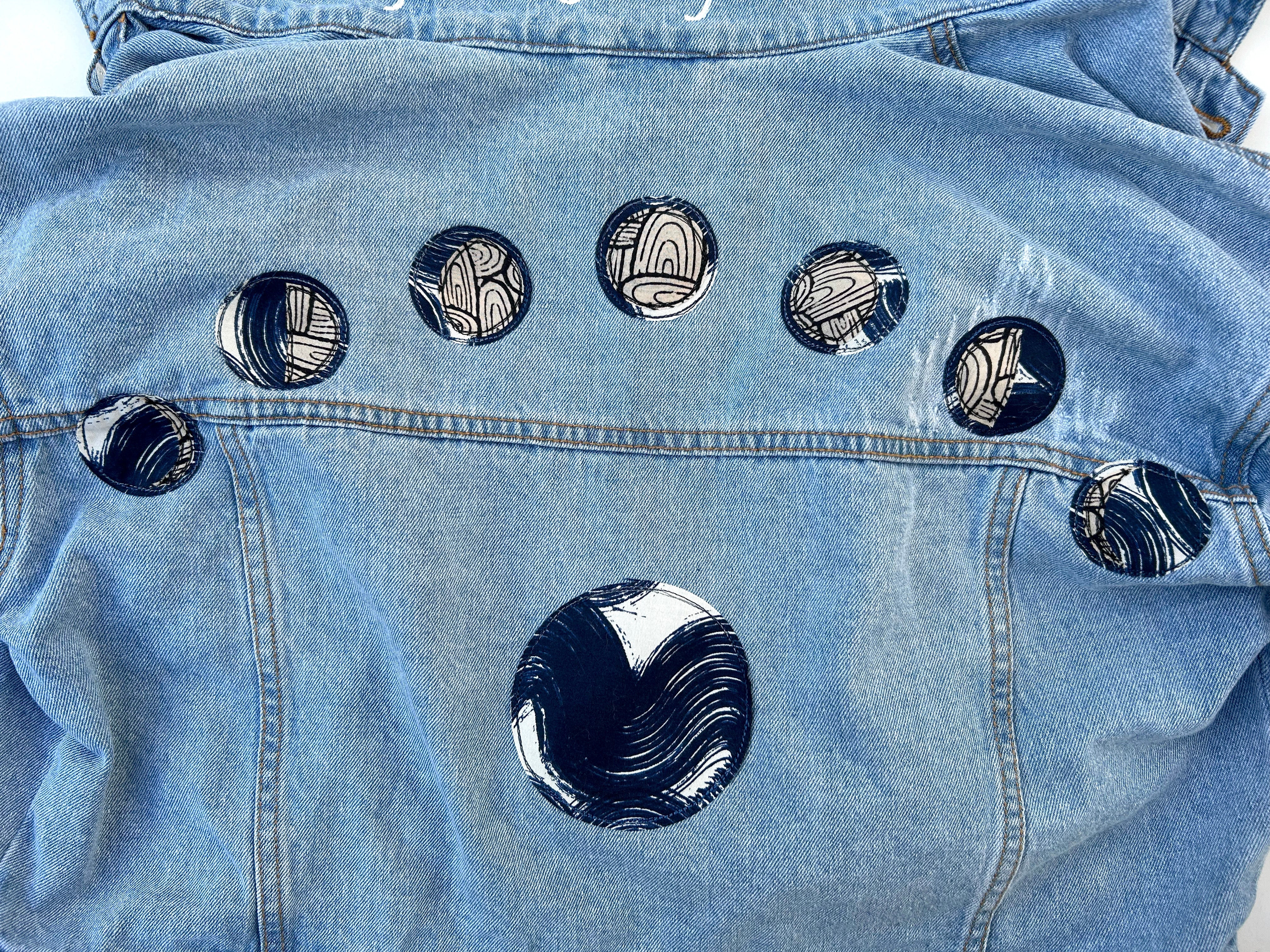 women's machine appliquéd upcycled denim jacket: I'm going your way, moon phases