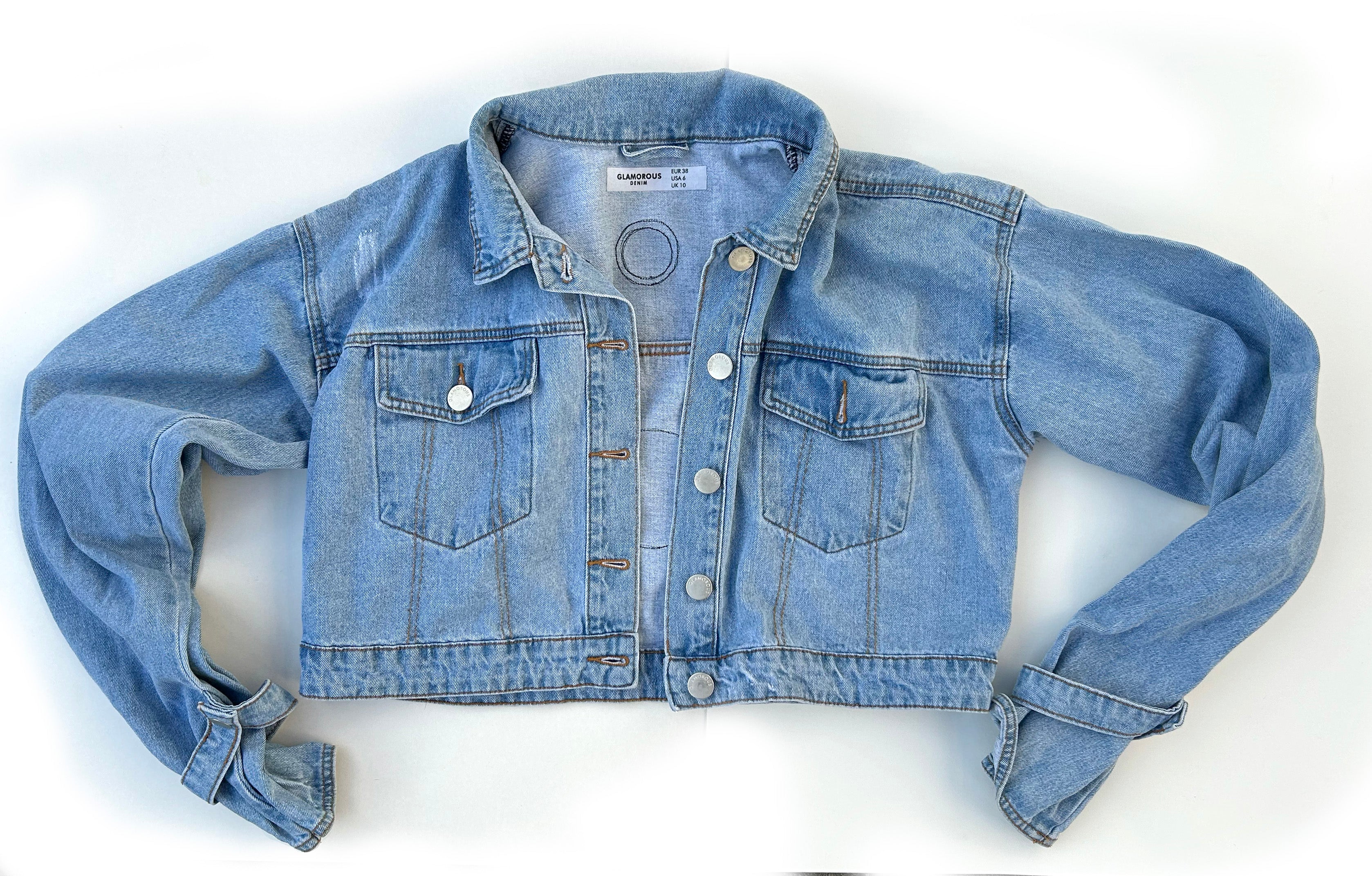 This is an upcycled Glamorous Denim jacket, size EU 38, US 6. It is a light wash in a cropped style with some unique wrist gathering snap ties. There are two top load breast pockets and a button closure. It is 100% cotton. The back features machine appliquéd phases of the moon in natural, black, white, and blue fabrics. A popped collar reveals the phrase "Wherever you're goin' I'm going' your way" (Moon River/Johnny Mercer).