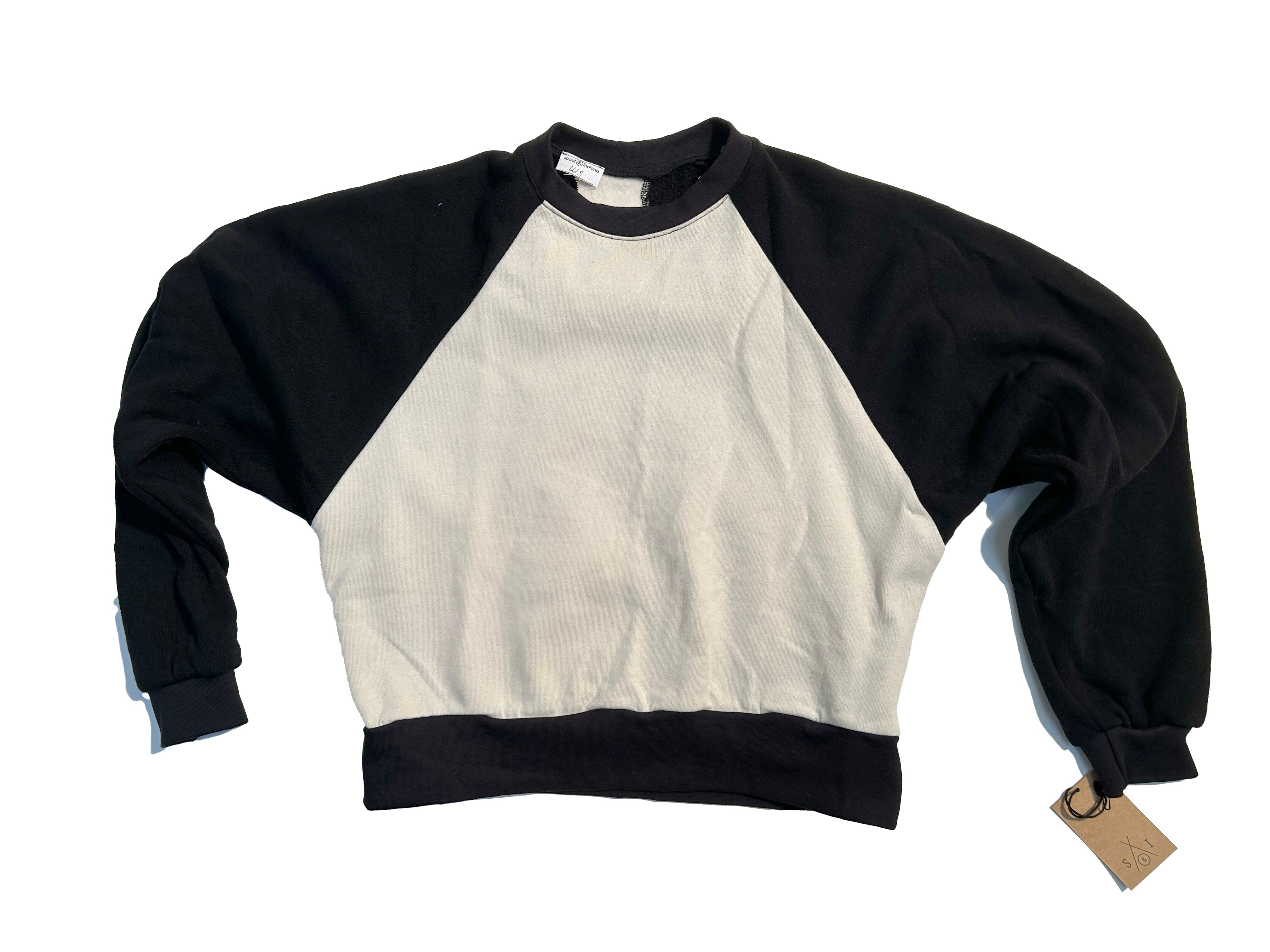 We hand patterned, cut, and sewed this S&I exclusive design to be comfy and cute. The raglan kimono sleeves make give it a loose and oversize feel, while the body is a cropped style that balances it out. This size small has a tan body in the front (split black and white in the back for an asymmetric look), black sleeves, and black rib knit collar, cuffs, and waistband.