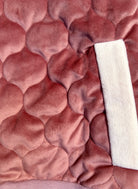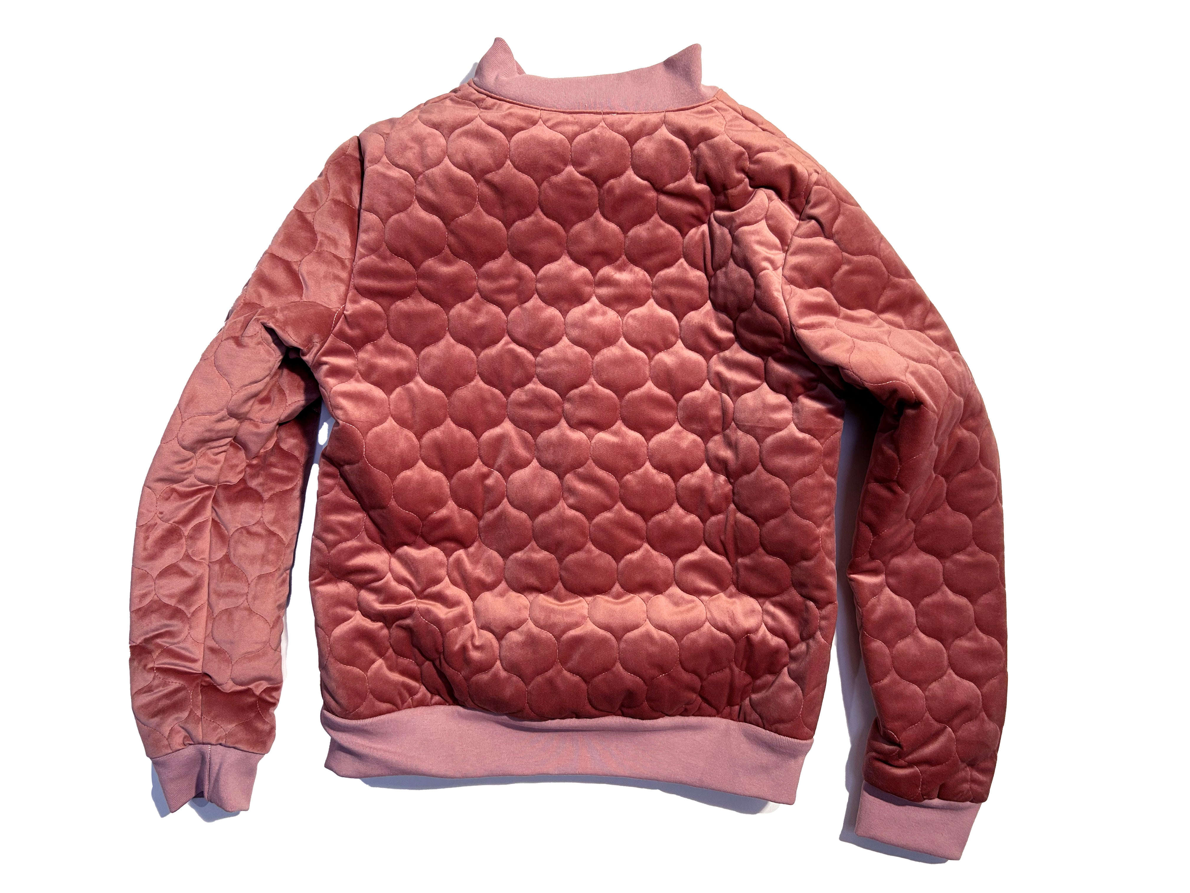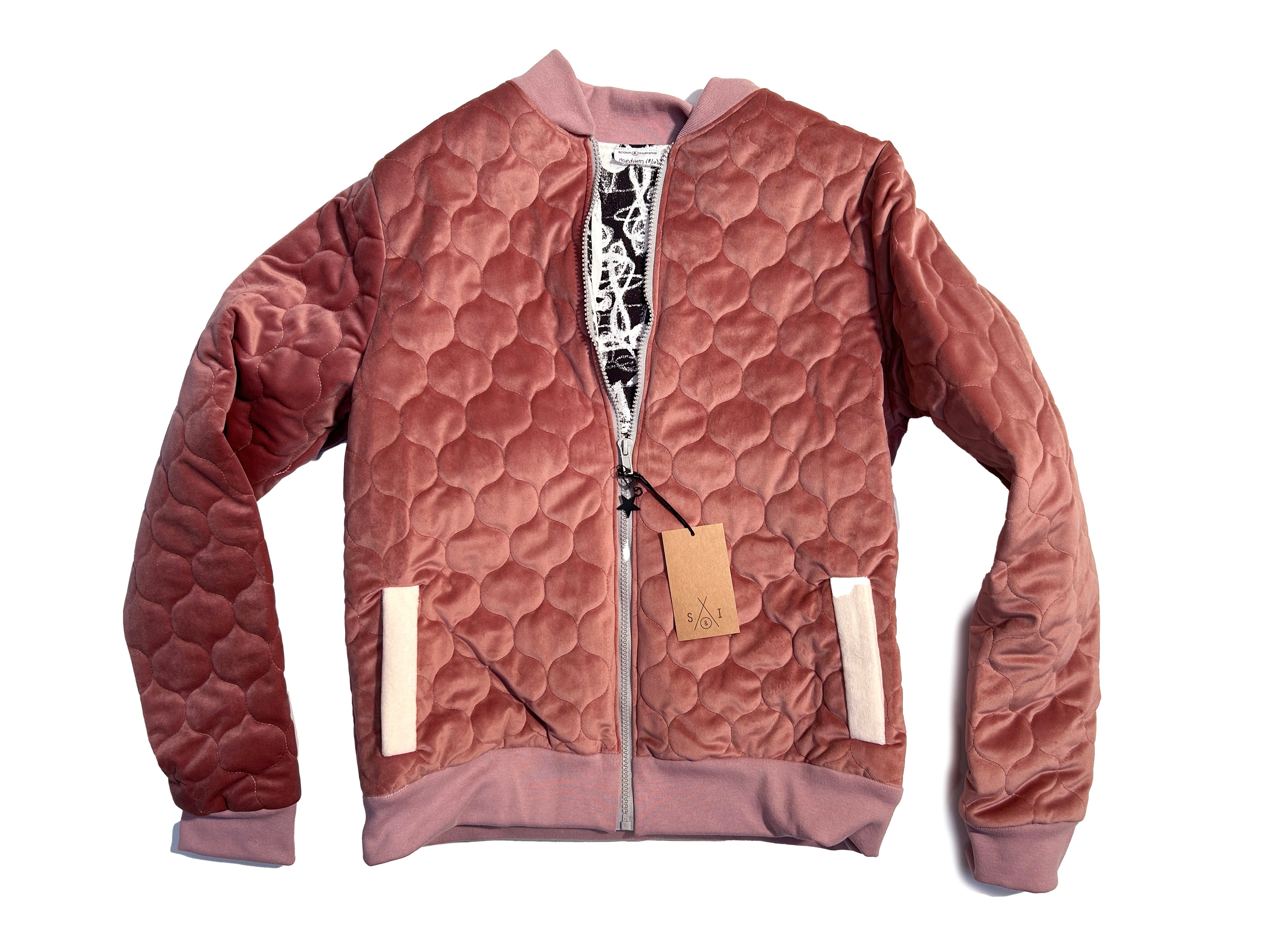 This bomber jacket is made of quilted velvet/velveteen type fabric. The jacket is lined with a cotton jersey with a black/white abstract graffiti/sketch design. It has two side load pockets, elastic at the cuffs, and a zipper closure with a zipper pull (star zipper pull for size medium 8/10, boombox zipper pulls for size XS 0/2 and S 4/6).