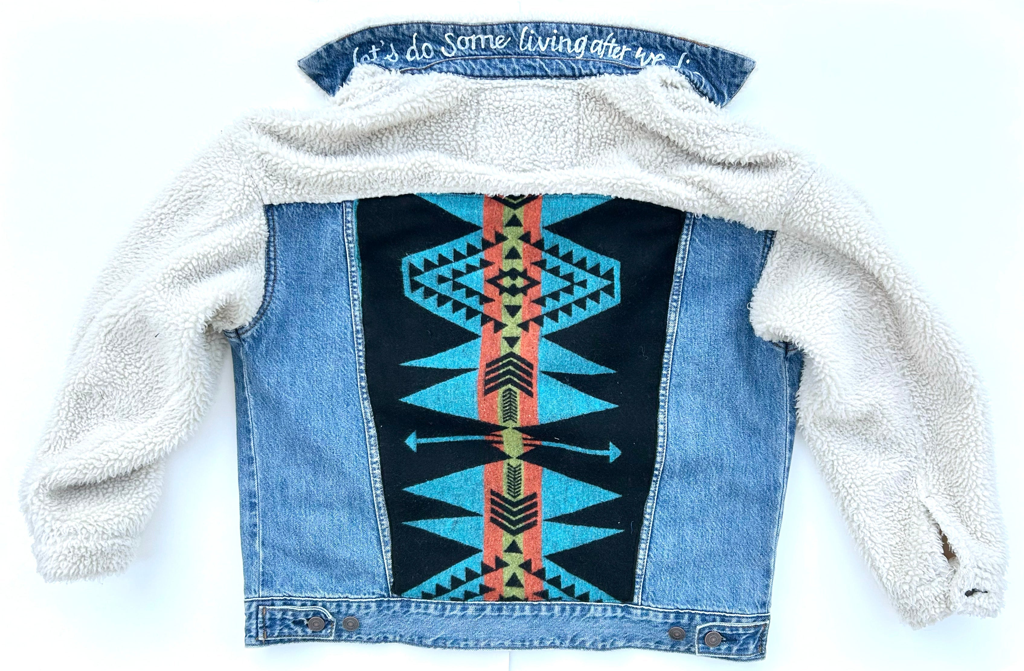 This is an upcycled American Eagle size S denim jacket with faux shearling details on the back and sleeves. It is a mid-wash and a relaxed fit. The faux shearling is 100% poly and it's inside lining is as well; the denim parts are 100% cotton. The jacket has two top load pockets, two side load pockets, and a button closure. The back features an upcycled remnant from a Southwestern wool blanket. A popped collar reveals the phrase 'let's do some living, after we die' (Rolling Stones) in a modern hand painted font.
