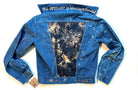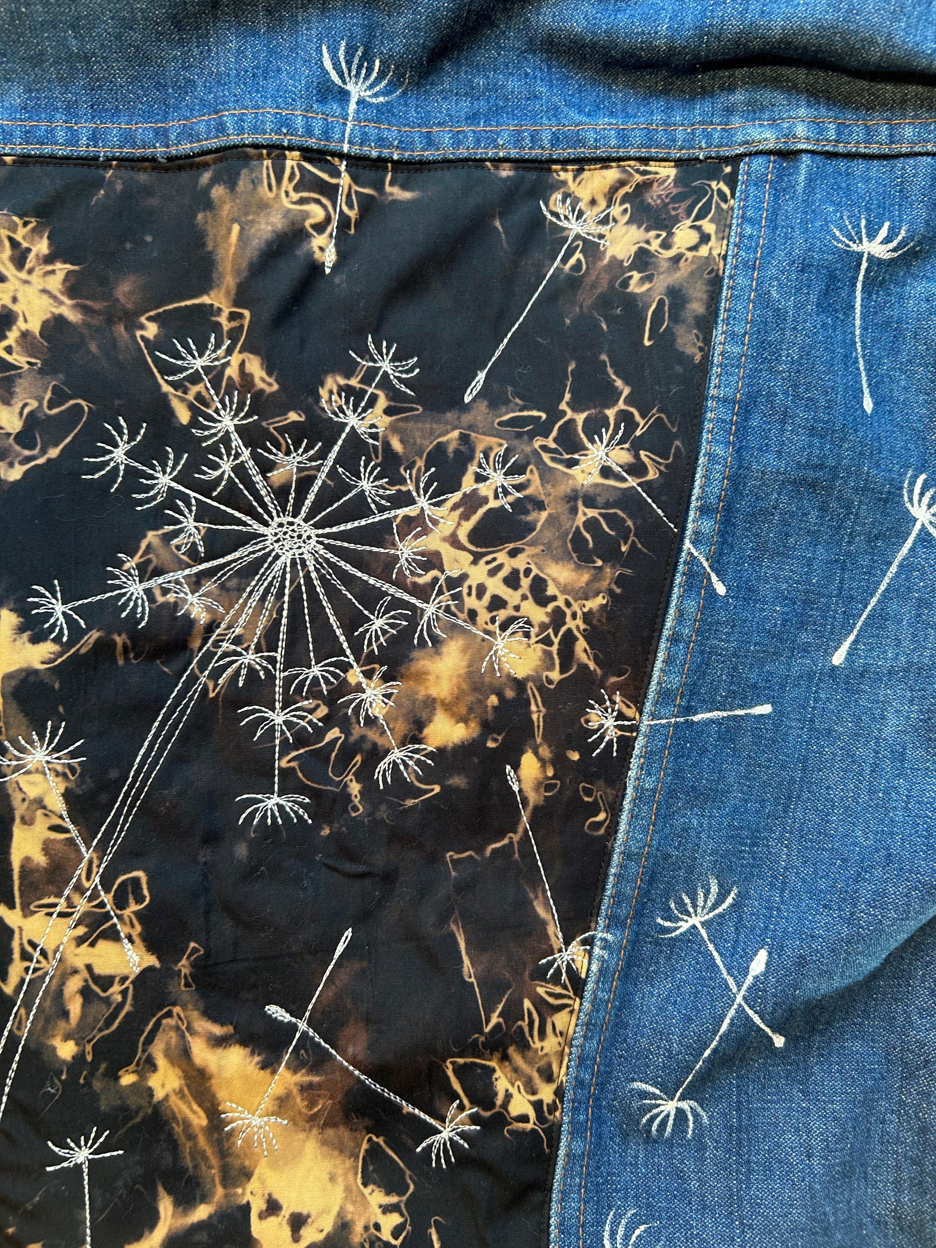 women's upcycled thread painted denim: batik dandelion seeds