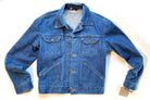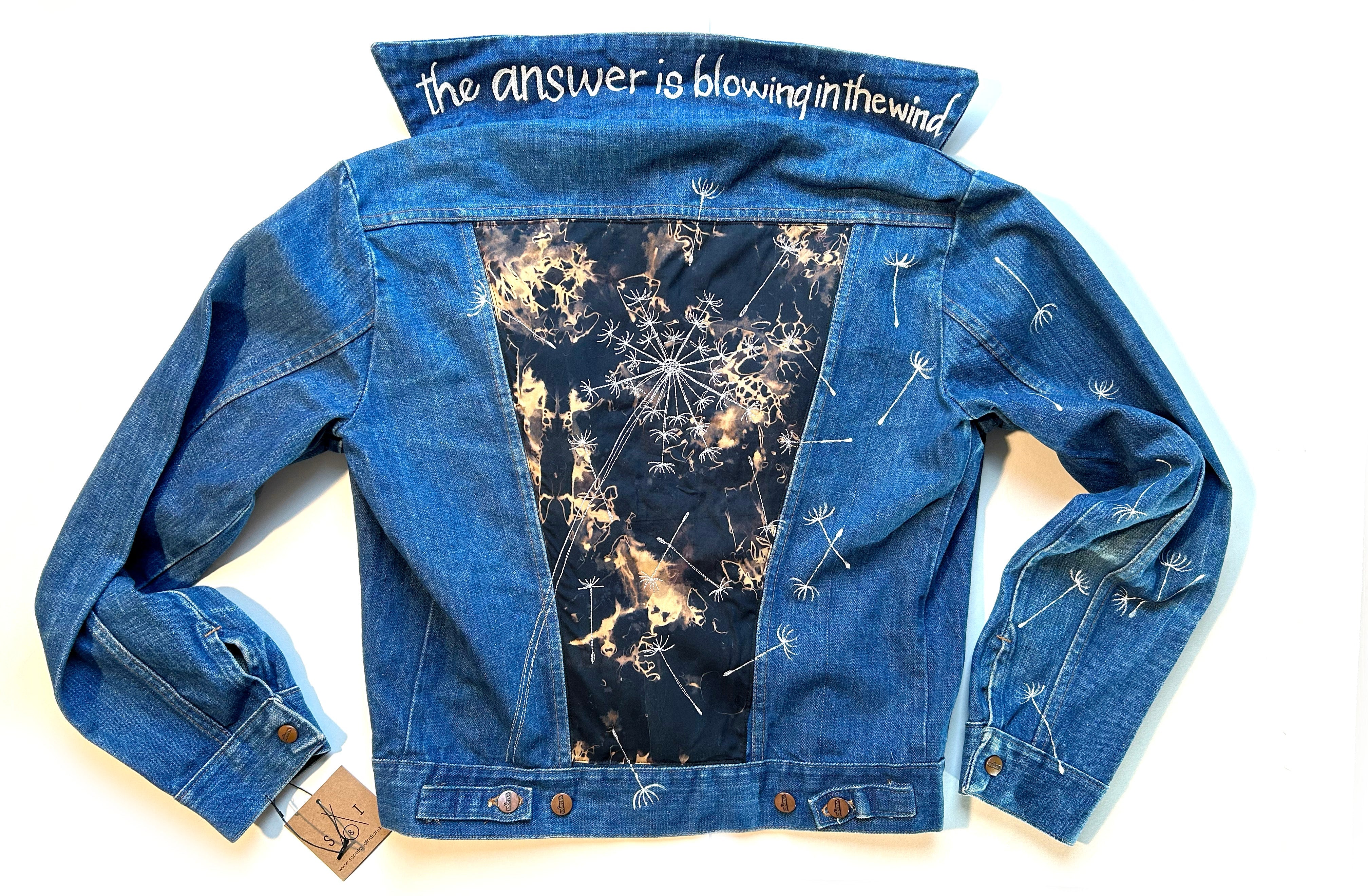 This is a vintage Wrangler denim jacket, size 40. It was sourced at a local vintage market here in Stuttgart, Germany. The jacket is a medium wash with two top load breast pockets and two side load pockets; it feels like it is 100% cotton, but there is no tag indicated fabric makeup. It is a classic style and fit with button closure. The back features a thread painted dandelion on a black/brownish batik fabric. The seeds of the dandelion are painted as they come off the fabric panel, down the back and right arm of the jacket. A popped collar reveals the phrase 'the answer is blowing in the wind' in a modern hand painted font.