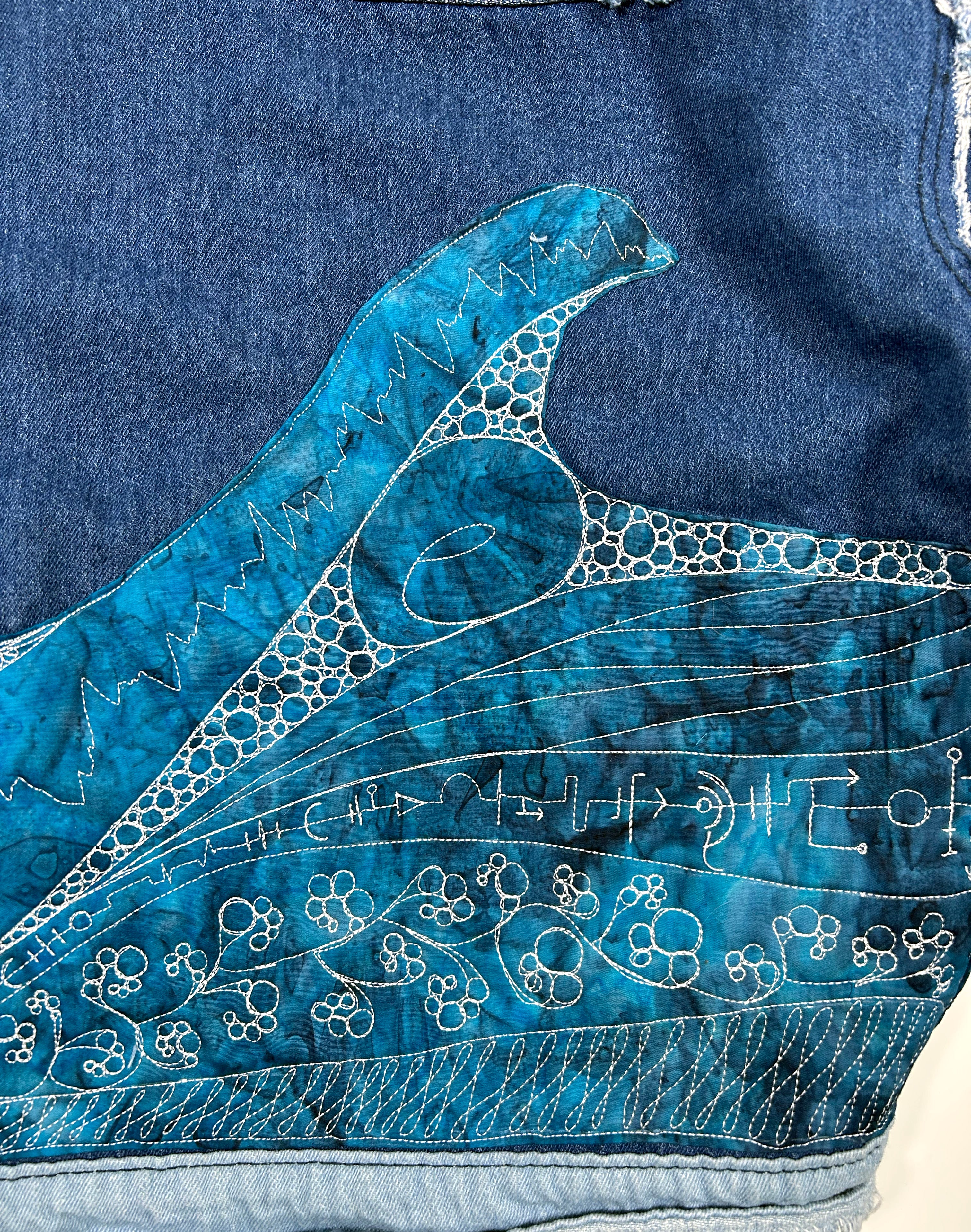 • Thread painted wildflowers in a blue rayon thread with metallic flecks