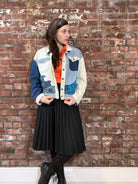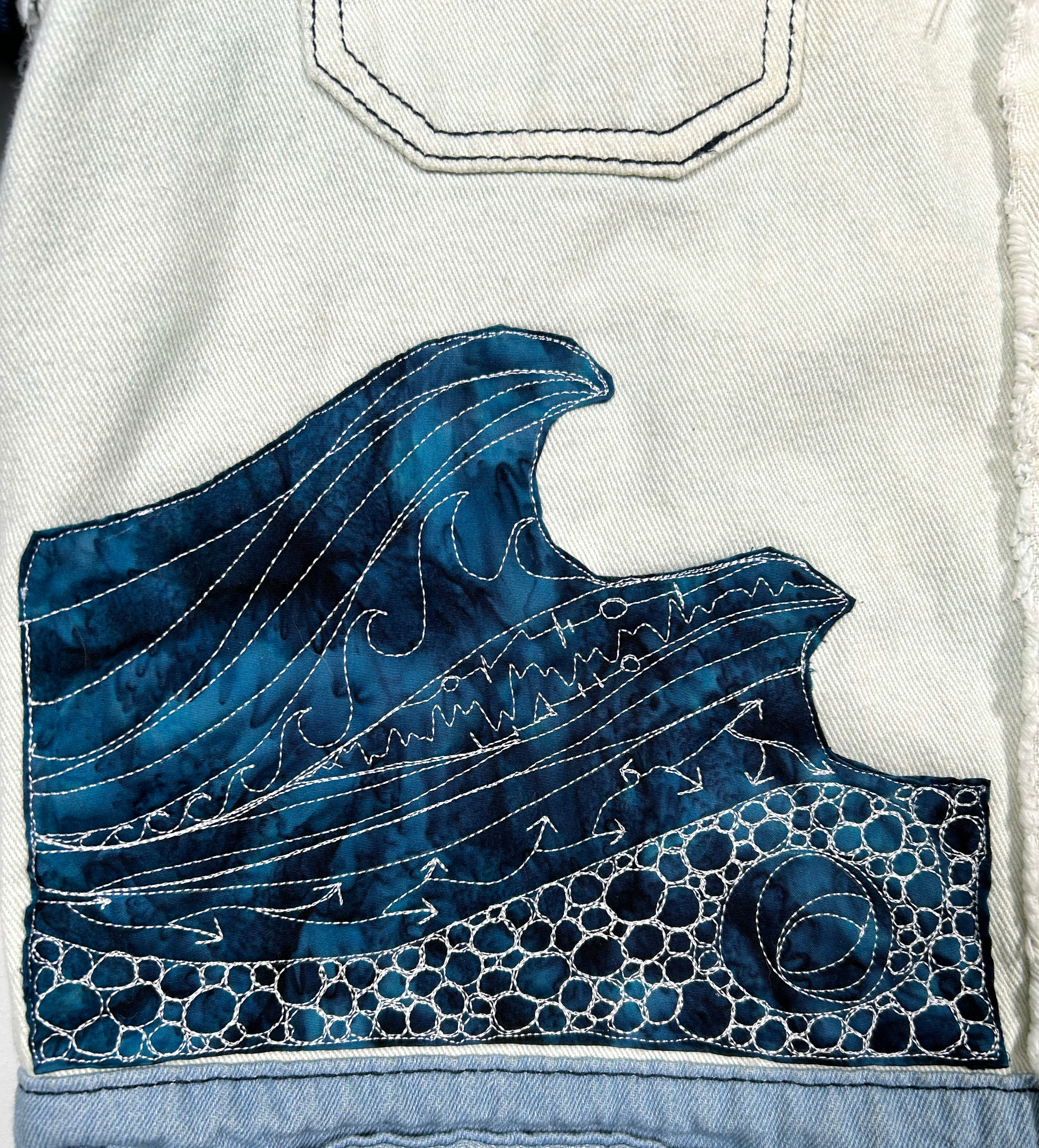 This is an upcycled women’s MelRose Market jacket, size L. It is a medium wash with a classic fit. The sleeves have an interested gathering around the biceps making it just a little different from your classic jean jacket. There are two top load breast pockets, two side load pockets, and a button closure. It is 79% cotton, 20% polyester, 1% elastane. The back panel features a linen blend in a light tan/natural color print with thread painted wildflowers in a blue rayon thread with metallic flecks.